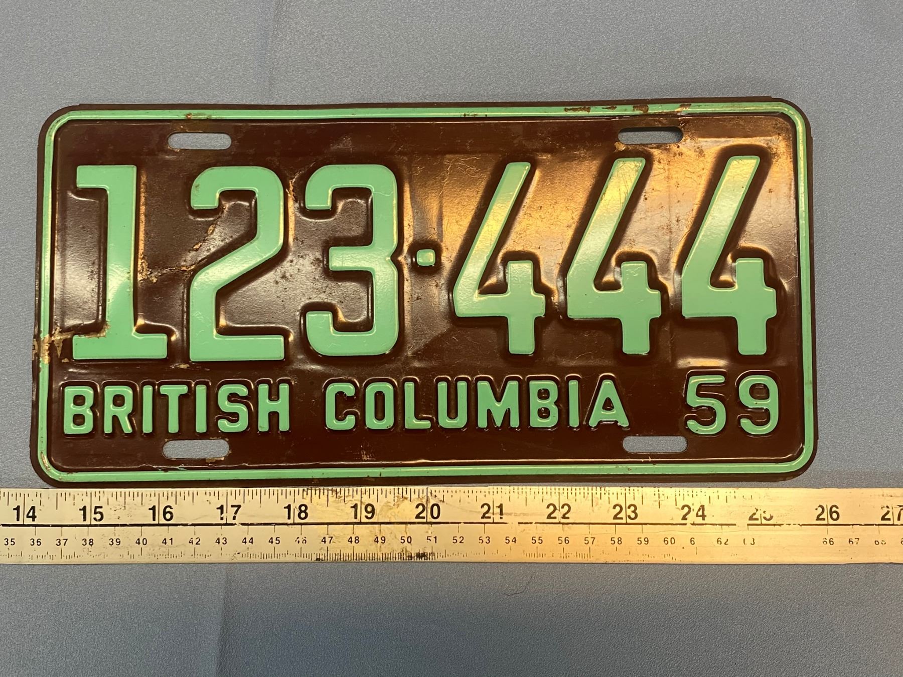 1959 BC LICENSE PLATE - 17% BUYER FEE. PAYMENT PROCESSED THROUGH LIVE AUCTION WORLD ( VISA OR MASTER CARD ) PICK UP SATURDAY, OR TUESDAY
