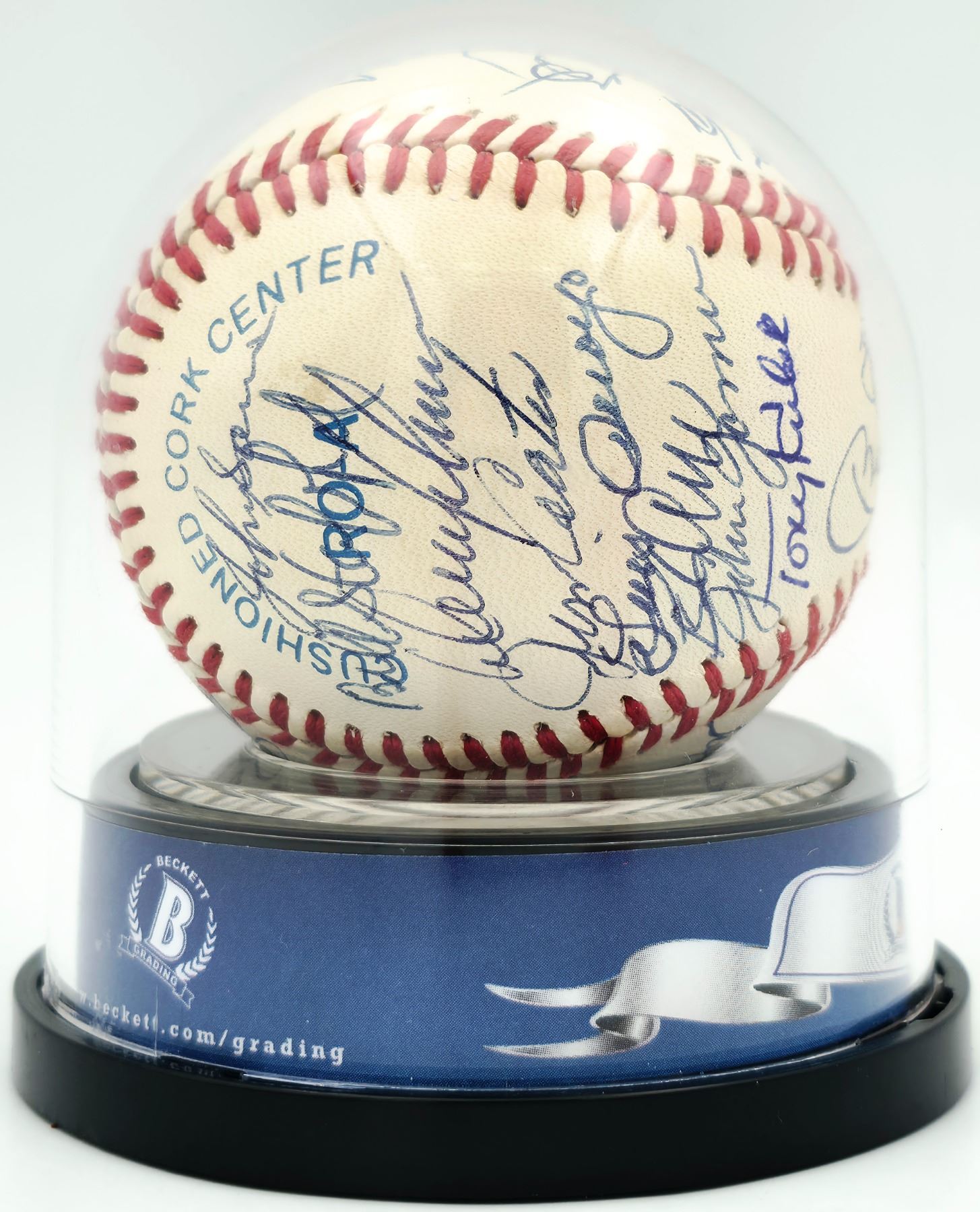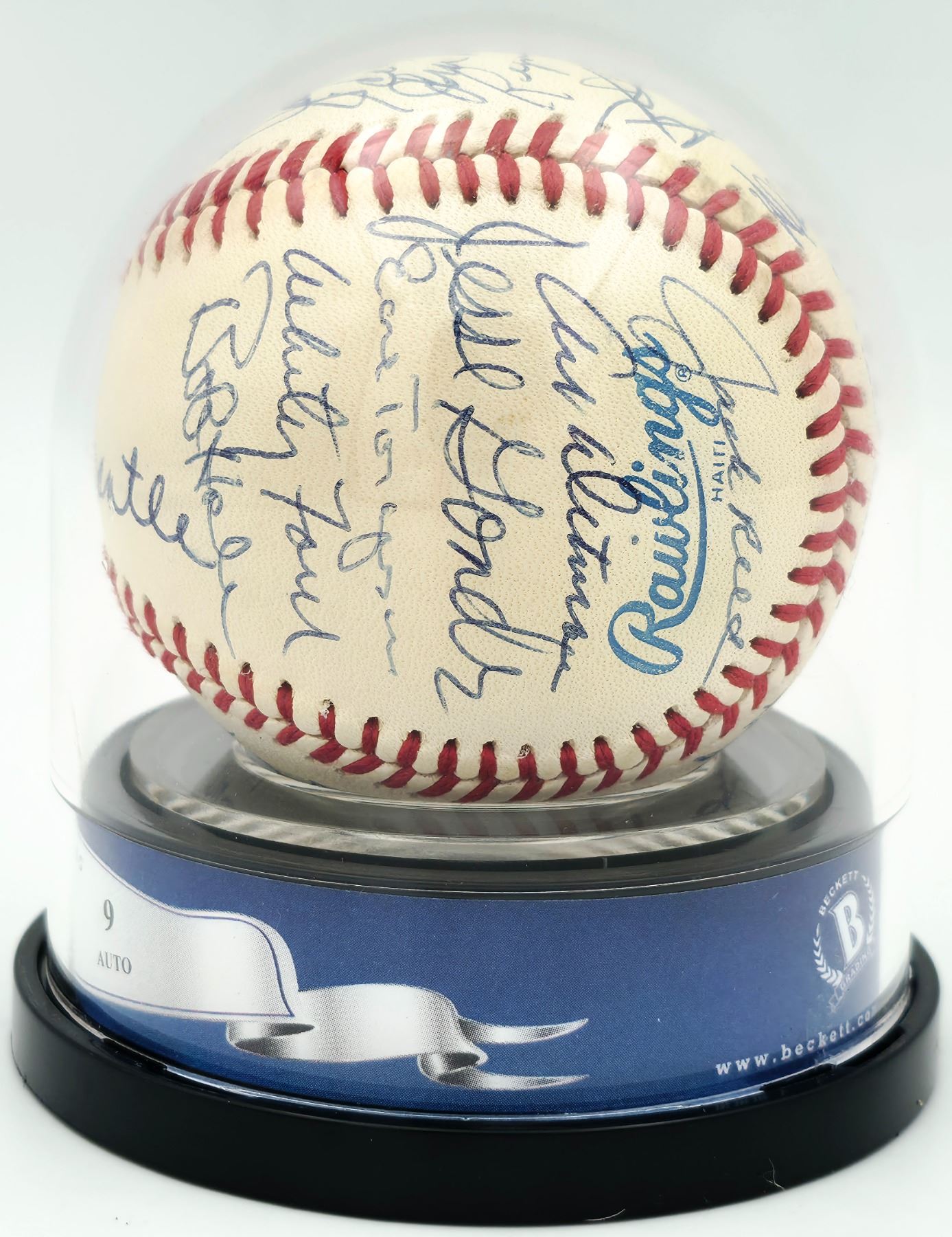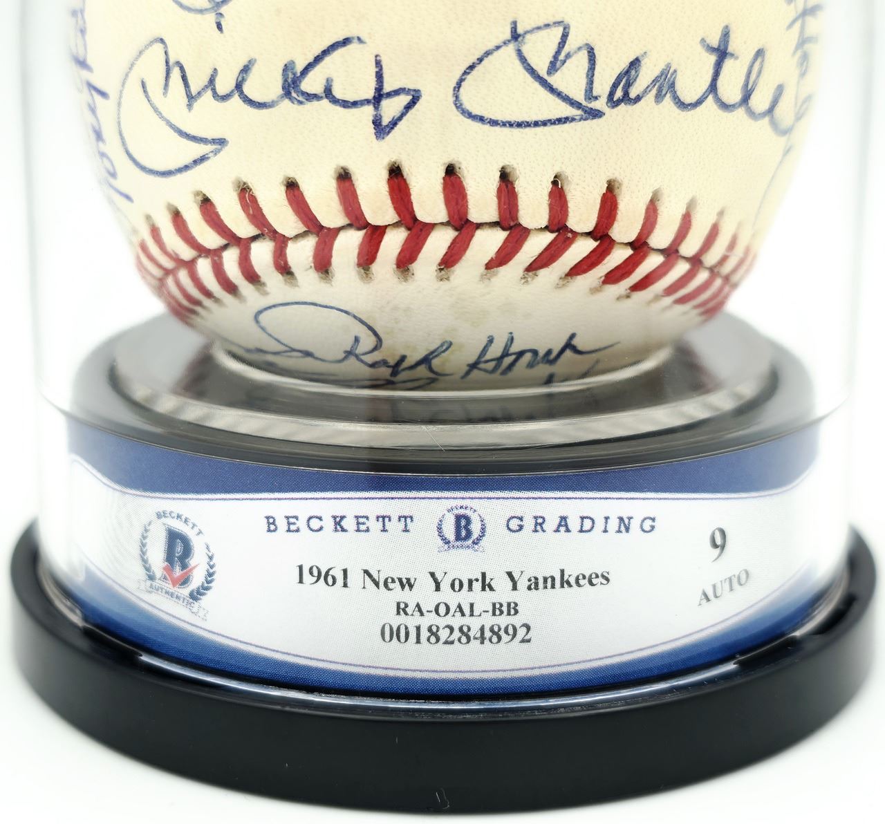 This is an Official American League Baseball that has been hand signed by 34 members of the 1961 New York Yankees Team. The condition of the signature was graded a Mint 9 by Beckett BAS. Signatures include Mickey Mantle, Yogi Berra, Whitey Ford, Tony Kubek, Ralph Houk, Luis Arroyo, Bobby Richardson, Moose Skowron, Hector Lopez, Al Downing, Tom Tresh, Clete Boyer, Ralph Terry, Billy Gardner, Bob Cerv, Jim Coates, Bill Stafford, Ryne Duren, Johnny Blanchard, Hal Reniff, Rollie Sheldon, Johnny James, Art Ditmar, Bud Daley, Jack Reed, Johnny Sain, Bob Turley, Bob Hale, Deron Johnson, Jesse Gonder, Earl Torgeson.