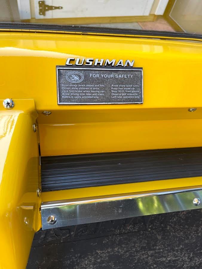 Brand new fully restored - 1965 Cushman 3 wheel electric golf cart w/ charger, air-ride suspension, aluminium checker, plate flooring, fold-down back deck, LED lighting, canary yellow