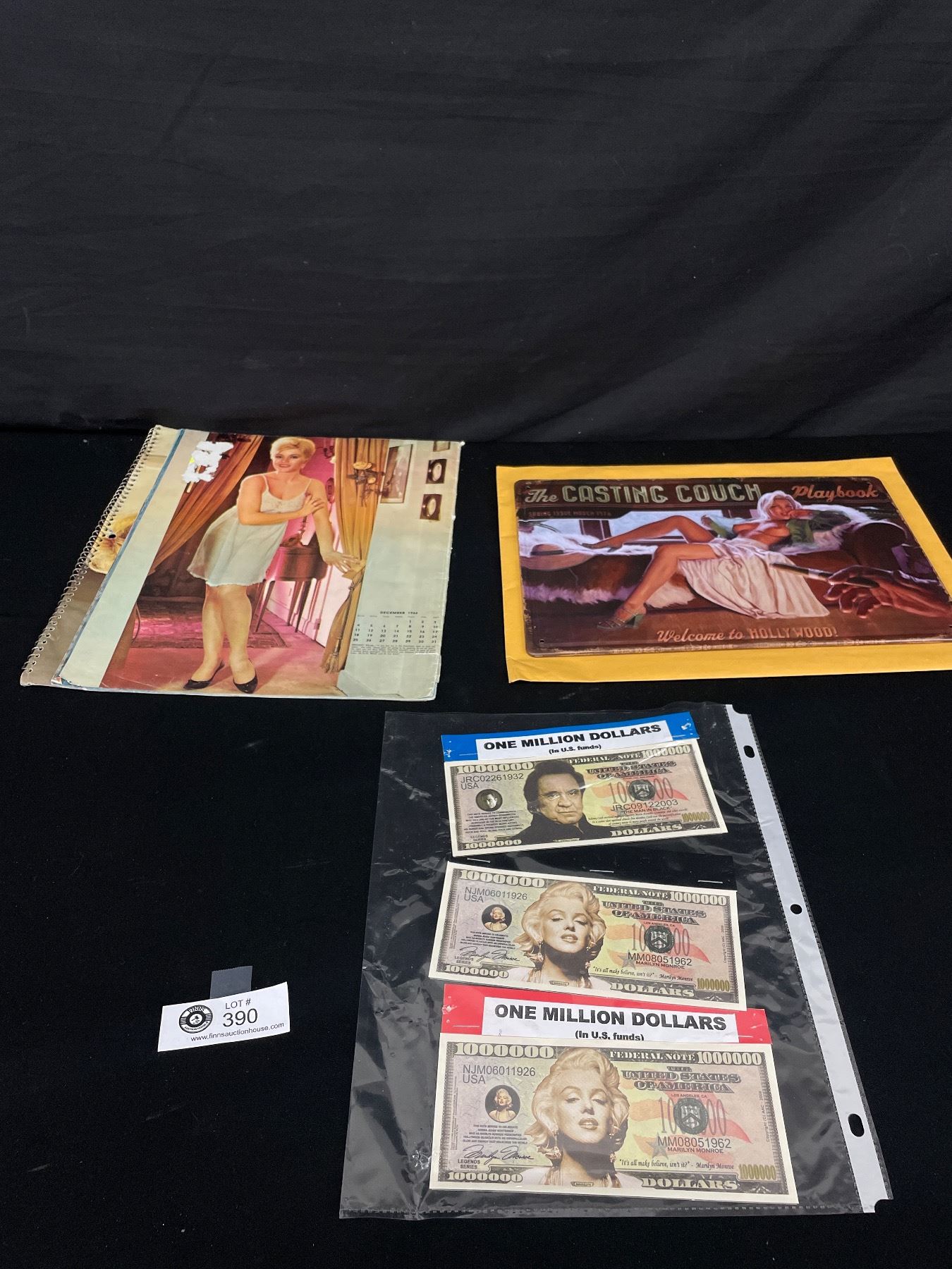 1966 Nudie Calander, Plus Casting Couch Tin Sign and Marilyn Monroe and Johnny Cash Money