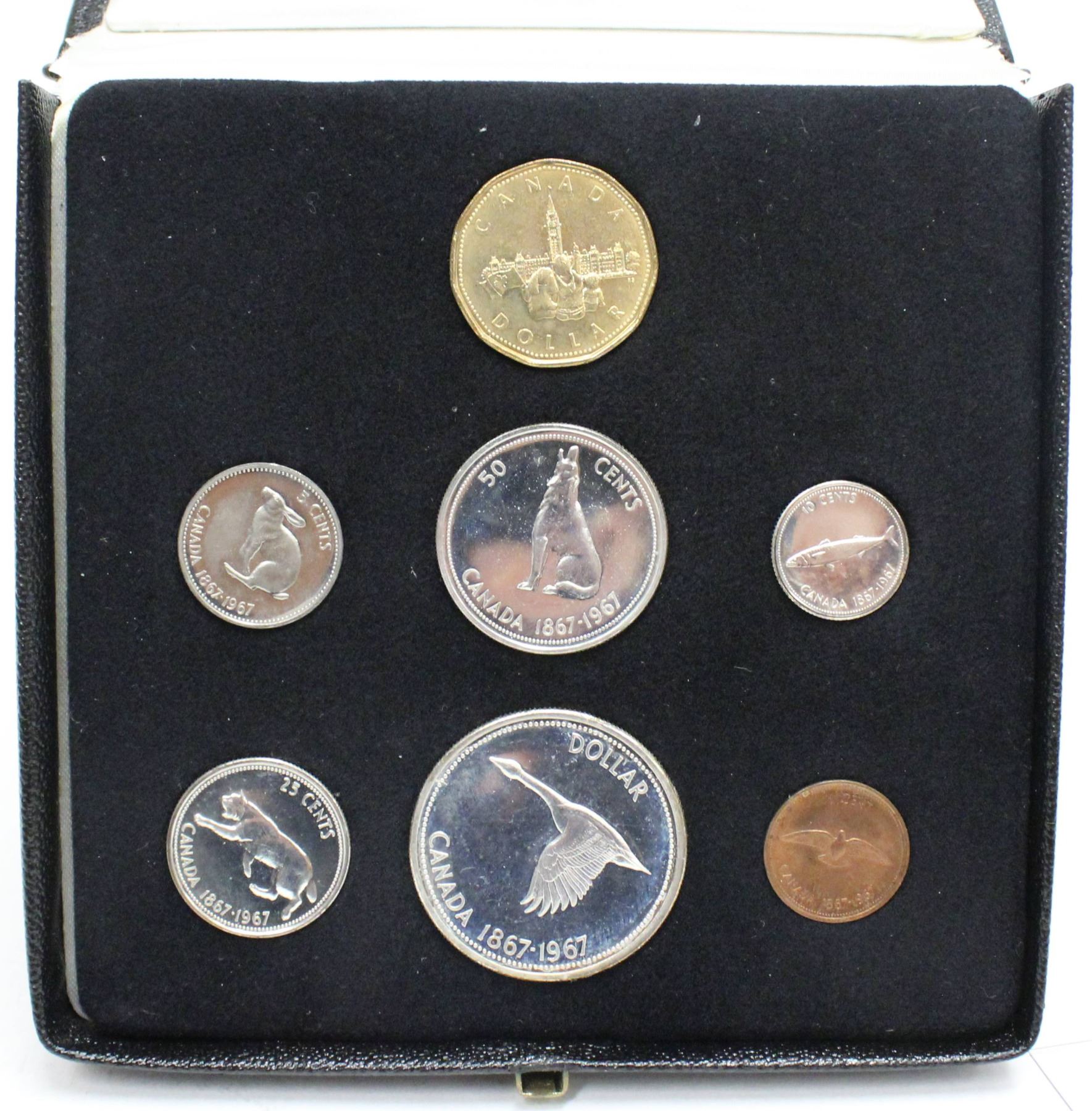 Uncirculated 1967 Canada Silver Coins Set Goose Dollar, Wolf Half, Lynx Quarter, Mackeral Dime, Rabbit 5 cent & Dove 1 cent Including 1992 Parliament Loonie Dollar, 1967 coins Collection with Leather Display Holder Case
