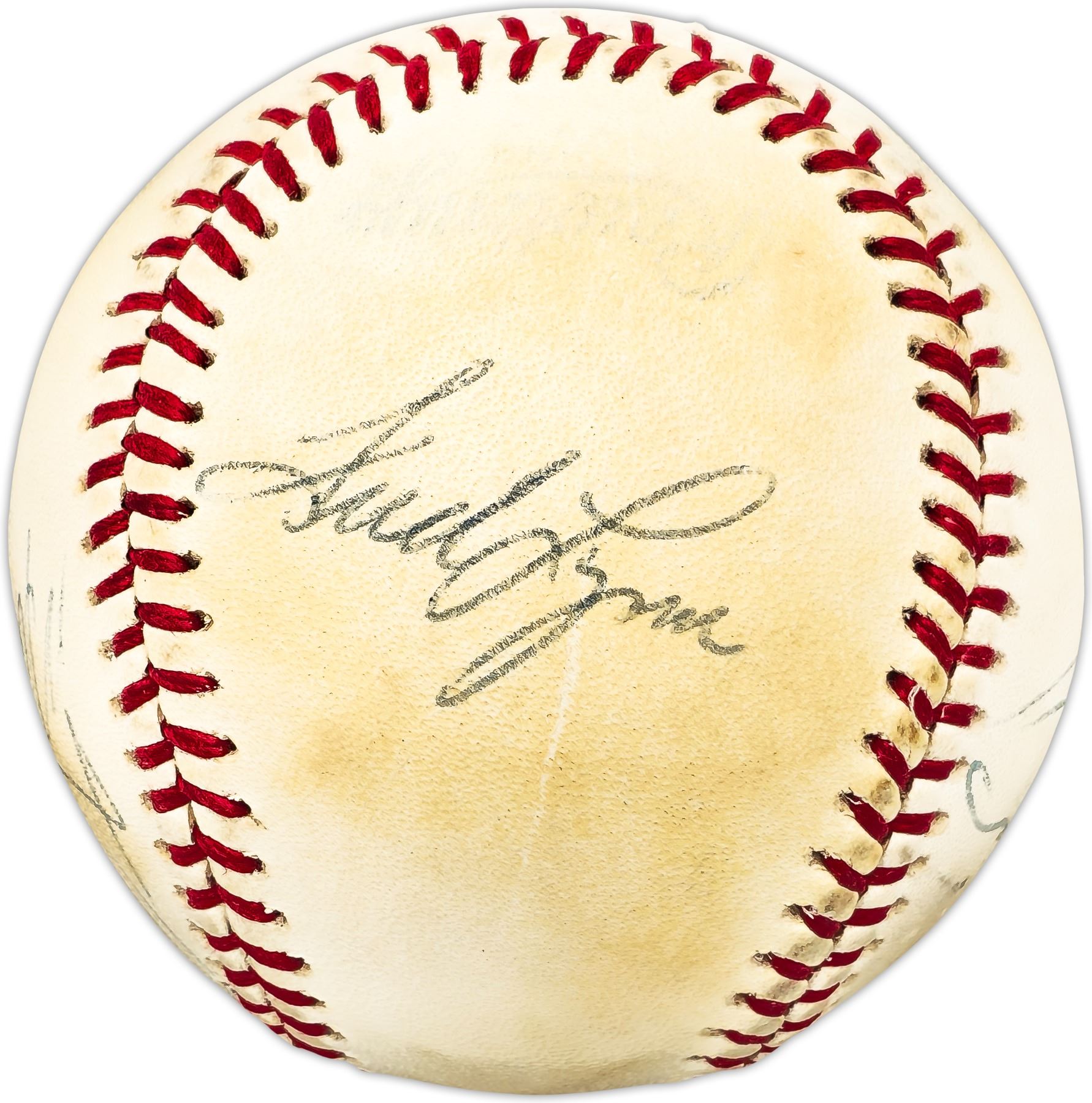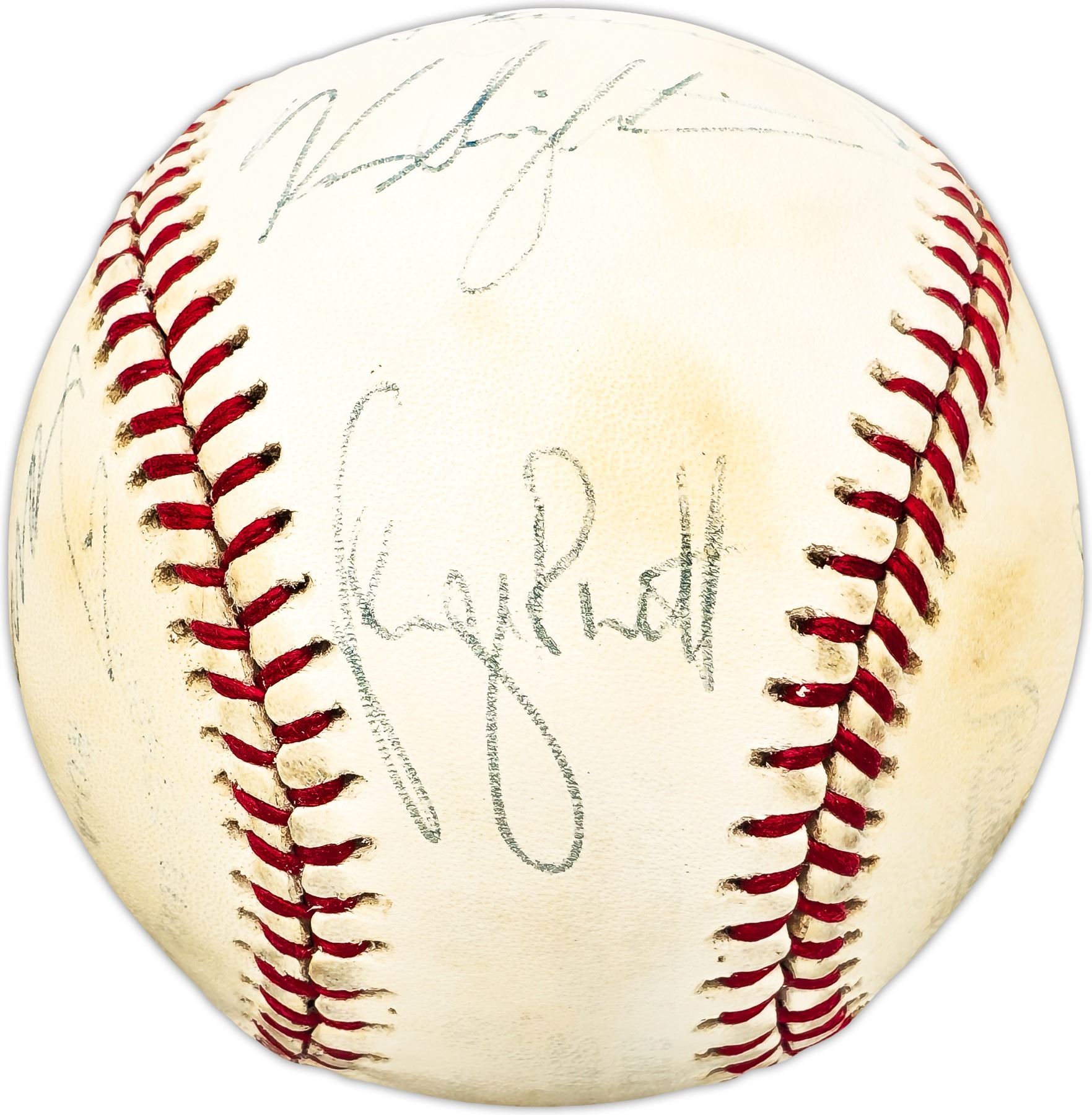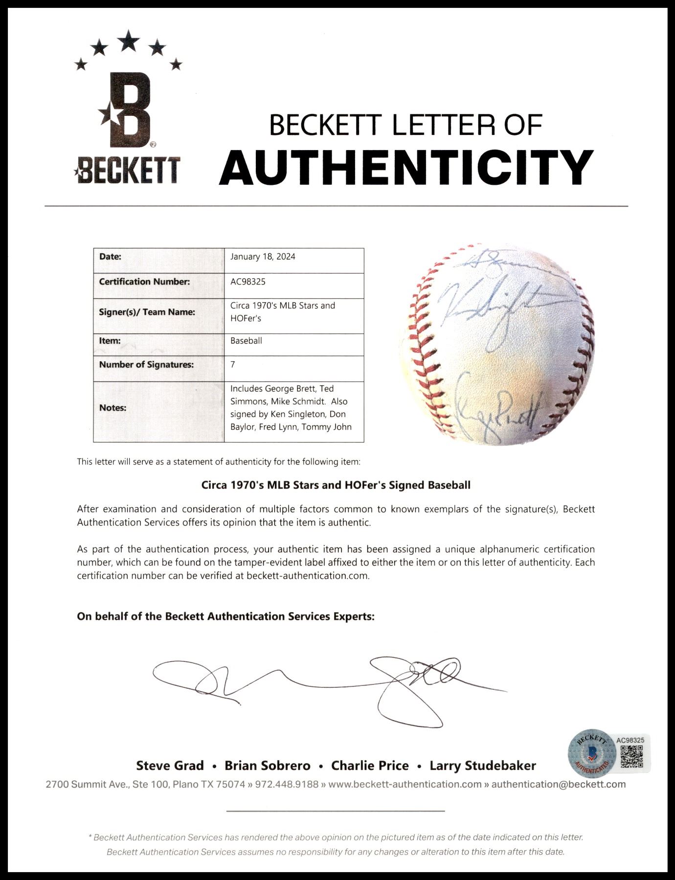 This is an Official American League Baseball that has been hand signed by George Brett, Ted Simmons, Mike Schmidt, Ken Singleton, Don Baylor, Fred Lynn, and Tommy John. This item has been certified authentic by Beckett Authentication
