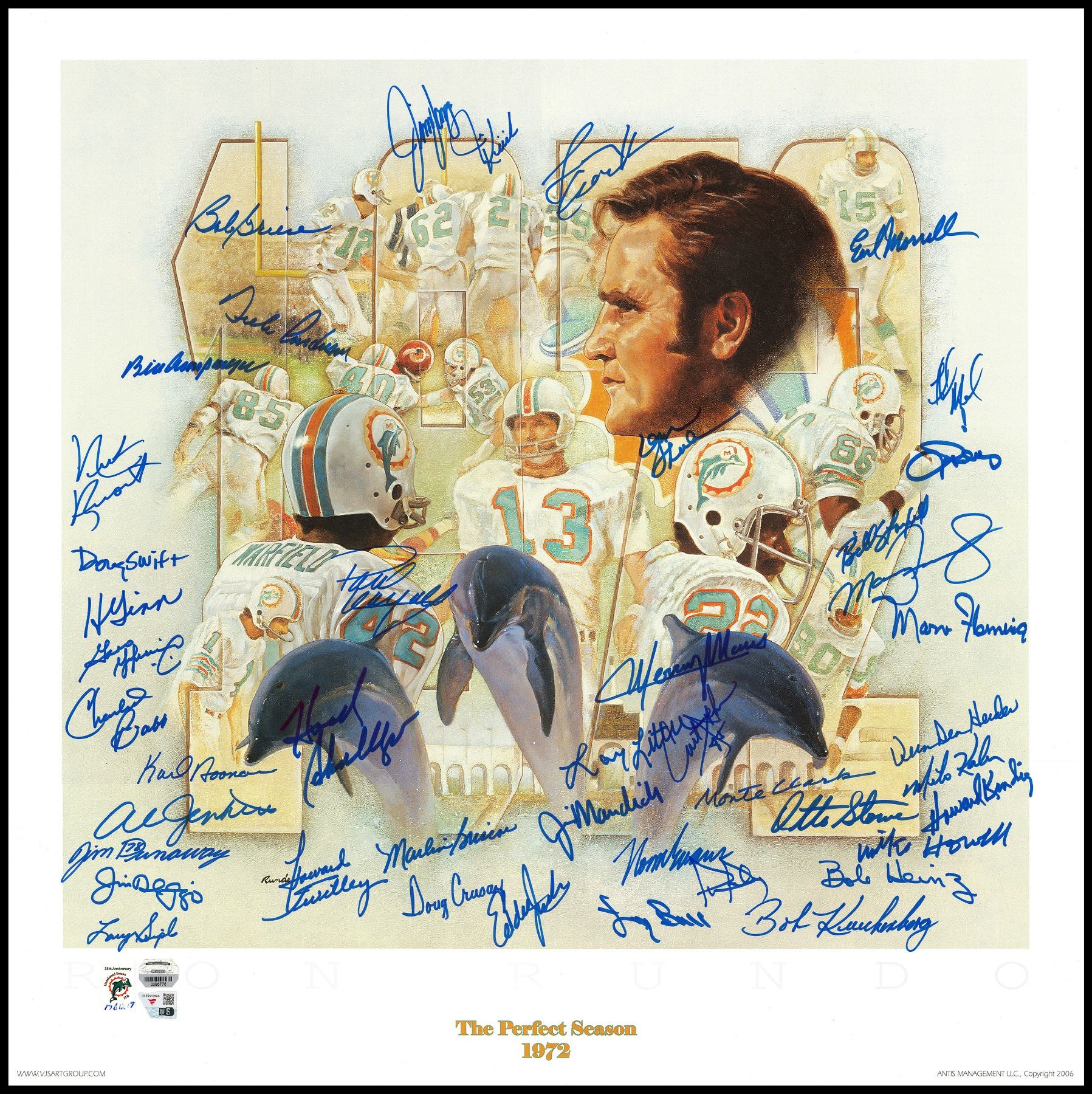 This is a 24x24 Lithograph Photo that has been hand signed by more than 40 members of the 1972 Miami Dolphins Perfect Season Team. The members that signed this item are Don Shula, Bob Griese, Larry Csonka, Paul Warfeild, Nick Buoniconti, Jim Langer, Larry Little, Garo Yepremian, Mercury Morris, Jim Kiick, Bob Kuechenberg, Bill Stanfill, Jim Mandich, Al Jenkins, Bill Arnsbarger, Bob Heinz, Charles Babb, Curtis Johnson, Dick Anderson, Doug Crusan, Doug Swift, Earl Morrall, Ed Jenkins, Howard Kindig, Howard Schnellenberger, Howard Twilley, Hubert Ginn, James Delgaizo, Jim Dunaway, Jim Kick, Jim Riley, Karl Noonan, Larry Ball, Larry Seiple, Lloyd Mumphord, Manny Fernandez, Marlin Briscoe, Marv Fleming, Mike Howell, Mike Kolen, Monte Clarke, Norm Evans, Otto Stowe, Tim Foley, and Vern Den Hereder.This is a limited edition item that has been serial-numbered #/217. Please note, signature locations may vary. There are minor dings/creases in this photo.