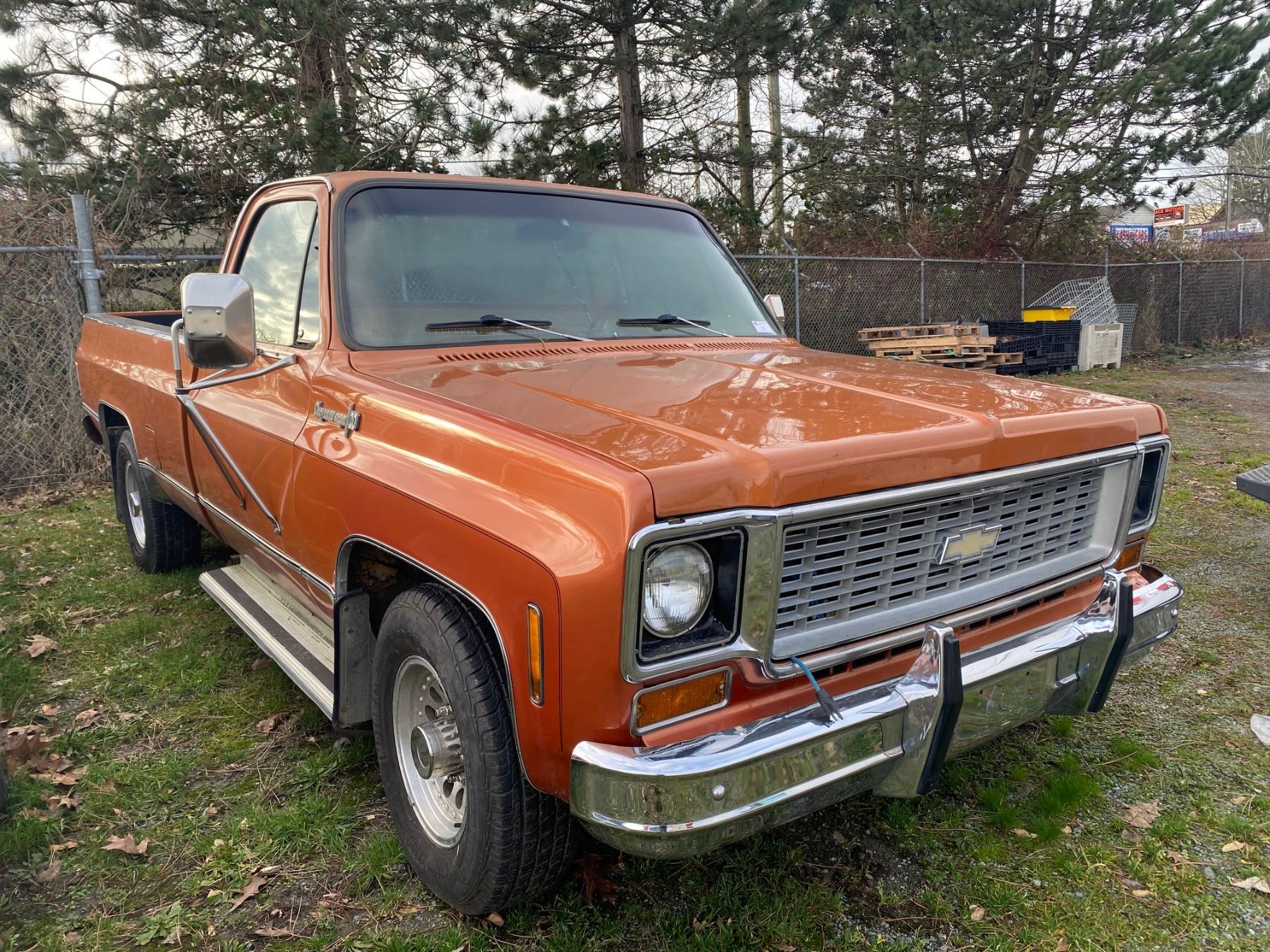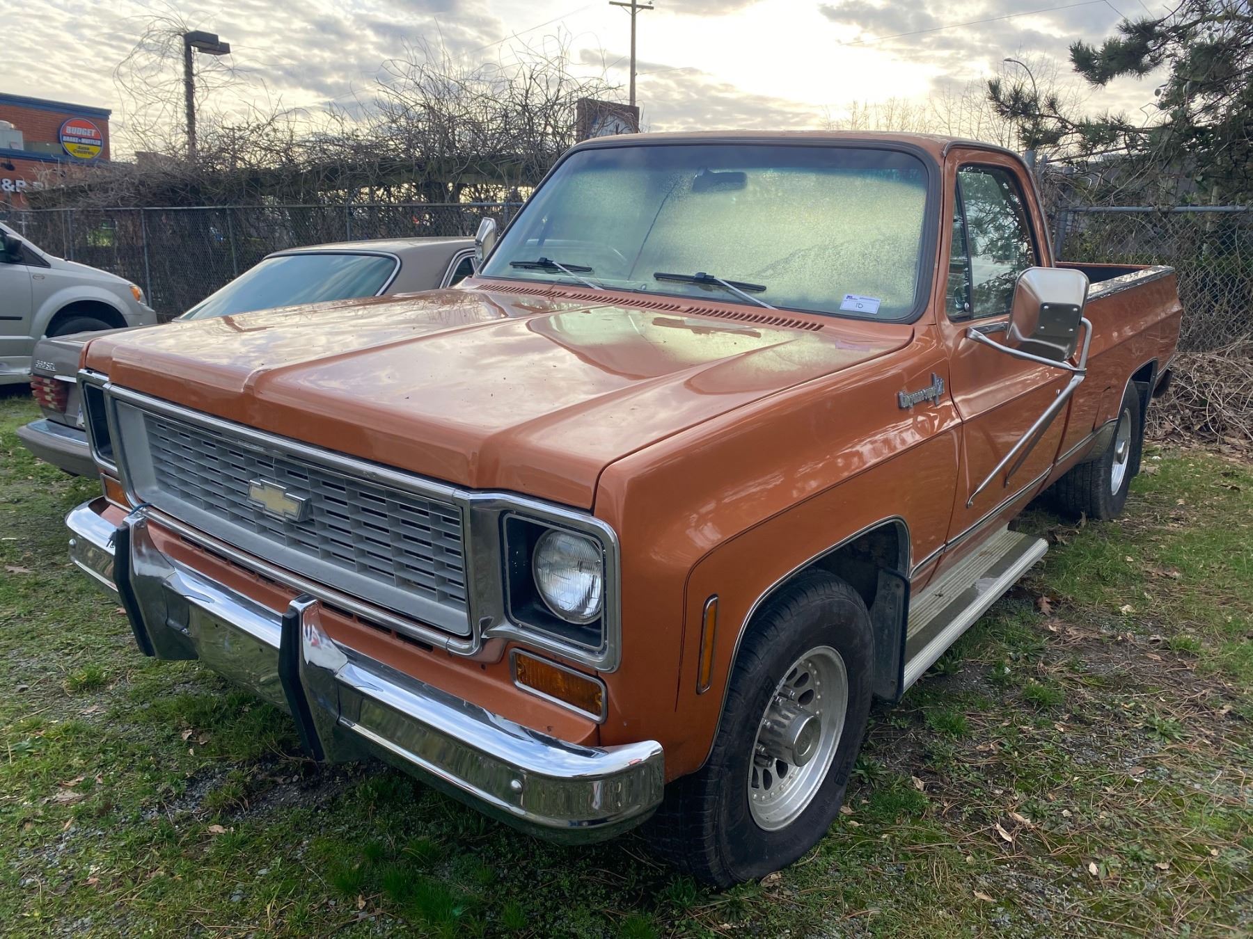 1973 CHEVROLET 2WHDR, CHEYENNE SUPER 20, ORANGE, GAS, AUTOMATIC, WITH CHEVY 350 SMALL BLOCK VIN#CCY2431118324, 5 DIGIT ODOMETER TMU, *READS 91,475 MILES*, 6 ICBC REPAIRED DECLARATIONS $3240.08