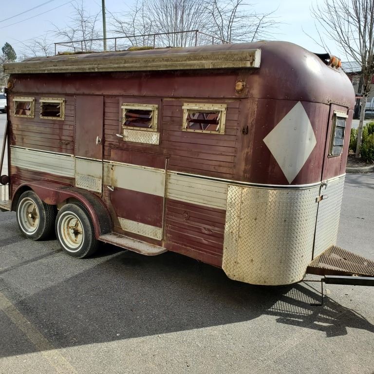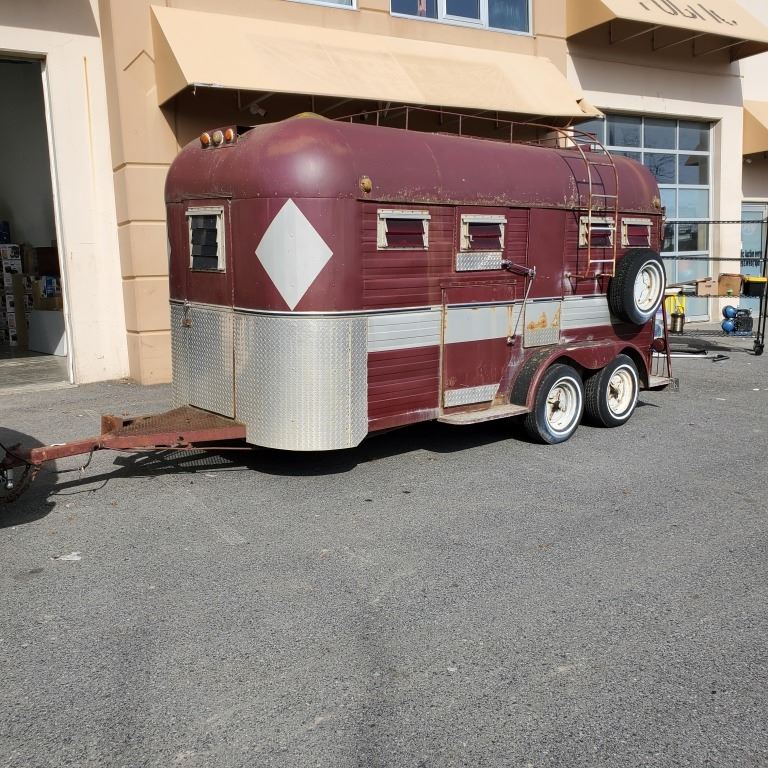 1974 MERHOW ALUMINUM HORSE TRAILER W/ REGISTRATION, TOWS WELL, GOOD TIRES, HAS PASS THROUGH SADDLE RACK, AND FRONT TACK ROOM