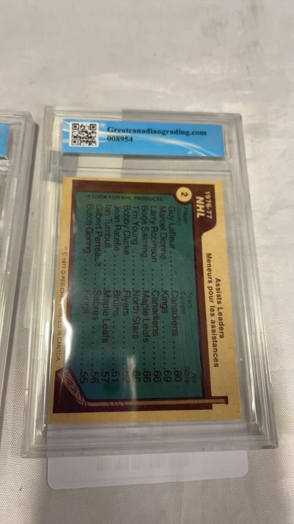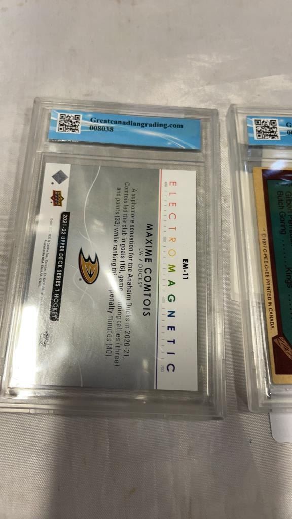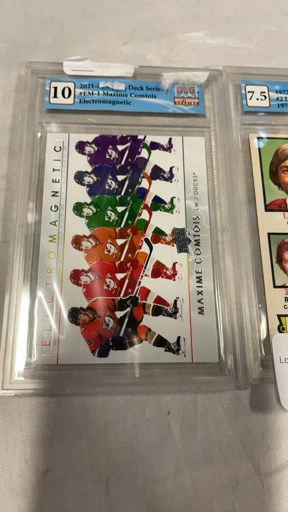 1977 OPC NHL ASSIST LEADERS CARD - GRADED 7.5 AND 2021 UPPER DECK SERIES 1 #EM-1 MAXIME COMTOIS ELECTROMAGNETIC CARD GRADED 10