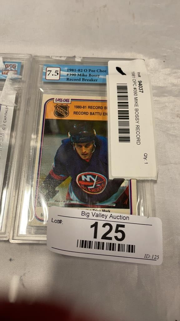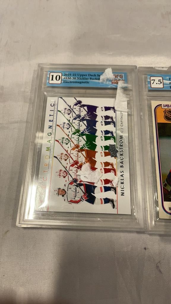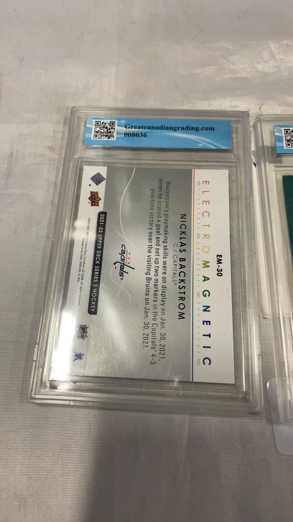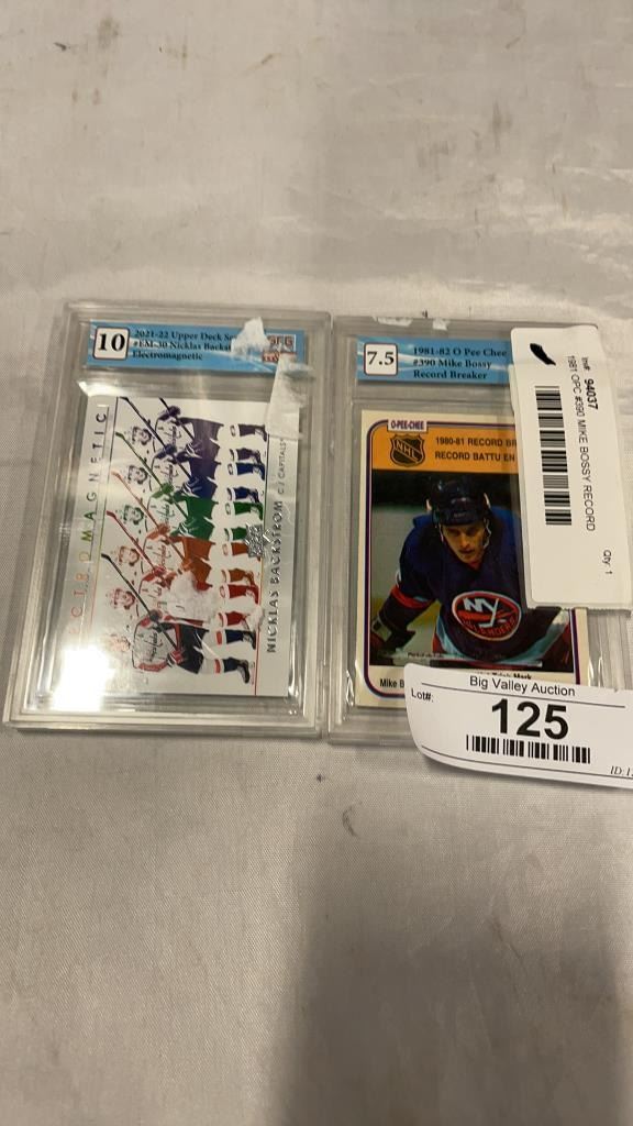 1981 OPC #390 MIKE BOSSY RECORD BREAKER CARD GRADED 7.5 AND 2021 UPPER DECK SERIES 1 #EM-30 NICKLAS BACKSTROM ELECTROMAGNETIC CARD GRADED 10