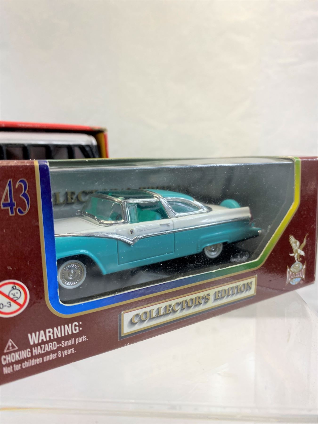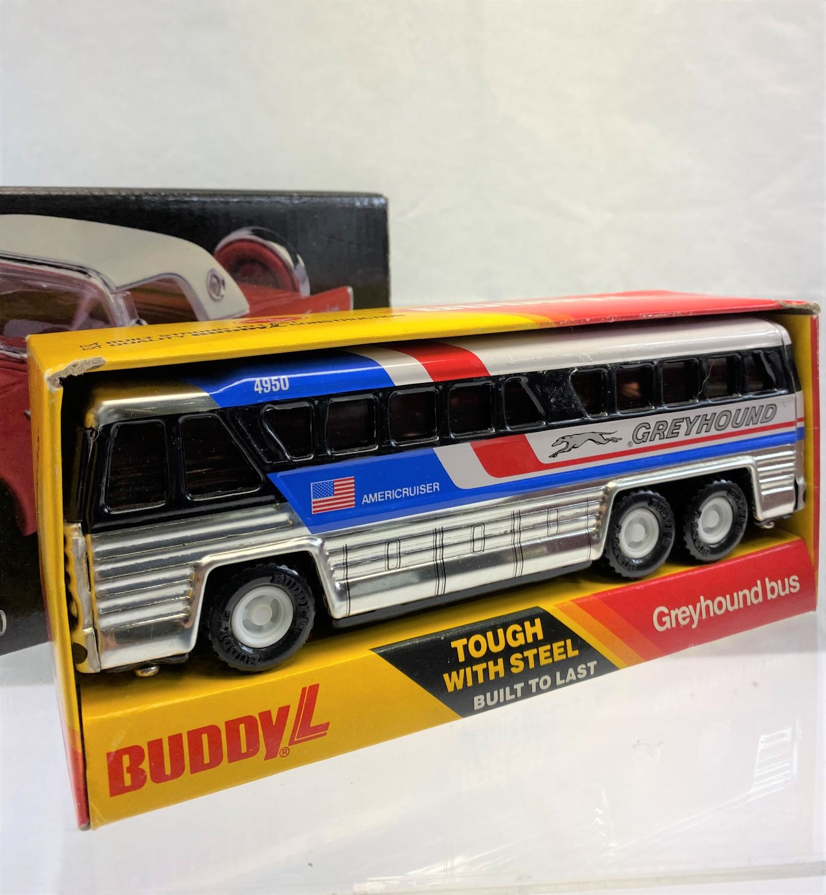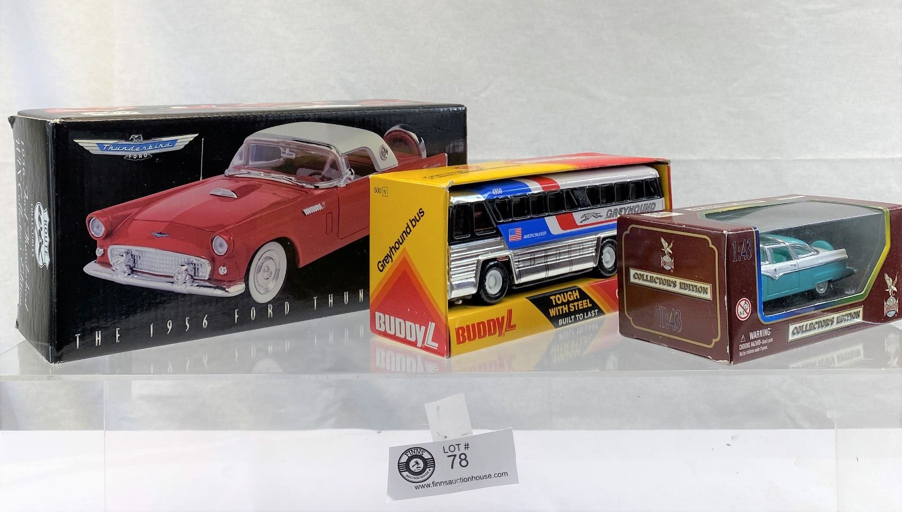 1983 Buddy L Greyhound Bus, New In Box, Route Wix 1956 Ford Thunderbird 1/24 Scale, New And Ford Fairlane Crown Victorian 1/48 Scale Diecast, New