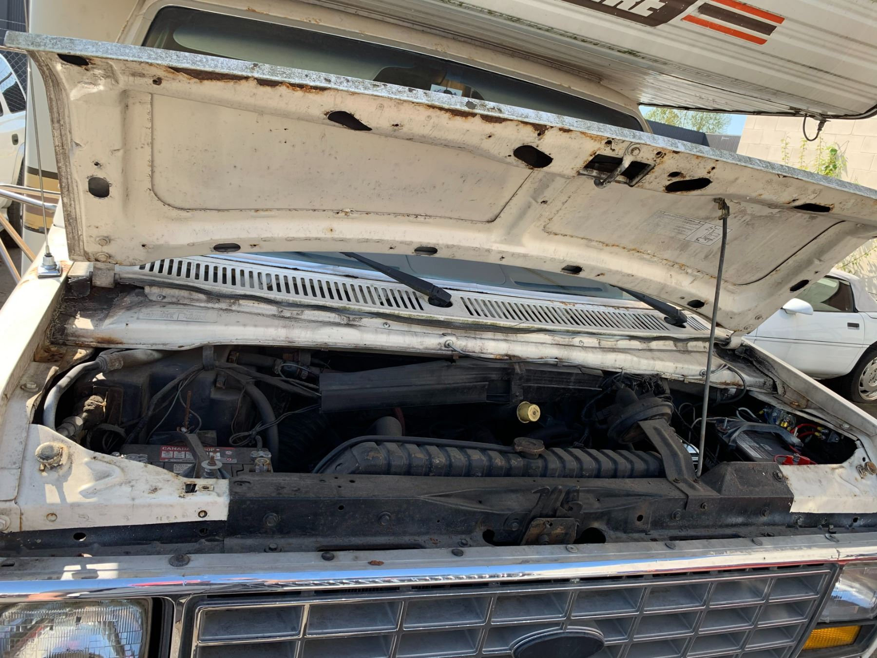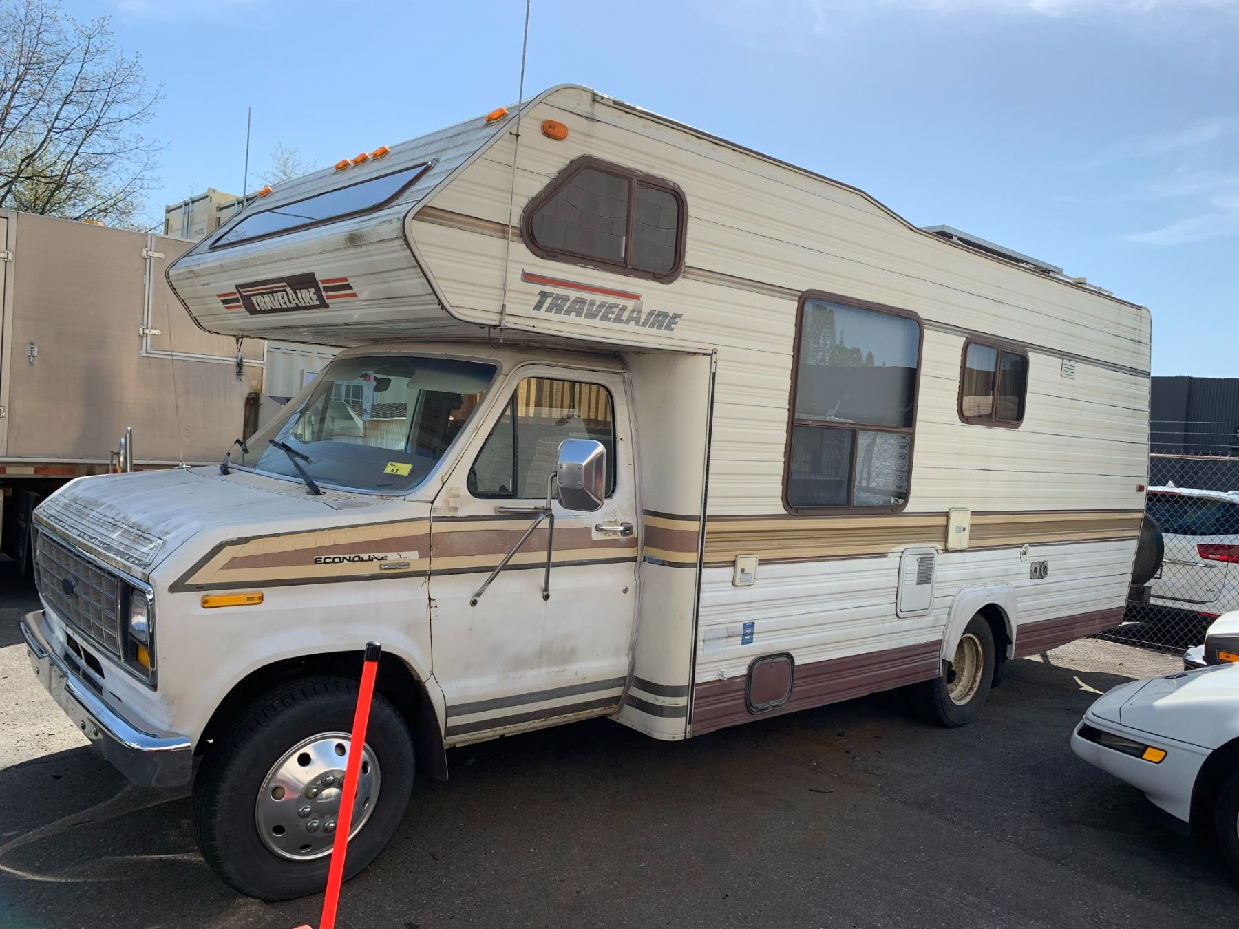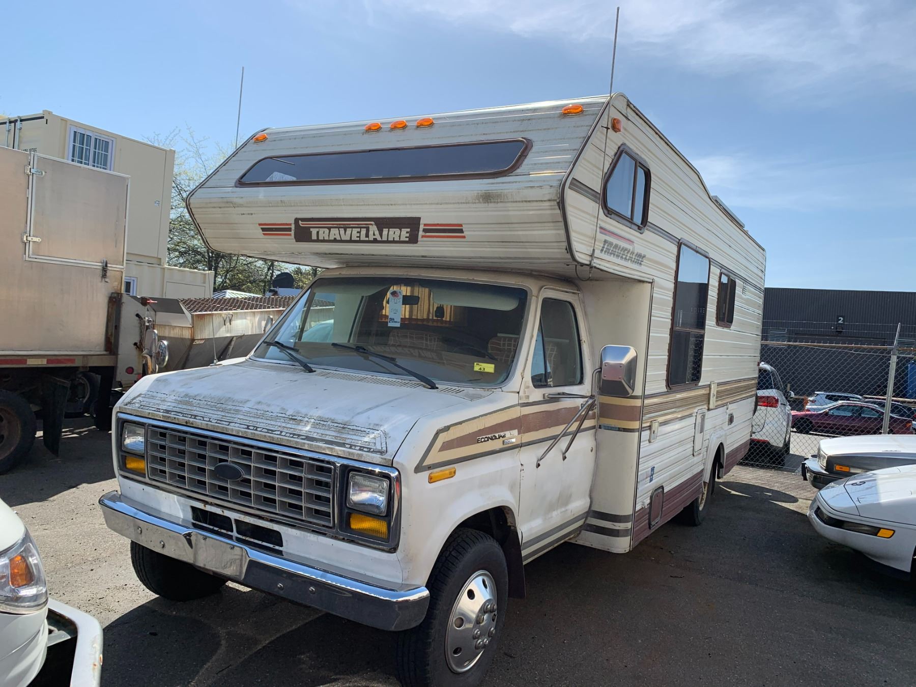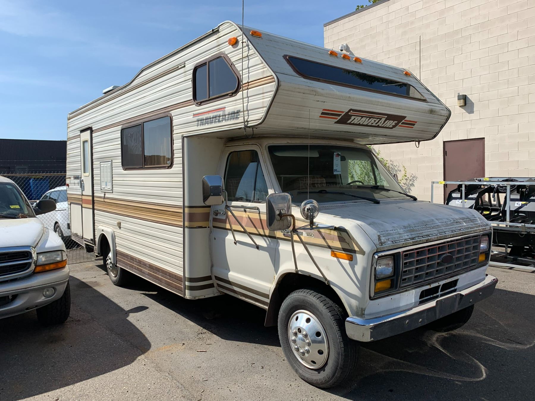 1985 FORD TRAVEL AIRE ECONOLINE 350 XL MOTOR HOME, WHITE, VIN 1FDKE30L7FHA84345 KMS TMU, GAS, AUTO, RD, CC, TAPE DECK, CB RADIO, STOVE WITH BURNERS, SINK, 4 SEAT TABLE, KEYS, STARTS, SLEEPING AREA ABOVE CAB, SMALL HOLE IN ROOF, COUCH, FRIDGE, LEAK ISSUES, BATHROOM, ALUMINIUM CHECKERED STORAGE BOX ON BACK, OOP *HAS BC REGISTRATION* NO ICBC DECLARATIONS