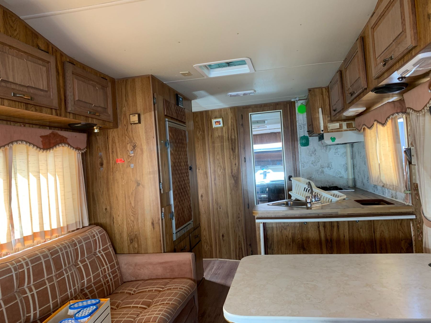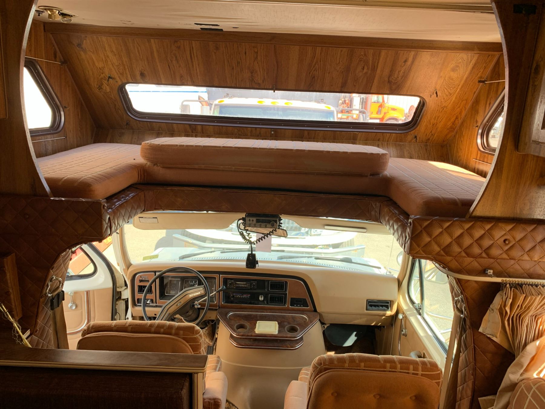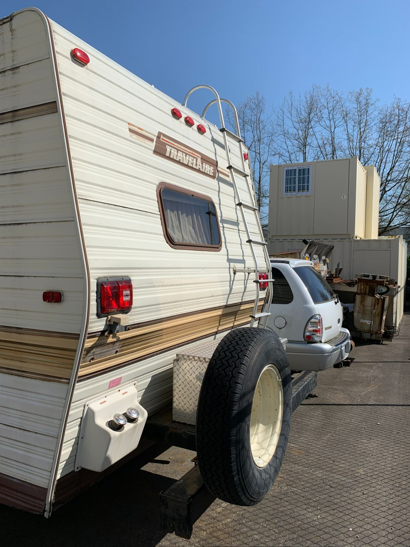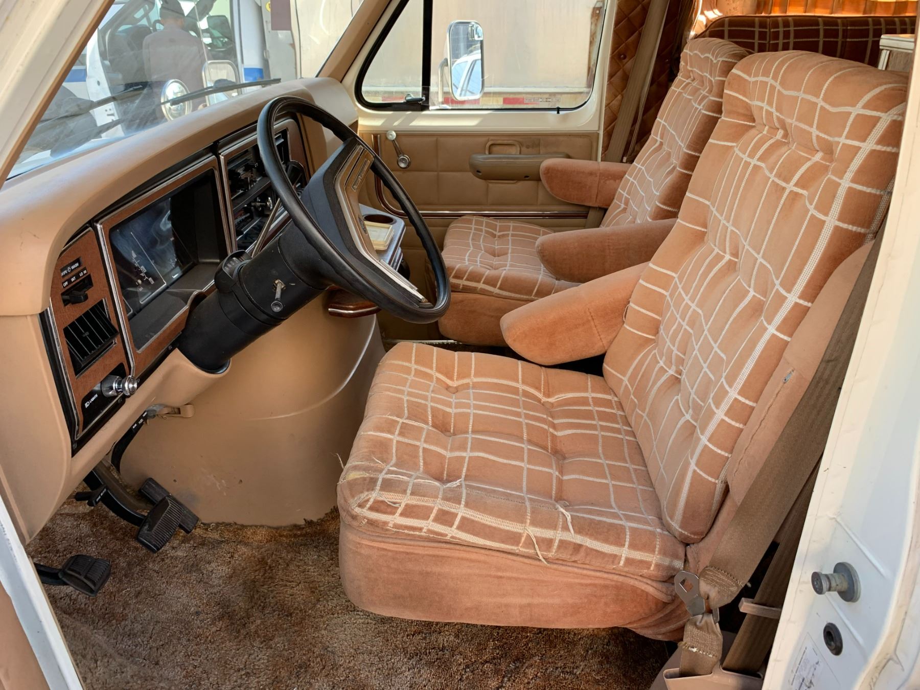 1985 FORD TRAVEL AIRE ECONOLINE 350 XL MOTOR HOME, WHITE, VIN 1FDKE30L7FHA84345 KMS TMU, GAS, AUTO, RD, CC, TAPE DECK, CB RADIO, STOVE WITH BURNERS, SINK, 4 SEAT TABLE, KEYS, STARTS, SLEEPING AREA ABOVE CAB, SMALL HOLE IN ROOF, COUCH, FRIDGE, LEAK ISSUES, BATHROOM, ALUMINIUM CHECKERED STORAGE BOX ON BACK, OOP *HAS BC REGISTRATION* NO ICBC DECLARATIONS