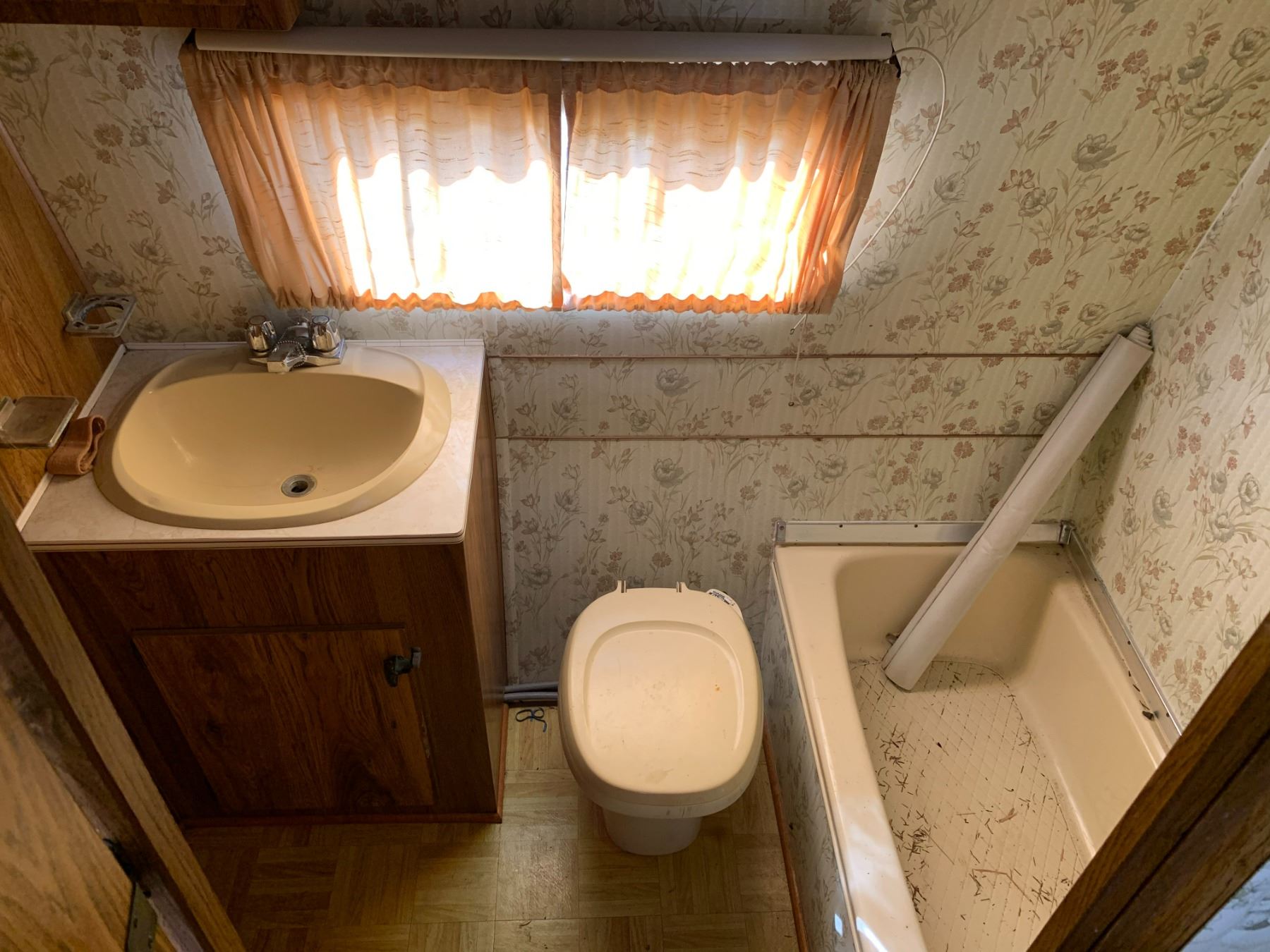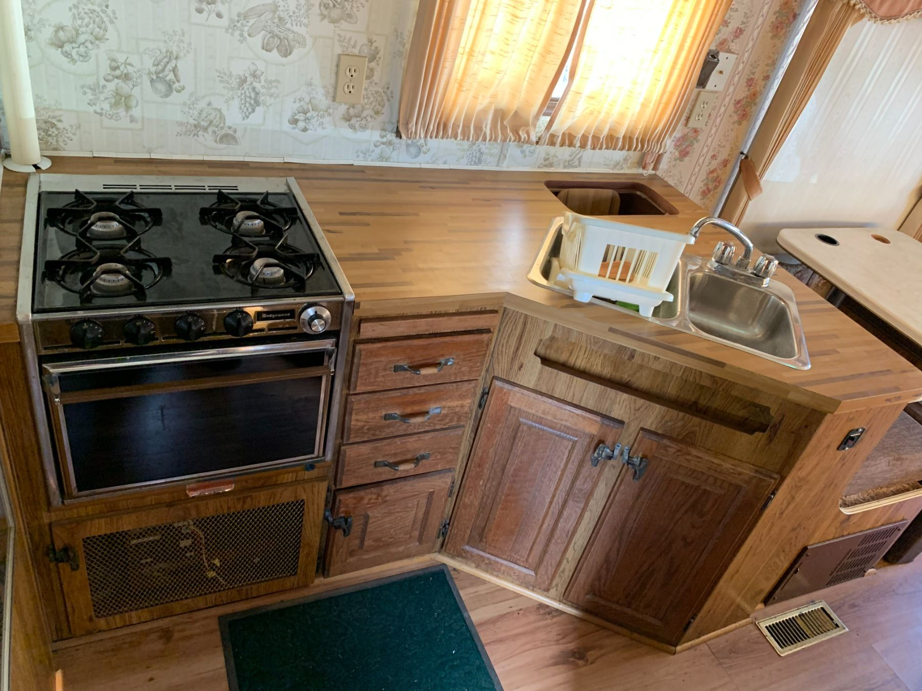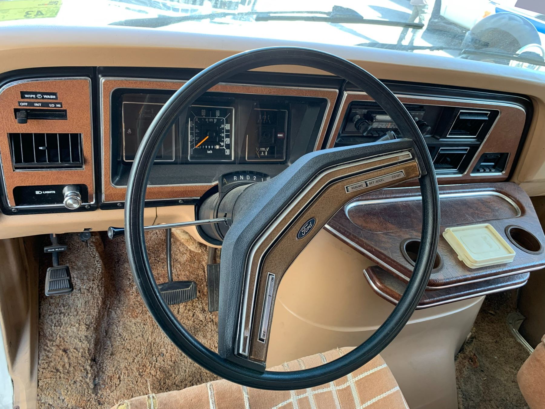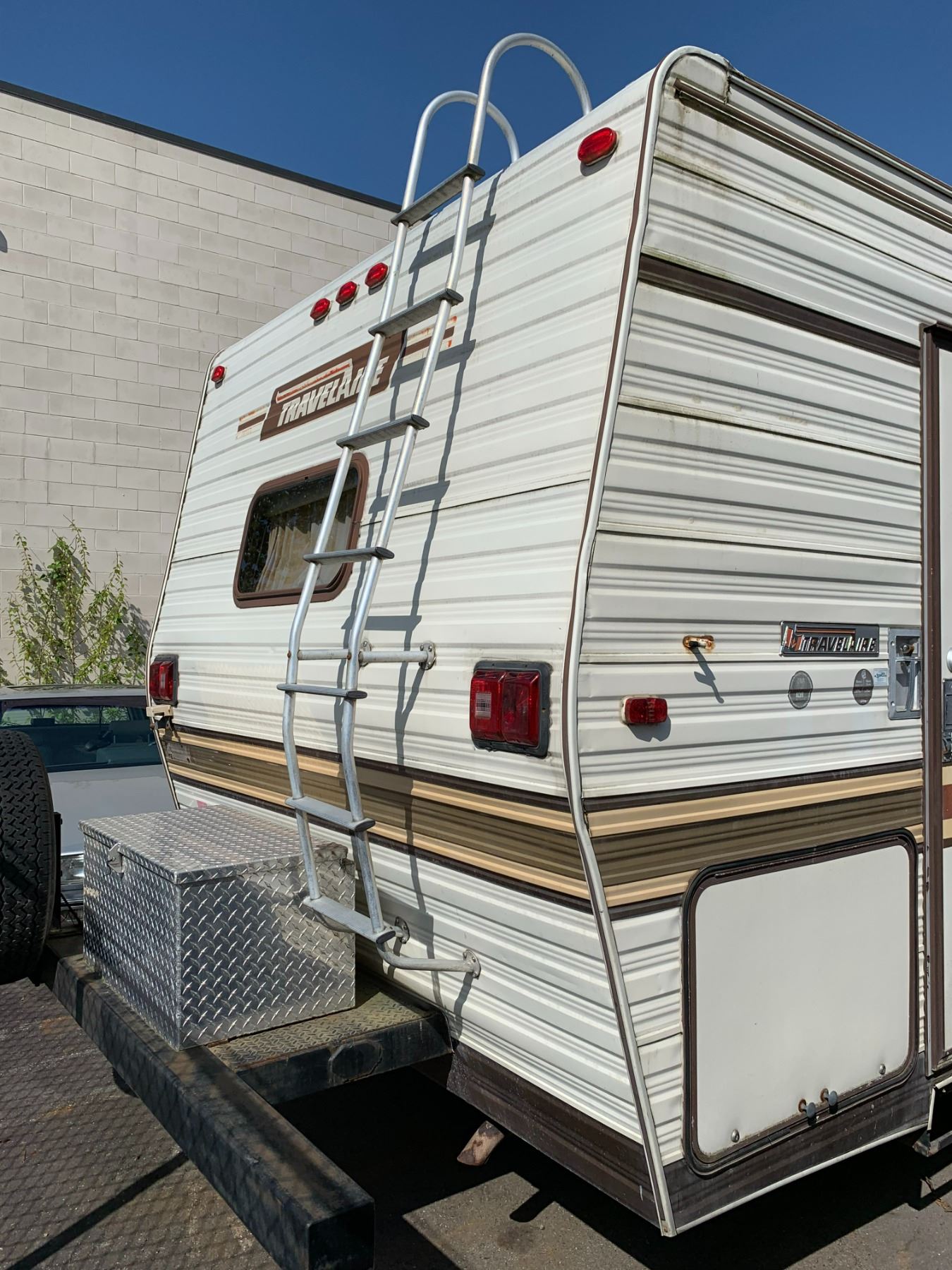 1985 FORD TRAVEL AIRE ECONOLINE 350 XL MOTOR HOME, WHITE, VIN 1FDKE30L7FHA84345 KMS TMU, GAS, AUTO, RD, CC, TAPE DECK, CB RADIO, STOVE WITH BURNERS, SINK, 4 SEAT TABLE, KEYS, STARTS, SLEEPING AREA ABOVE CAB, SMALL HOLE IN ROOF, COUCH, FRIDGE, LEAK ISSUES, BATHROOM, ALUMINIUM CHECKERED STORAGE BOX ON BACK, OOP *HAS BC REGISTRATION* NO ICBC DECLARATIONS