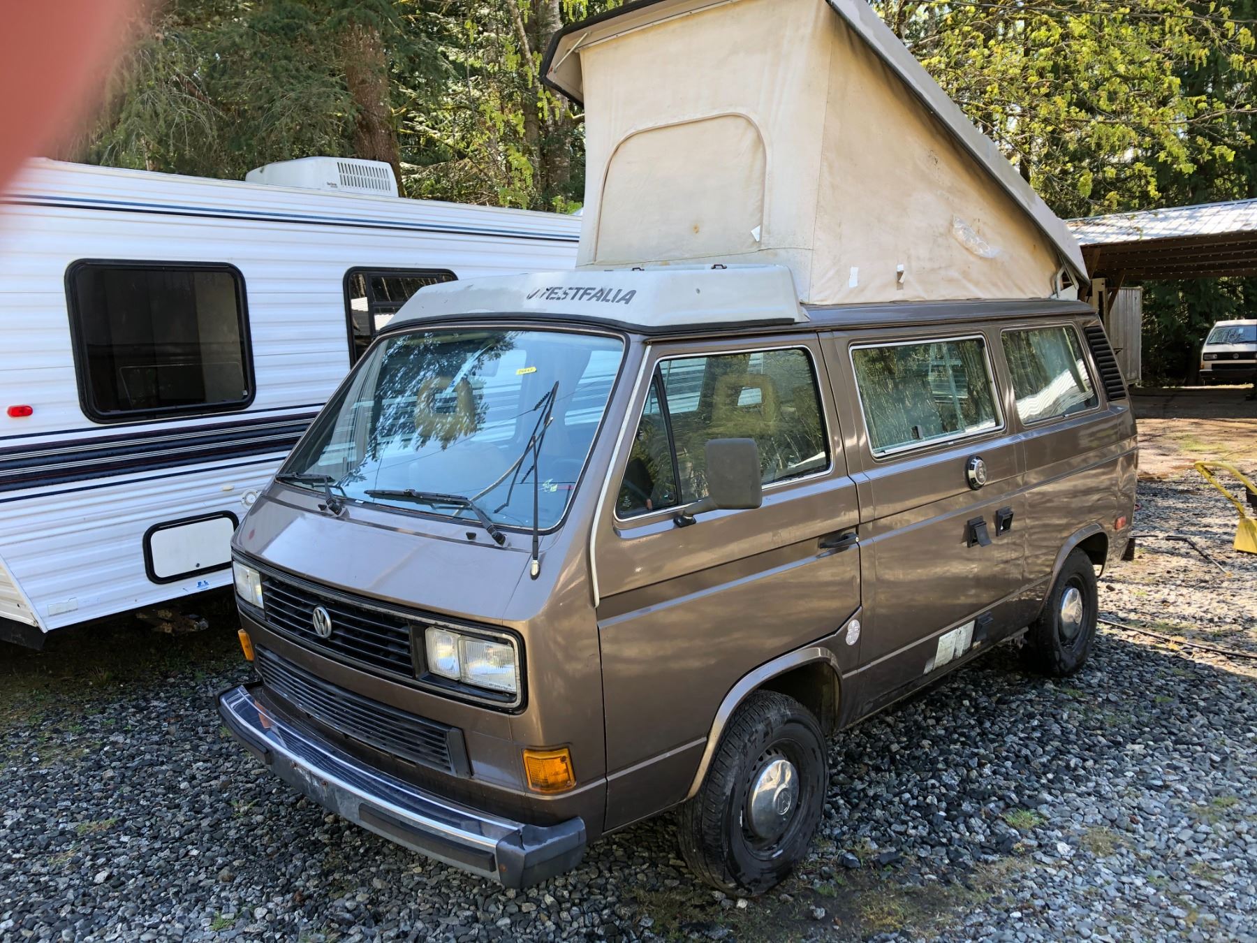 1985 VW WESTFALIA VANAGON GL, BRONZE - VIN# WV2ZB0257GH035108, 375556KM AUTOMATIC, COMES WITH NEW CANVAS, SWIVEL SEATS, FRIDGE, STOVE, SINK, SLEEPS 4, SOME MINOR DENTS, SOME RUST/BUBBLING, PUSH BUTTON START (NAMED DARCY) NO LIENS, DECLARATIONS $2967.00. *NANAIMO*
