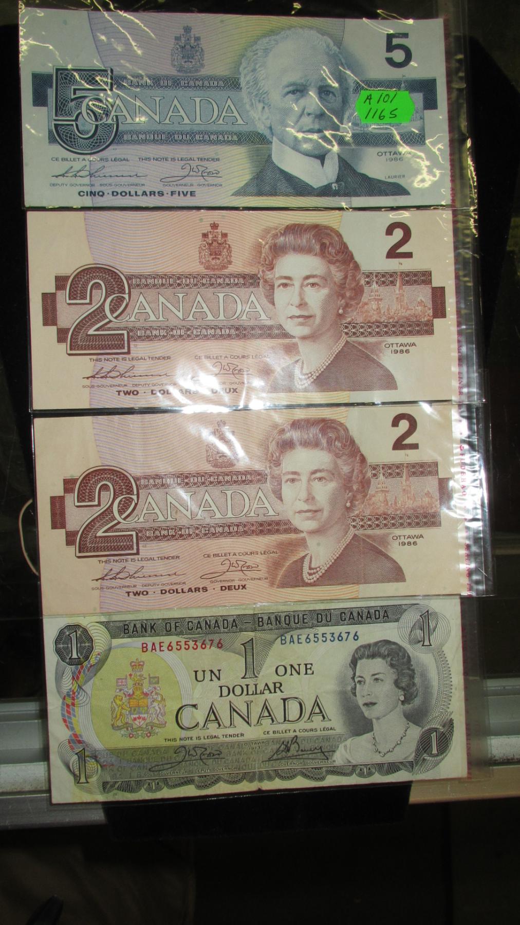 1986 $5 BILL, 2 - 1986 $2 BILLS & A 1973 $1 BILL