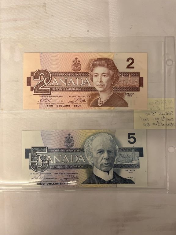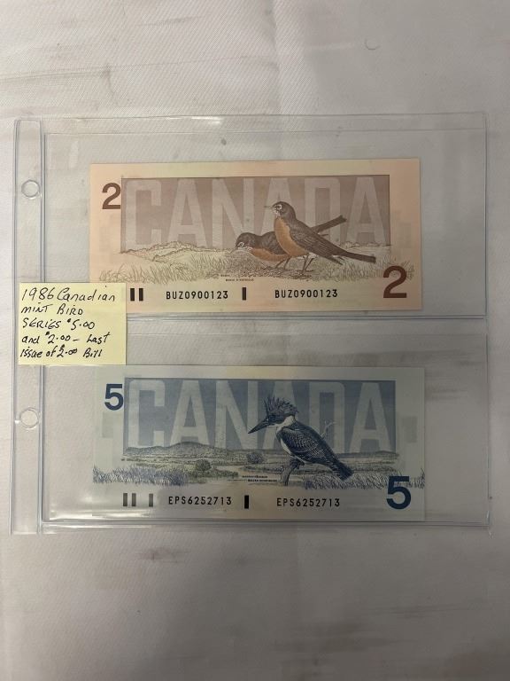 1986 CANADIAN MINT BIRD SERIES $5 PLUS $2 BILL, LAST ISSUE OF THE $2 BILL