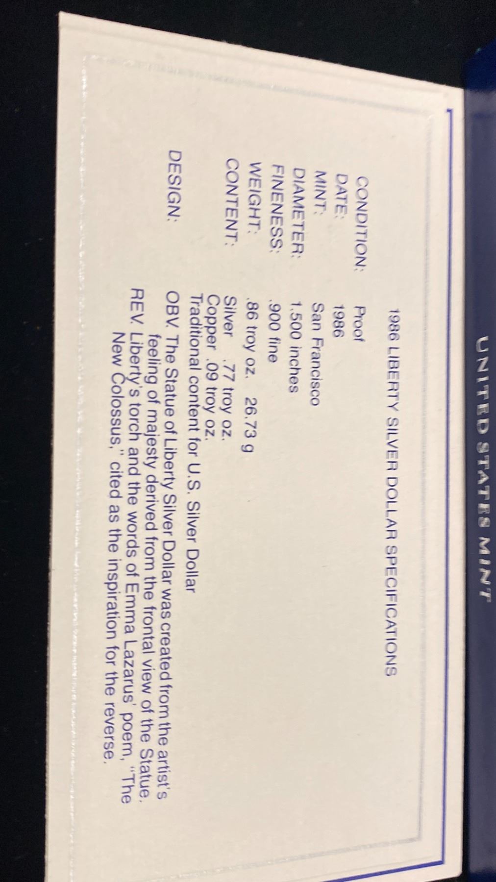 1986 USA ELLIS ISLAND SILVER DOLLAR