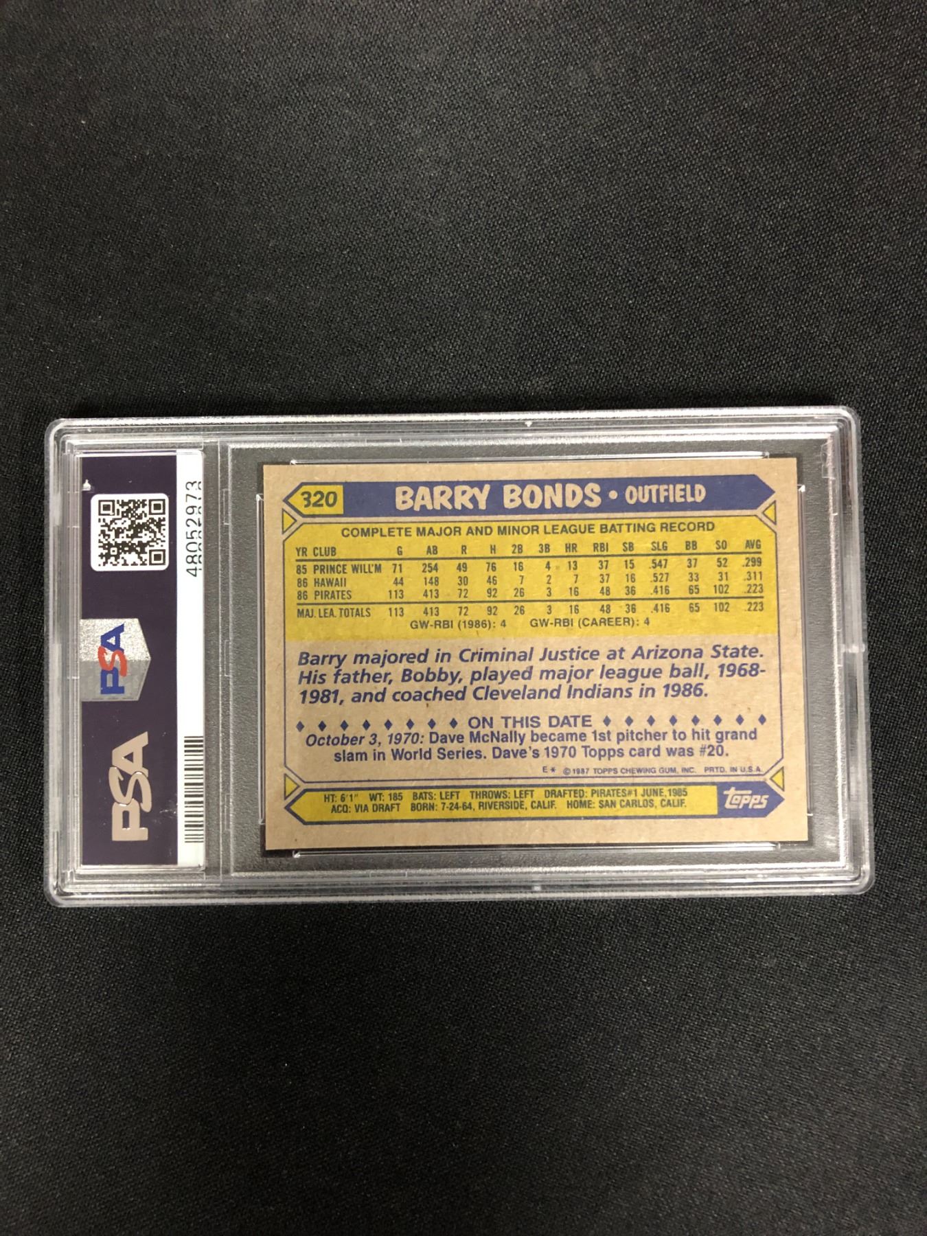 1987 TOPPS NO. 320 BARRY BONDS RC (PSA 7)