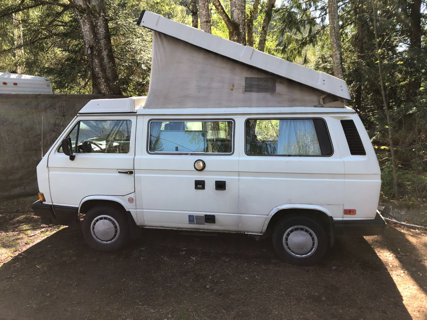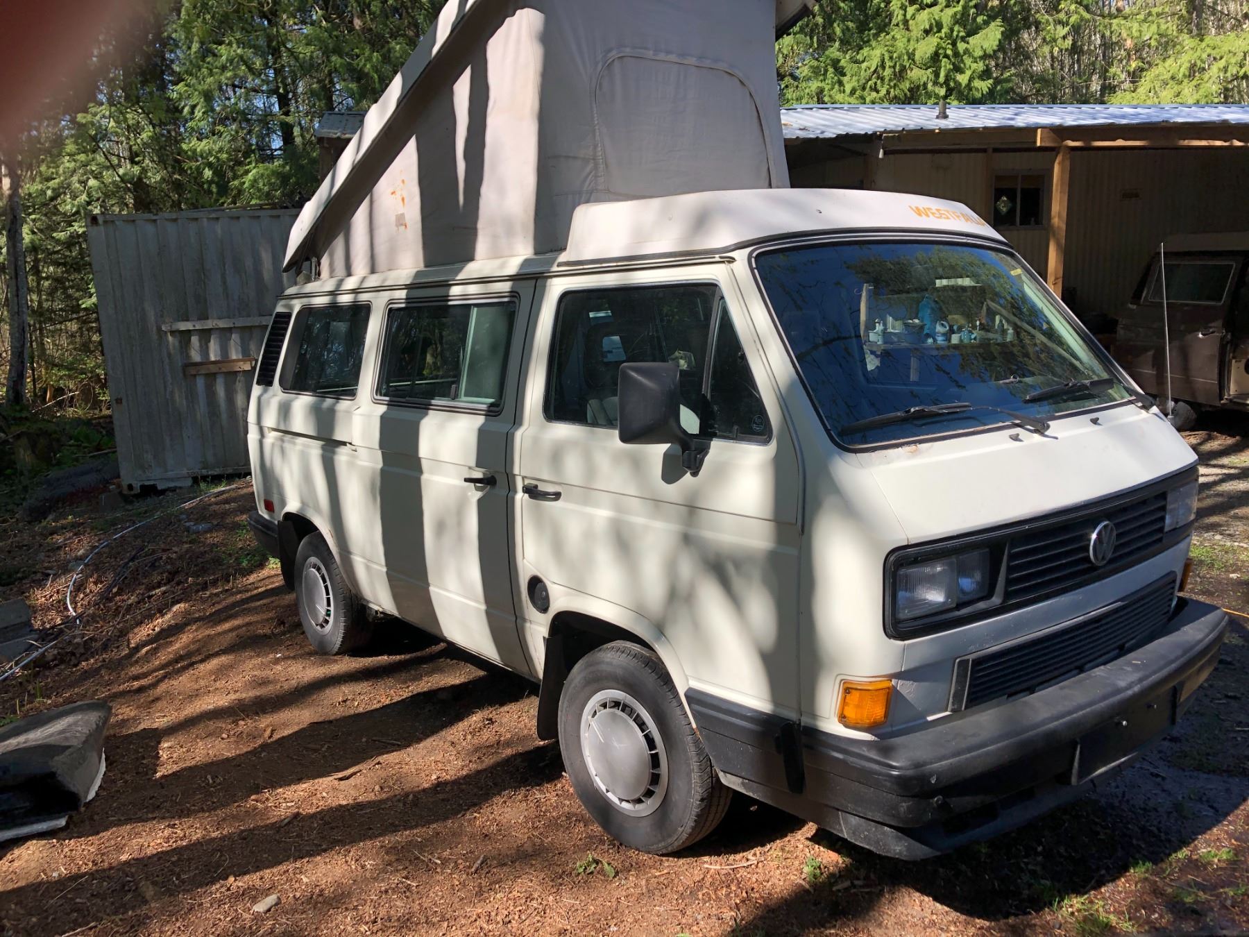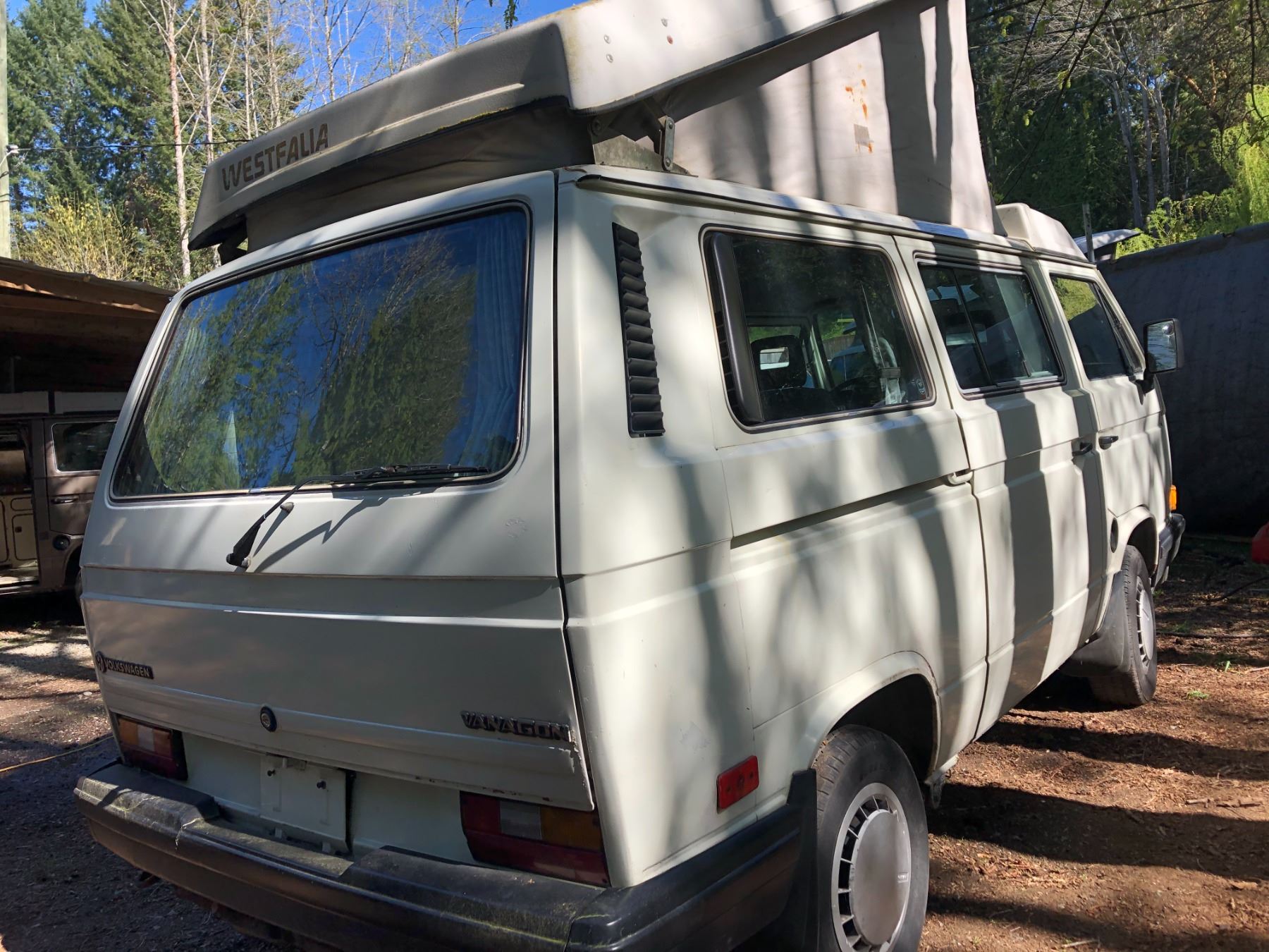 1988 VW WESTFALIA VANAGON, WHITE VIN# WV2ZB0258JH049025, 176300KM, 2.2L SUBARU ENGINE, AUTOMATIC, RD/CD, POP UP TOP, GREY INTERIOR, SLEEPS 4, STOVE, FRIDGE, SINK, SOME BUBBLING IN PAINT, SMALL DENT REAR DRIVER SIDE, (NAMED SHELLY) NO LIENS, DECLARATIONS $373.00 - *NANAIMO*
