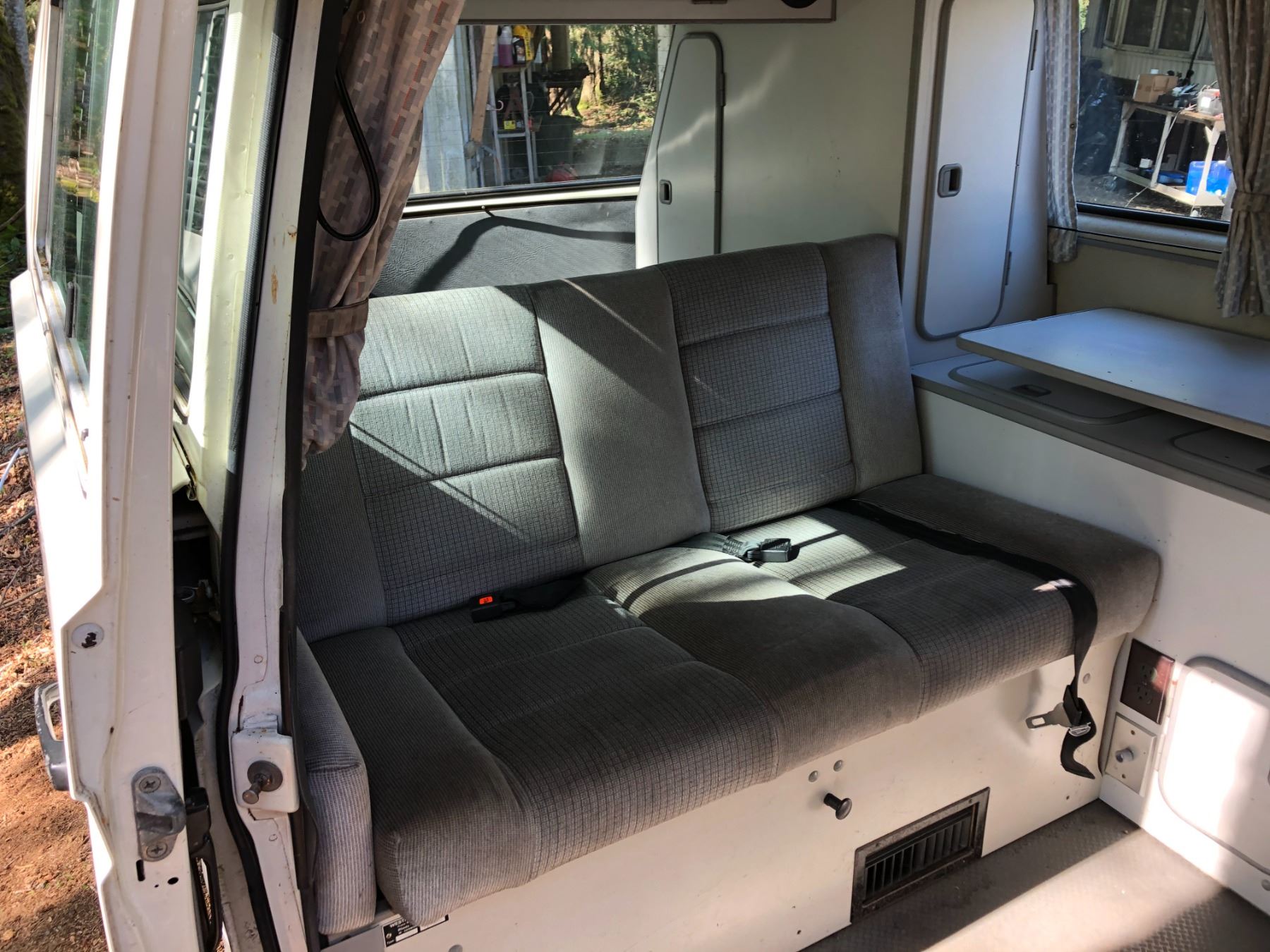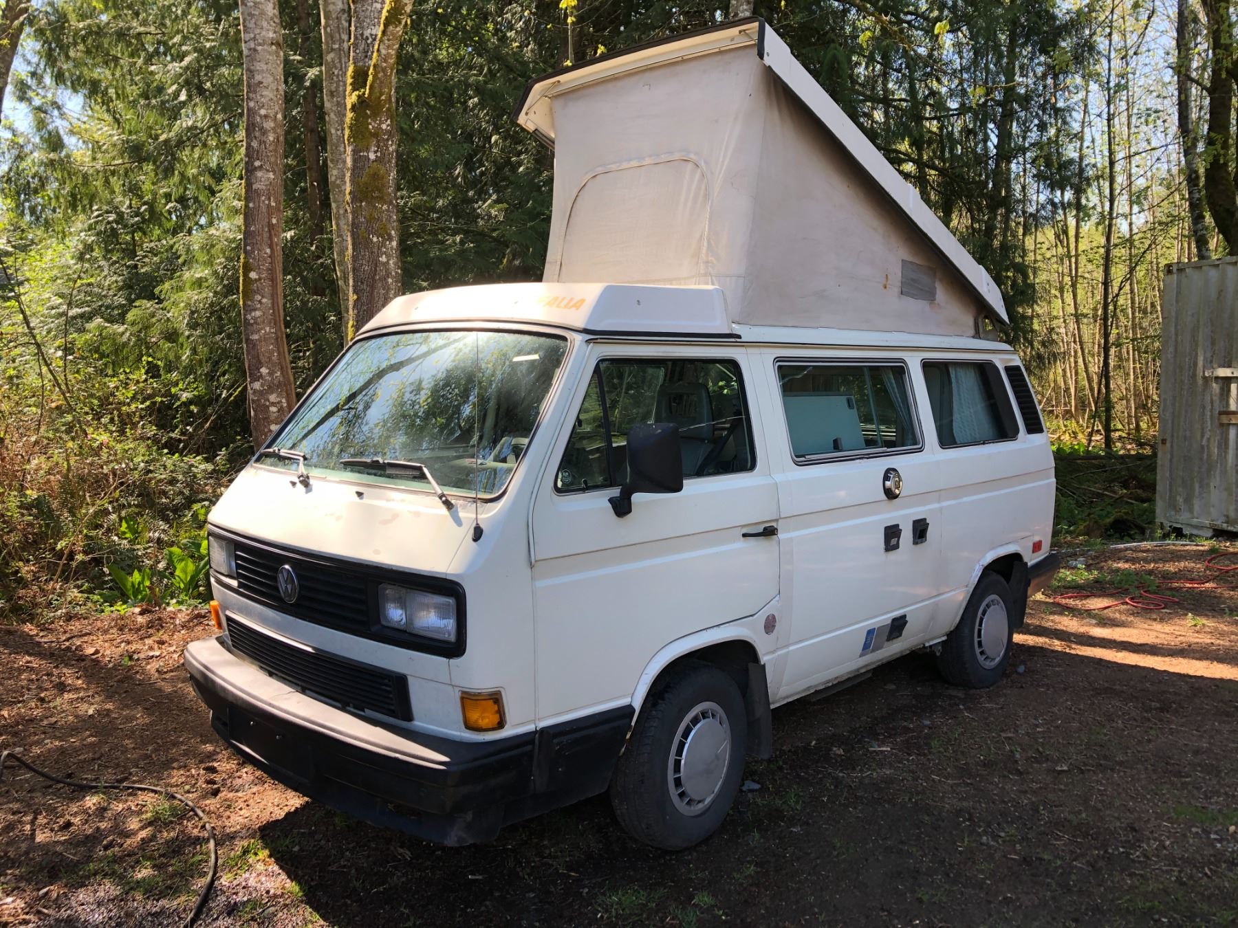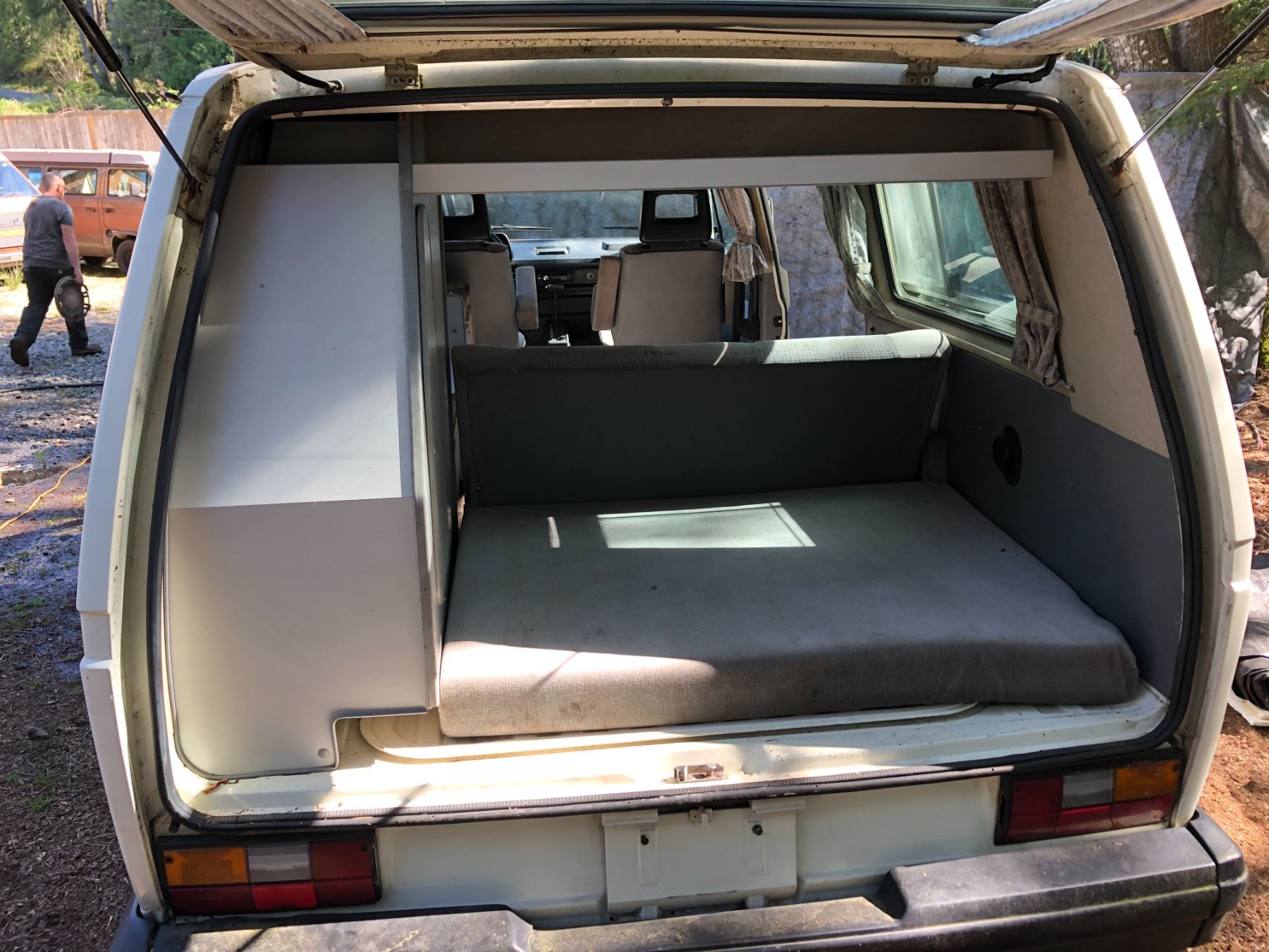 1988 VW WESTFALIA VANAGON, WHITE VIN# WV2ZB0258JH049025, 176300KM, 2.2L SUBARU ENGINE, AUTOMATIC, RD/CD, POP UP TOP, GREY INTERIOR, SLEEPS 4, STOVE, FRIDGE, SINK, SOME BUBBLING IN PAINT, SMALL DENT REAR DRIVER SIDE, (NAMED SHELLY) NO LIENS, DECLARATIONS $373.00 - *NANAIMO*