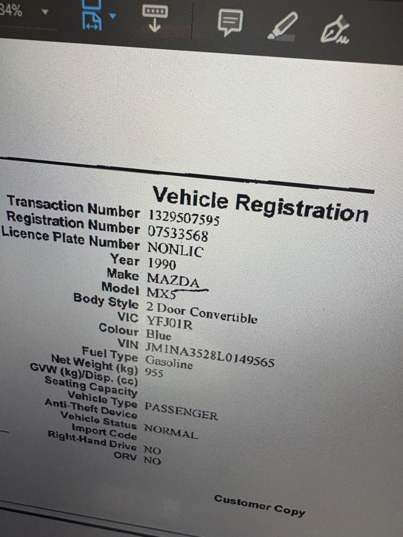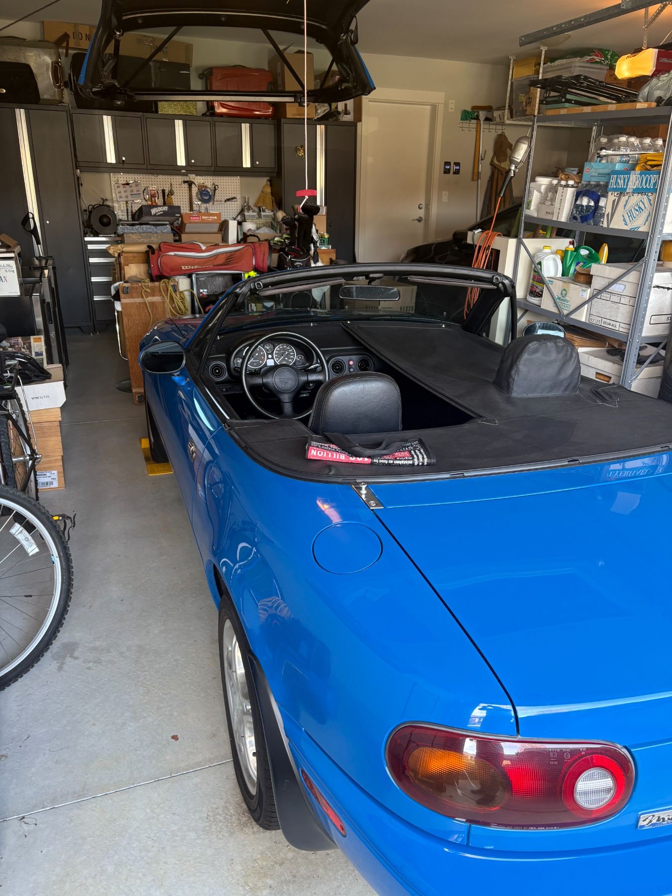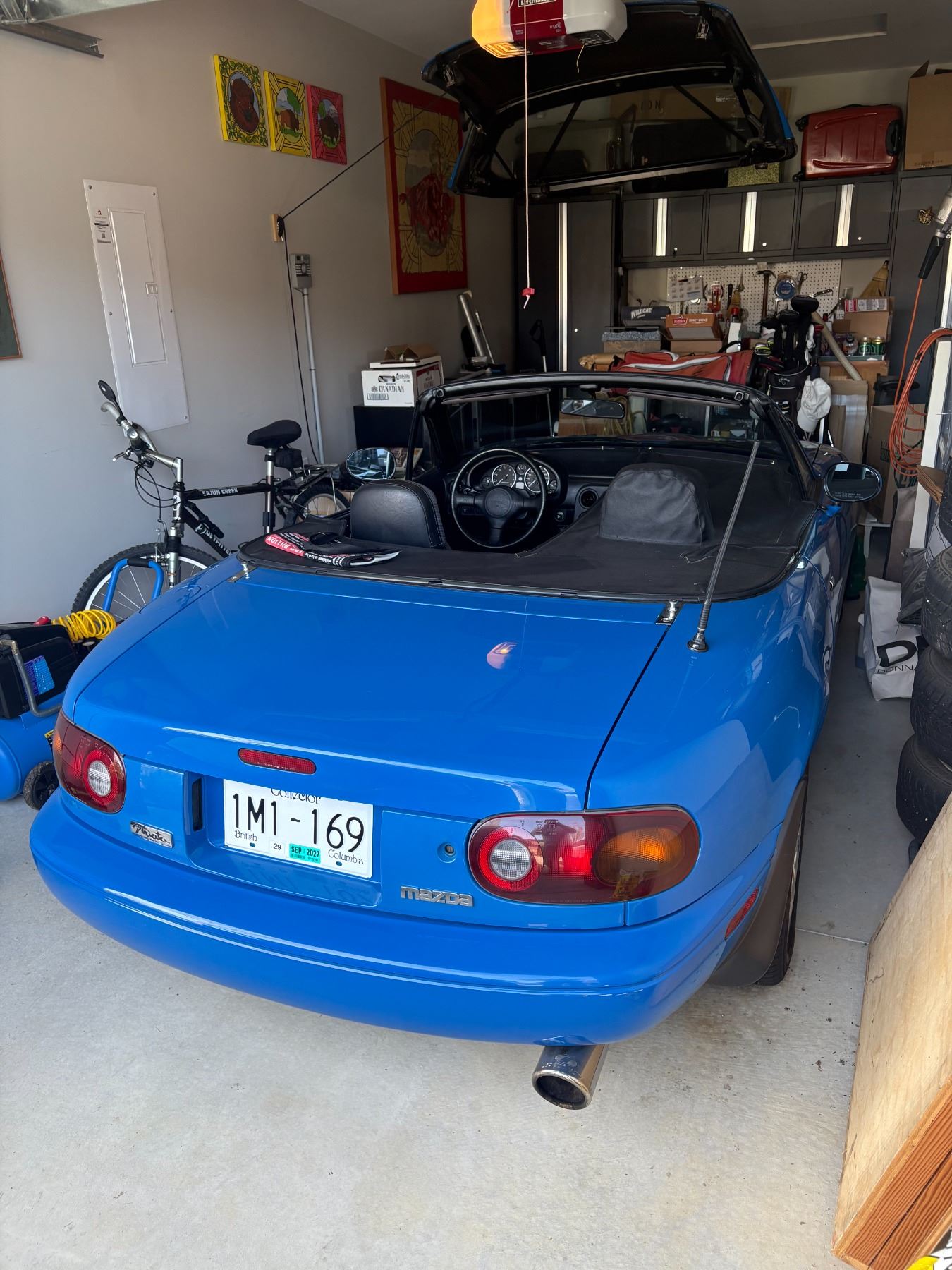 Collector Grade 1990 Mazda Miata MX-5 w/ removable hard top convertable & black leather snap on bimini. Blue w/ black interior & 79k original km. Car has been garage kept in immaculate condition. Automatic transmission.