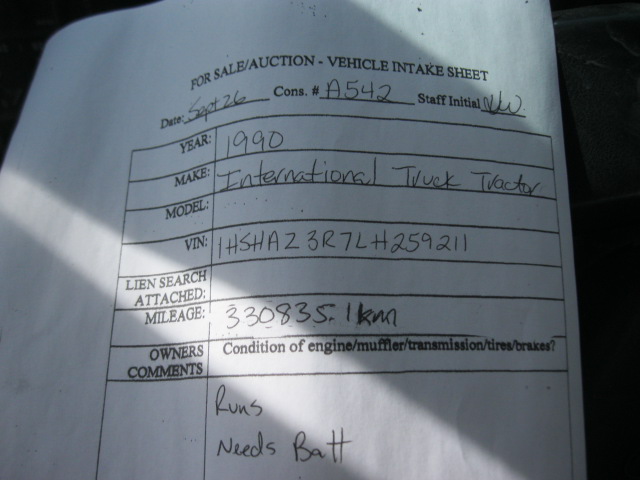 1990 NAVISTAR INTERNATIONAL TRUCK, 330,835KMs, VIN 1HSHAZ3R7LH259211