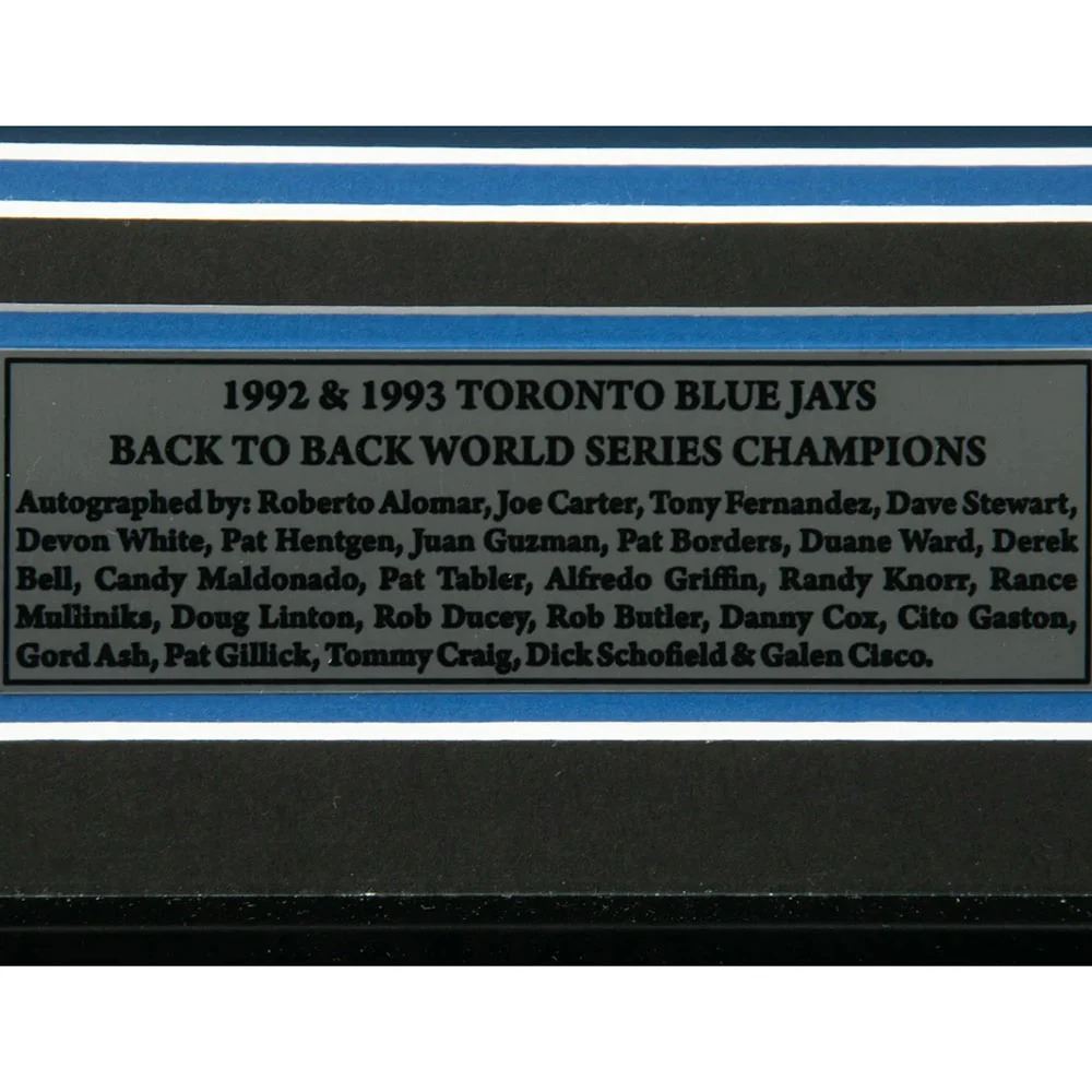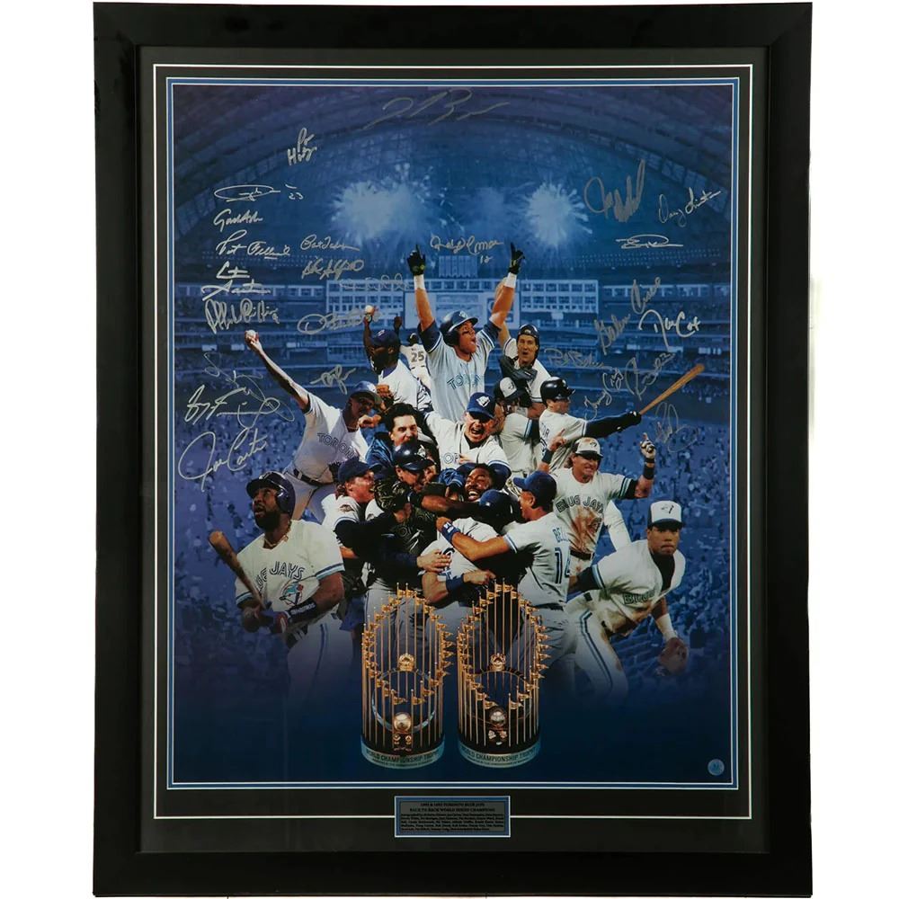 Get this amazing framed piece featuring a 26X33 photo that has been autographed by members of the 1992 and 1993 World Series winning Toronto Blue Jays. Autographs include Roberto Alomar, Joe Carter, Tony Fernandez, Dave Stewart, Devon White, Pat Hentgen, Pat Borders, Duane Ward, Derek Bell, Candy Maldonado, Pat Tabler, Alfredo Griffin, Randy Knorr, Rance Mulliniks, Doug Linton, Rob Ducey, Rob Butler, Danny Cox, Cito Gaston, Gord Ash, Pat Gillick, Tommy Craig, Dick Schofield, and Galen CiscoPrices are in Canadian dollars