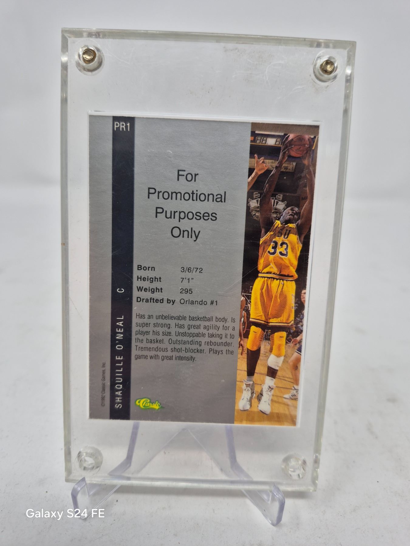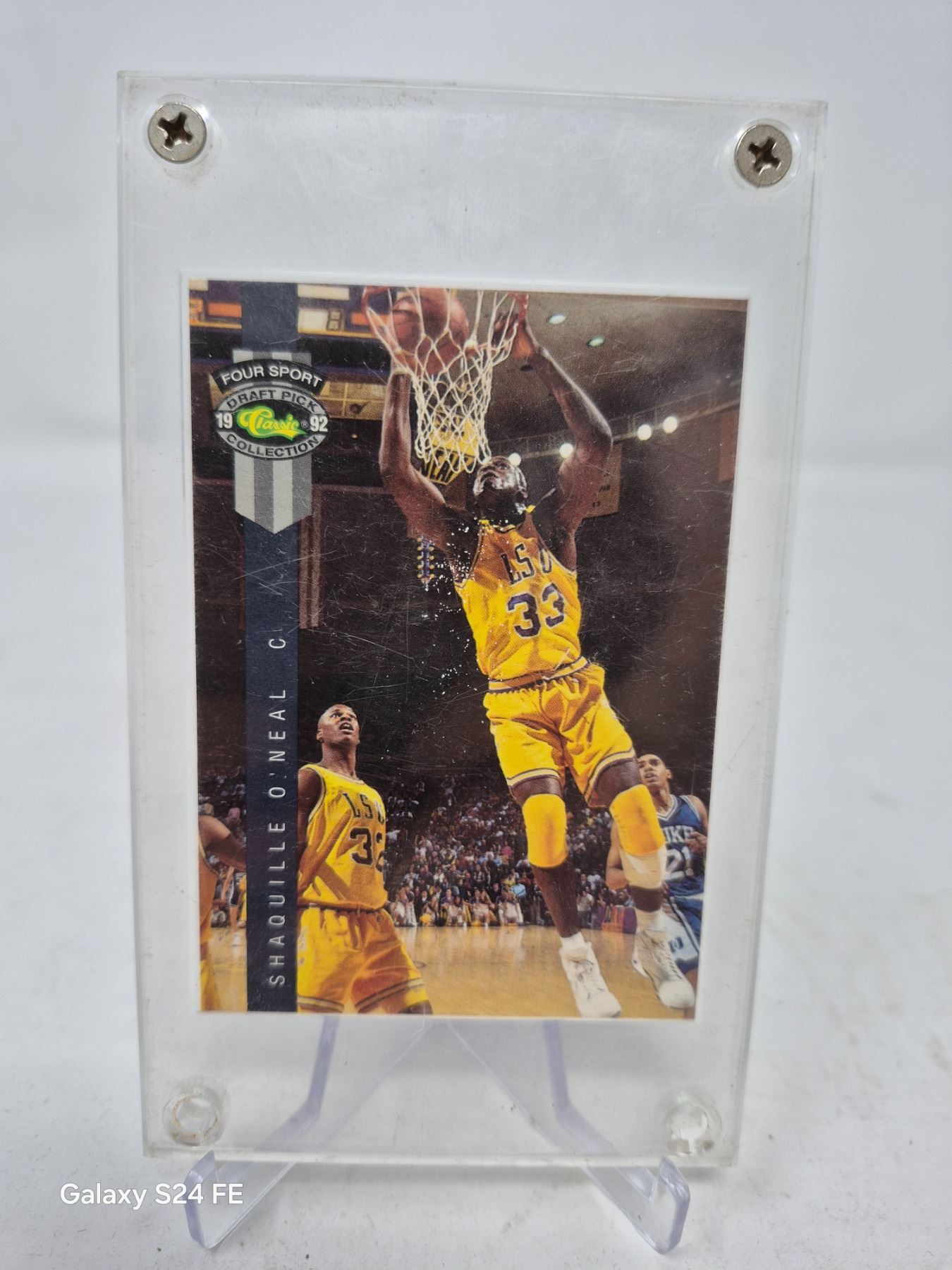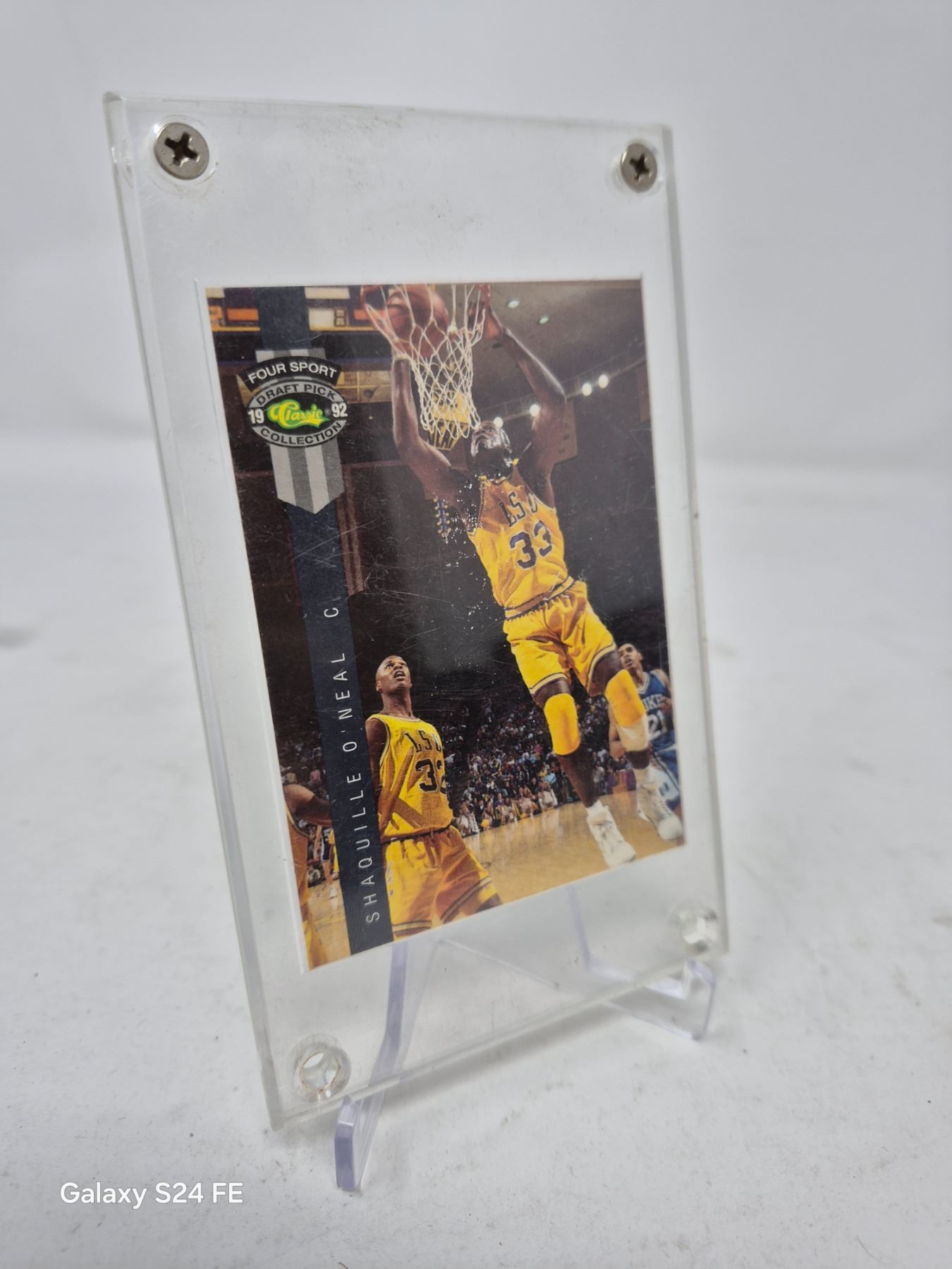 Early Four Sport rookie card of Shaquille O'Neal in LSU jersey, mid-dunk action shot. A powerhouse collectible for basketball fans and 90s nostalgia seekers.