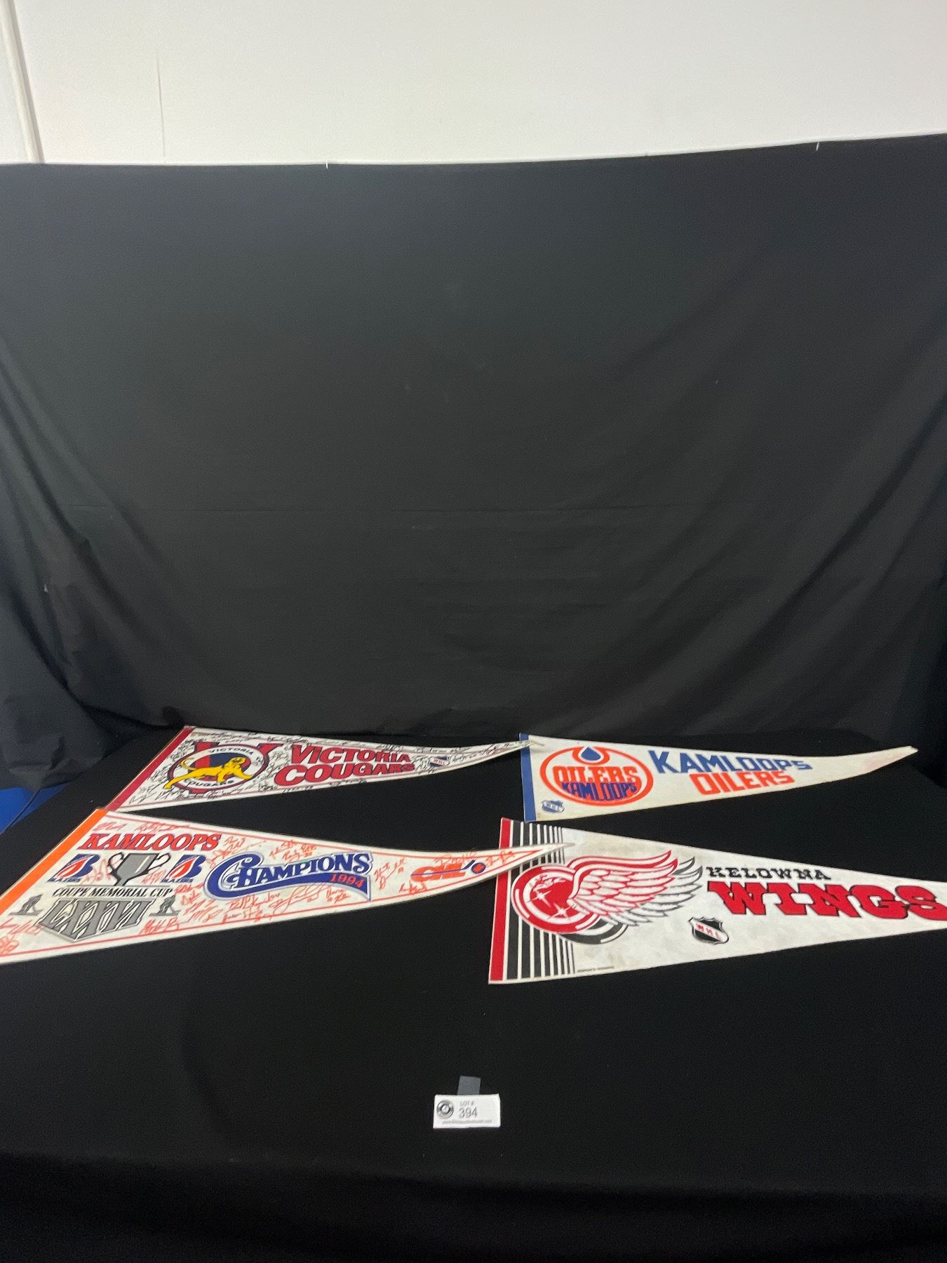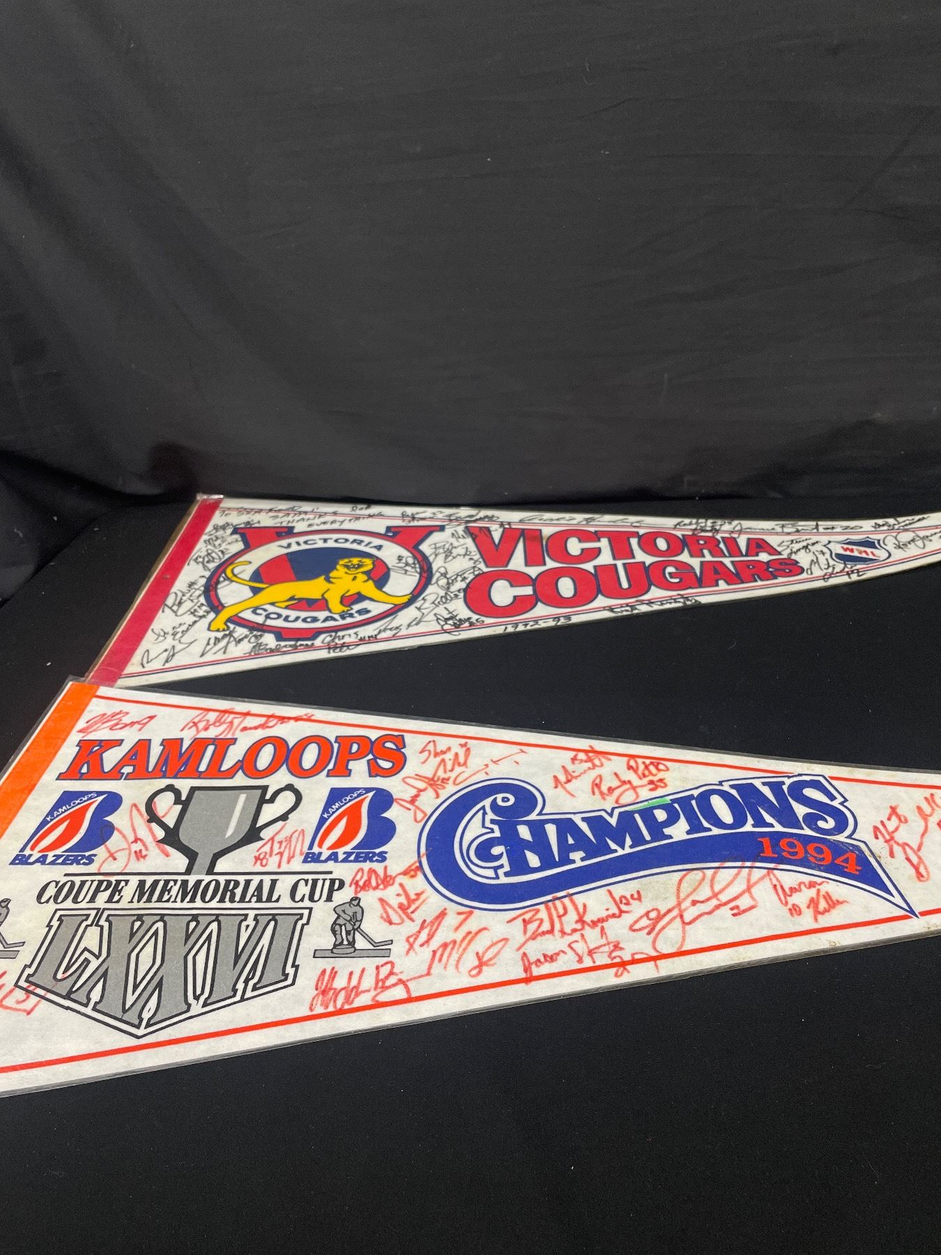 1993-94 Kamloops Blazers Memorial Cup Champions Team Autographed Pennant featuring Jerome Iginla, Plus 3 Other WHL Vintage Pennants