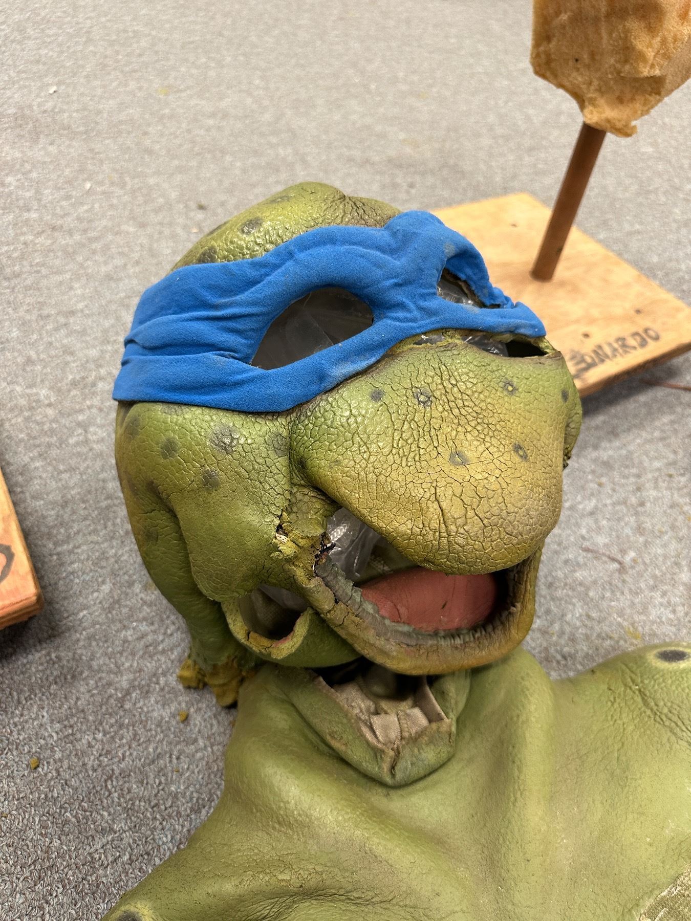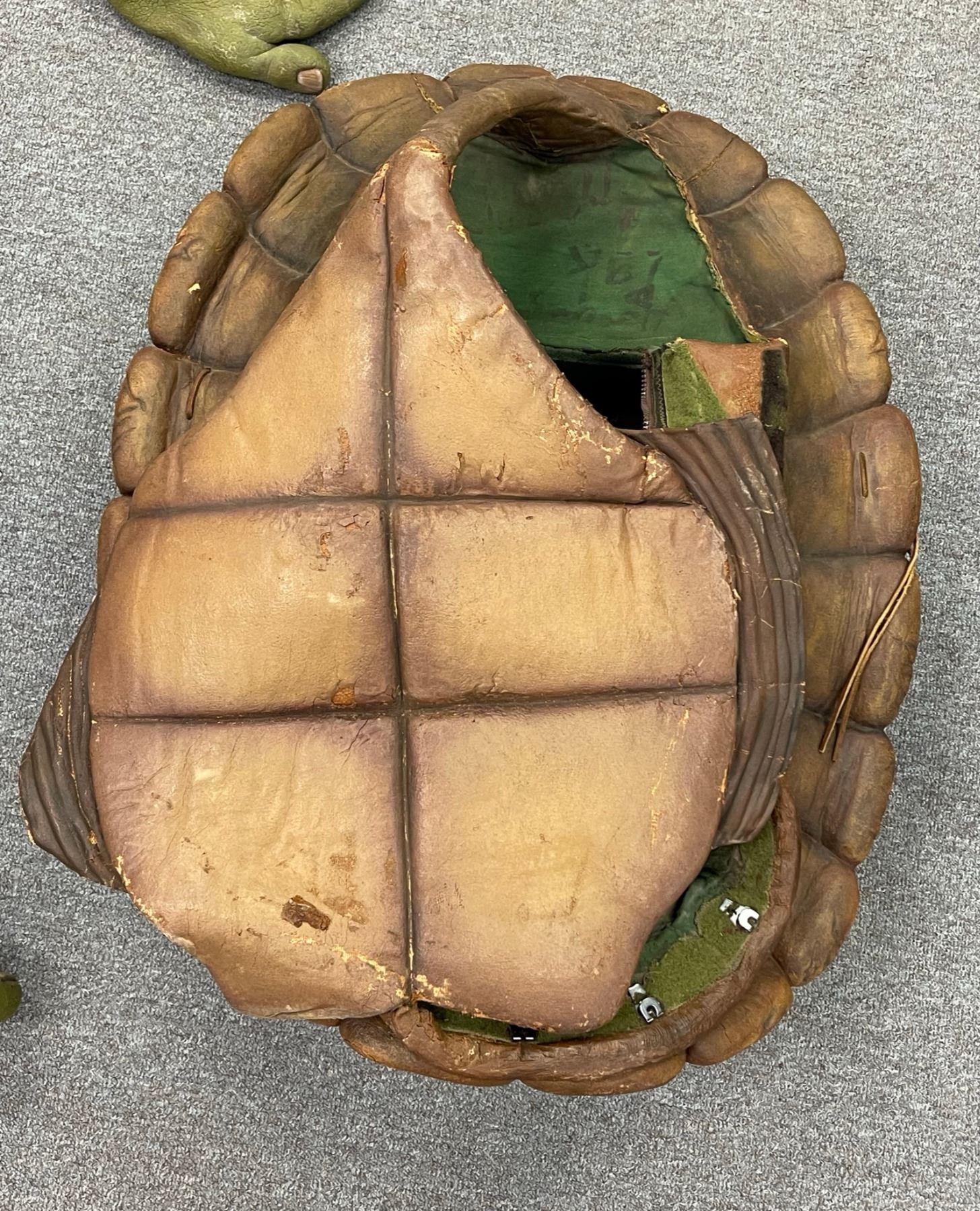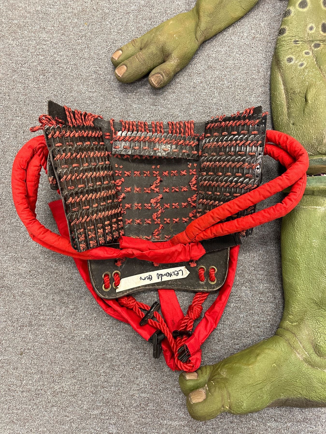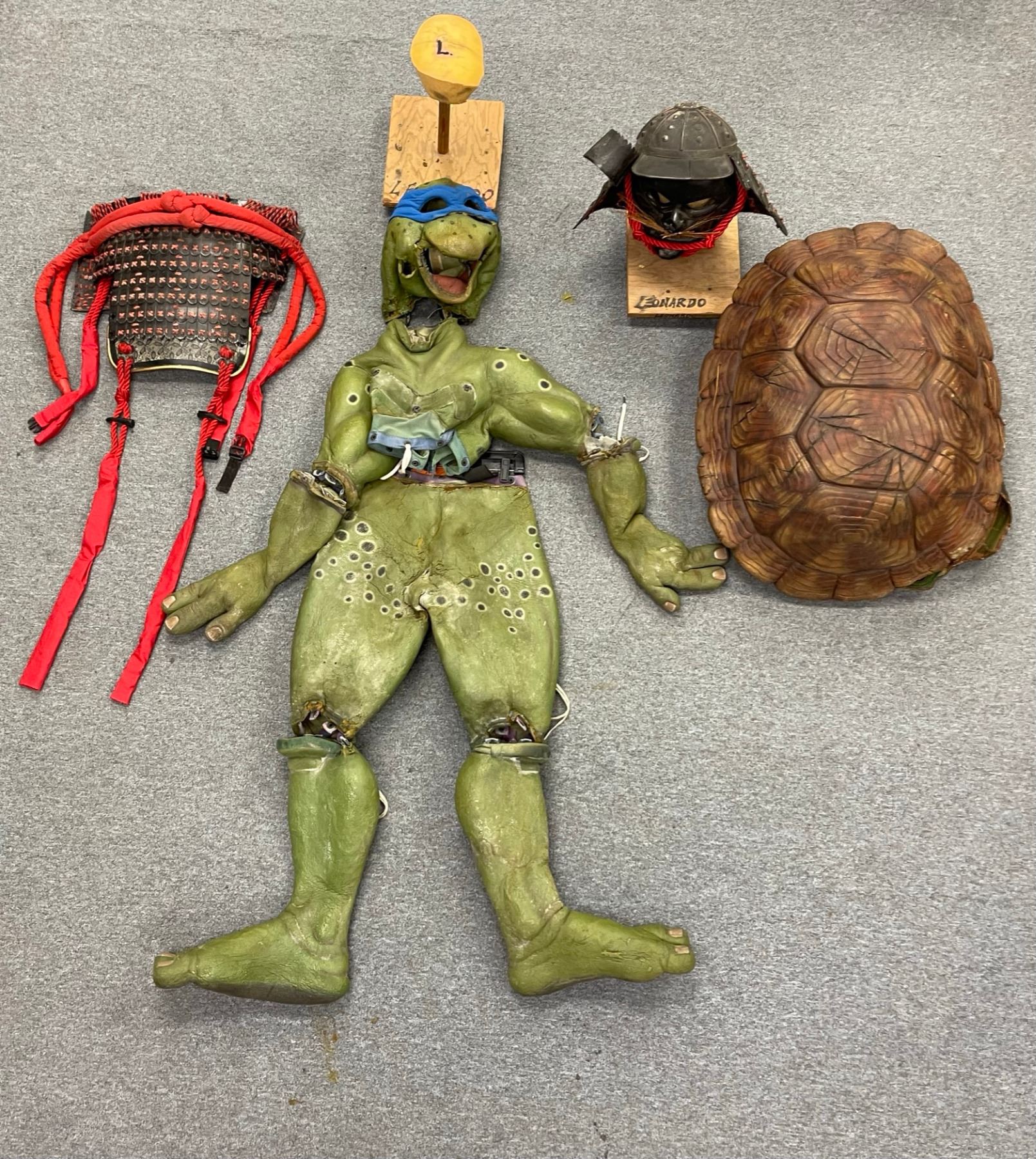 1993 "Teenage Mutant Ninja Turtles III" - Screen-worn Leonardo costume w/ Donatello pants - includes mask w/ stand/ samurai hat and mask w/ stand/ samurai armour belt/ shell/ torso/ pants (Donatello)/ pair of hands & pair of feet. This suit was screen-worn in Ninja Turtles 3 and later used in the Ninja Turtles TV Series.