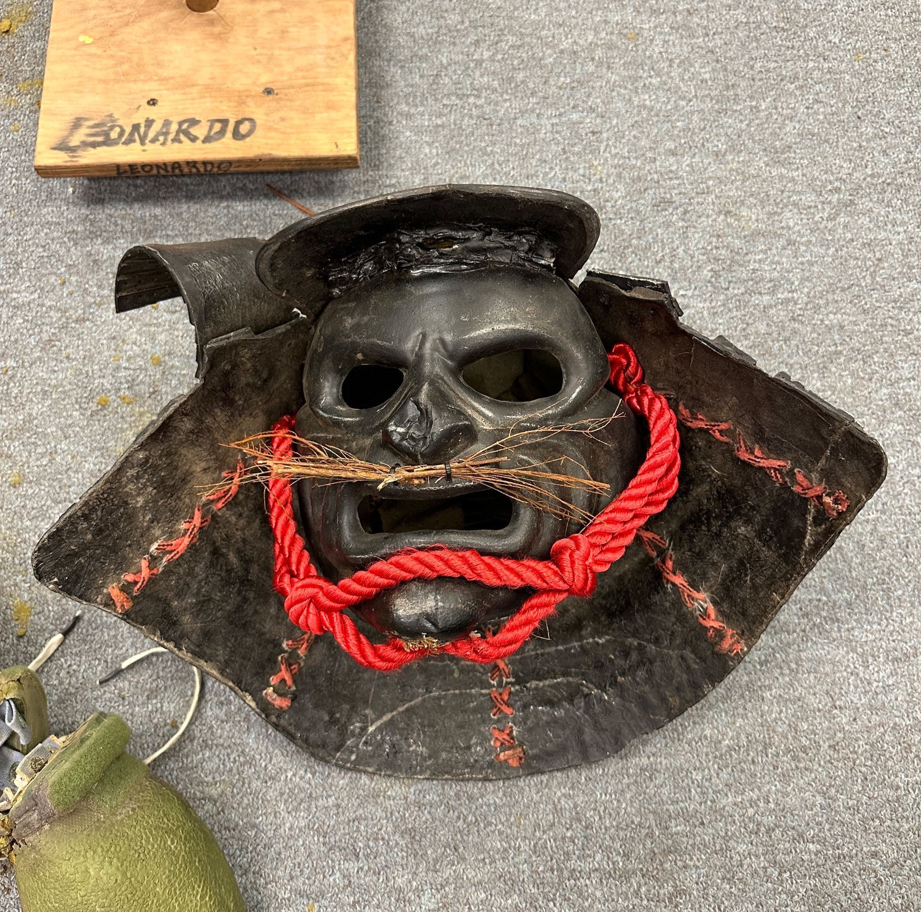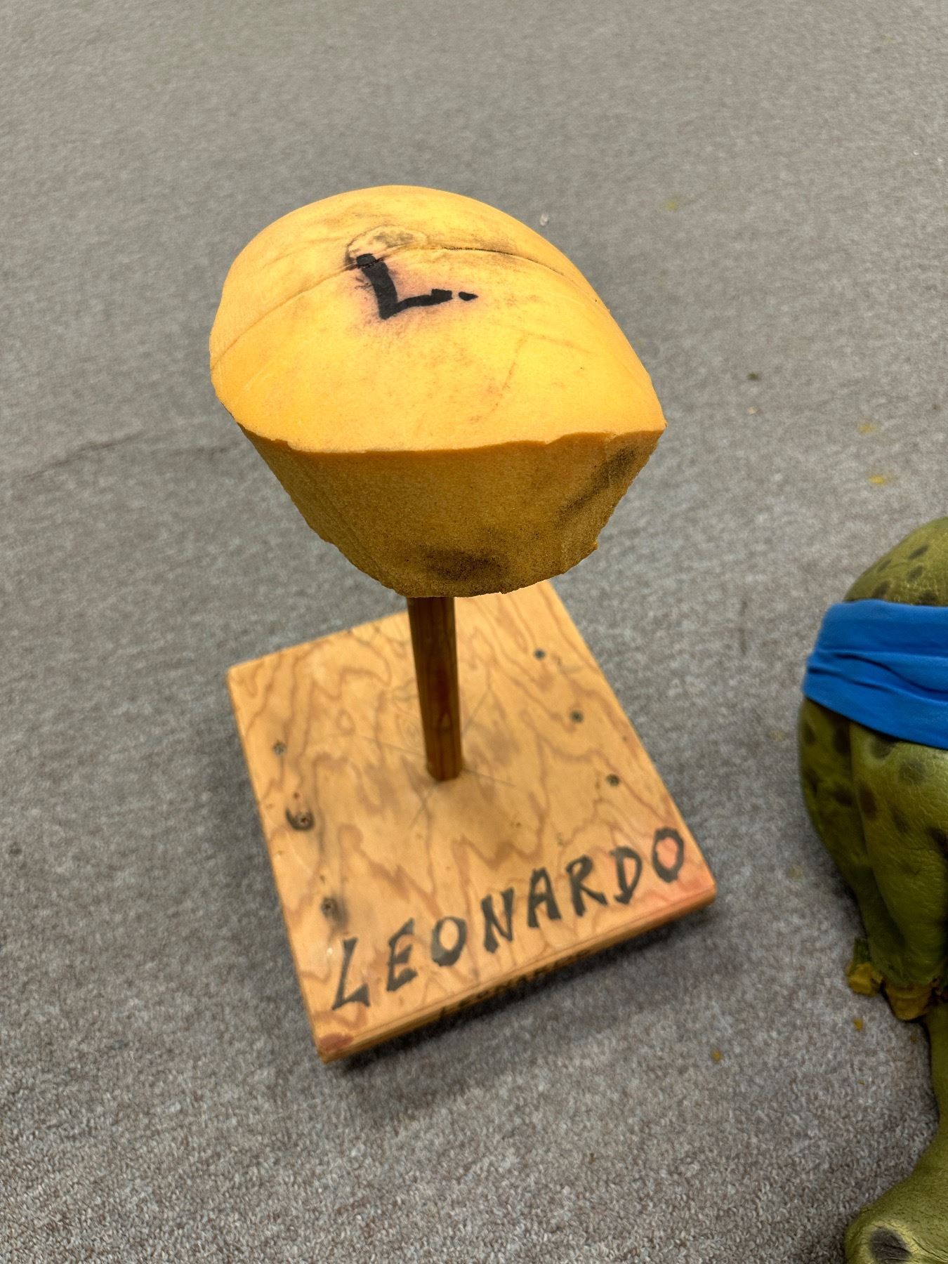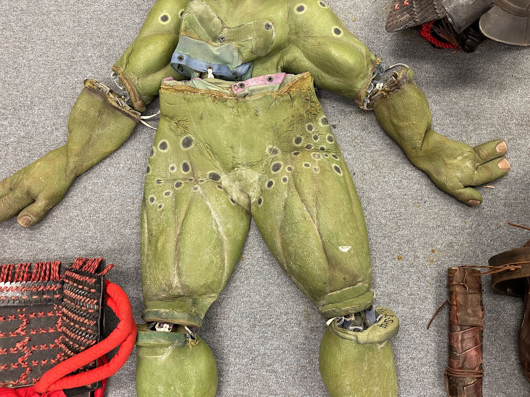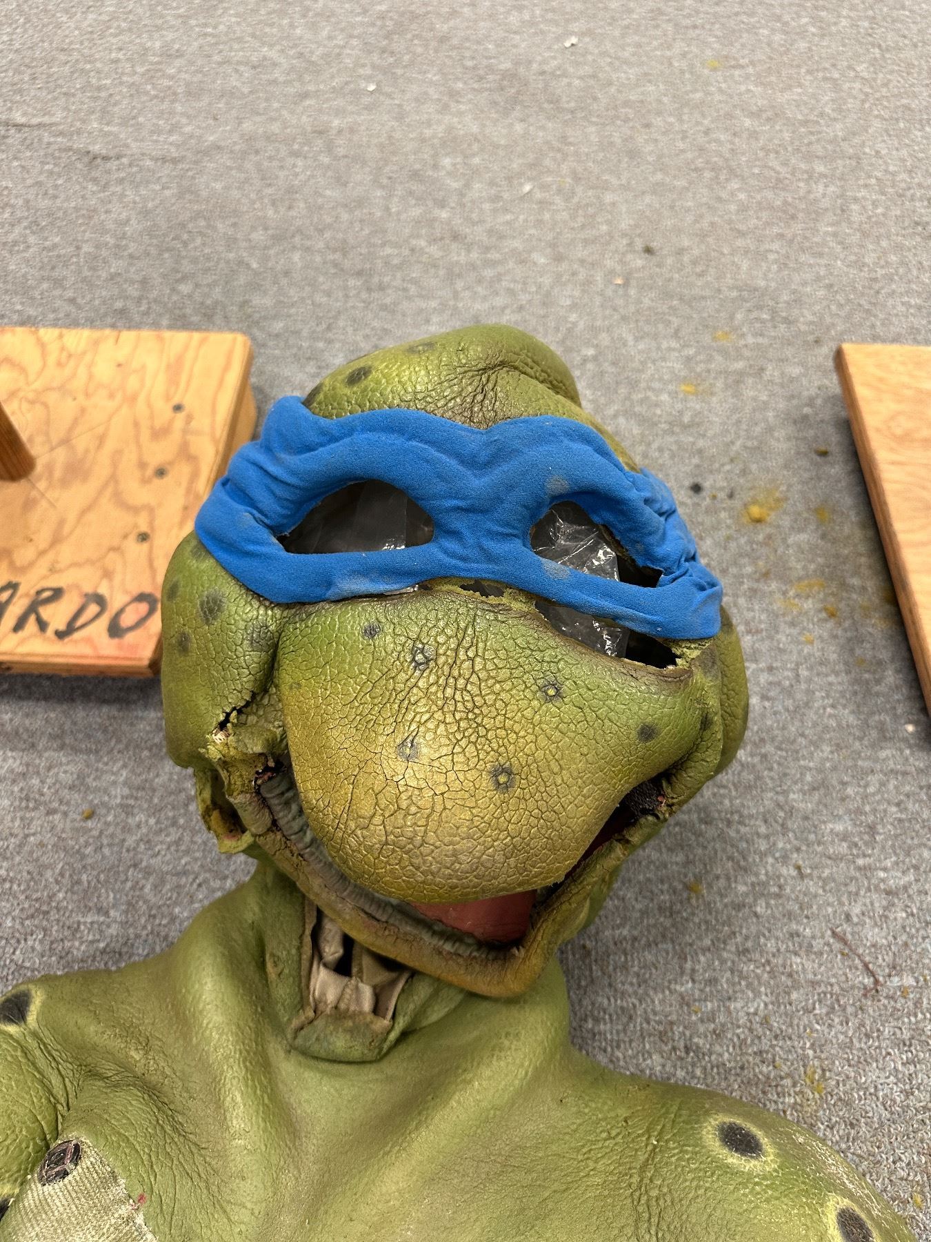 1993 "Teenage Mutant Ninja Turtles III" - Screen-worn Leonardo costume w/ Donatello pants - includes mask w/ stand/ samurai hat and mask w/ stand/ samurai armour belt/ shell/ torso/ pants (Donatello)/ pair of hands & pair of feet. This suit was screen-worn in Ninja Turtles 3 and later used in the Ninja Turtles TV Series.