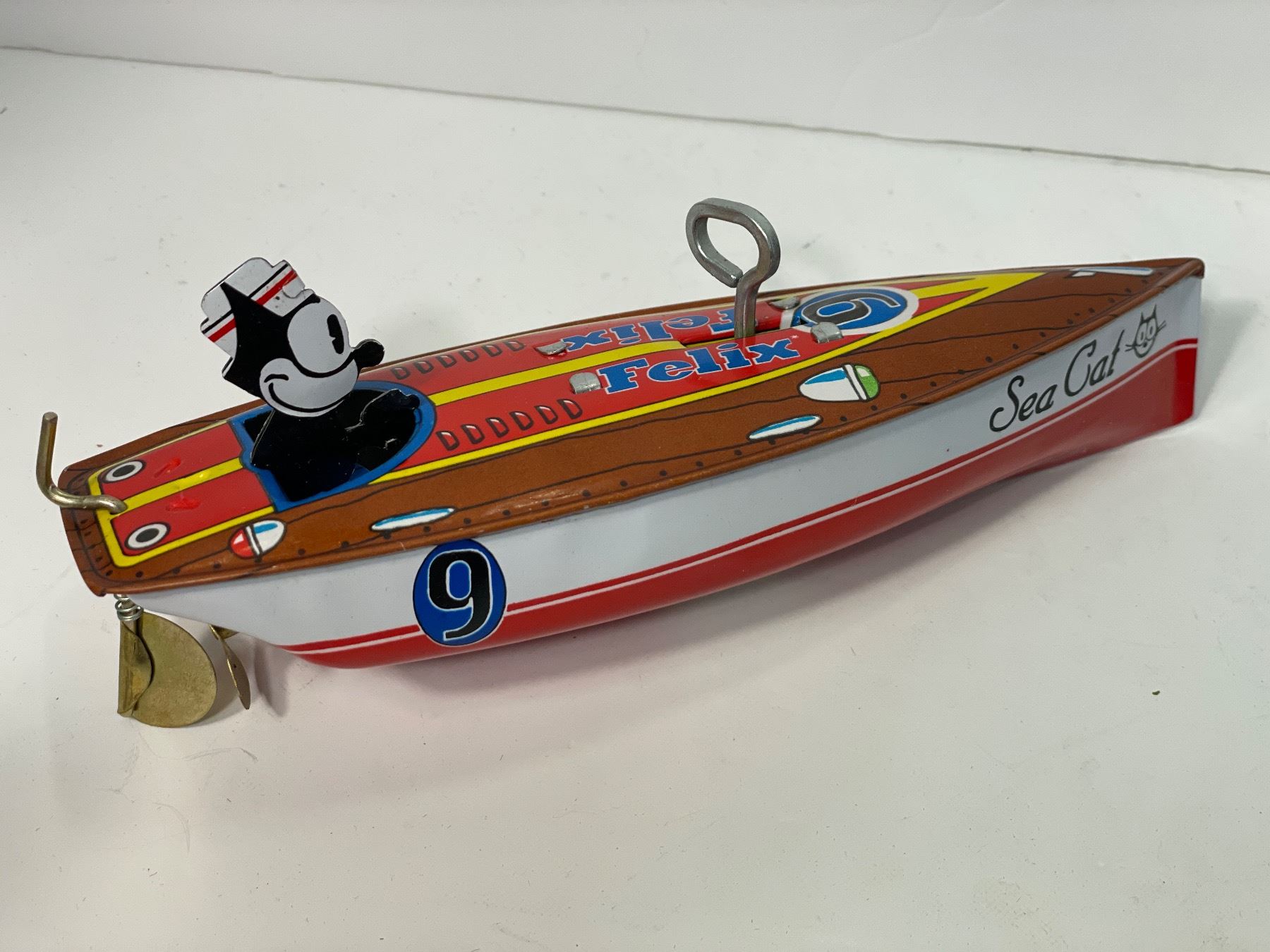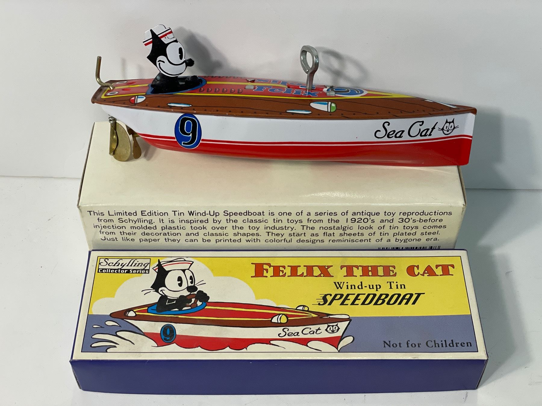1996 Schylling Felix The Cat Wind Up Tin Speed Boat, In Original Box