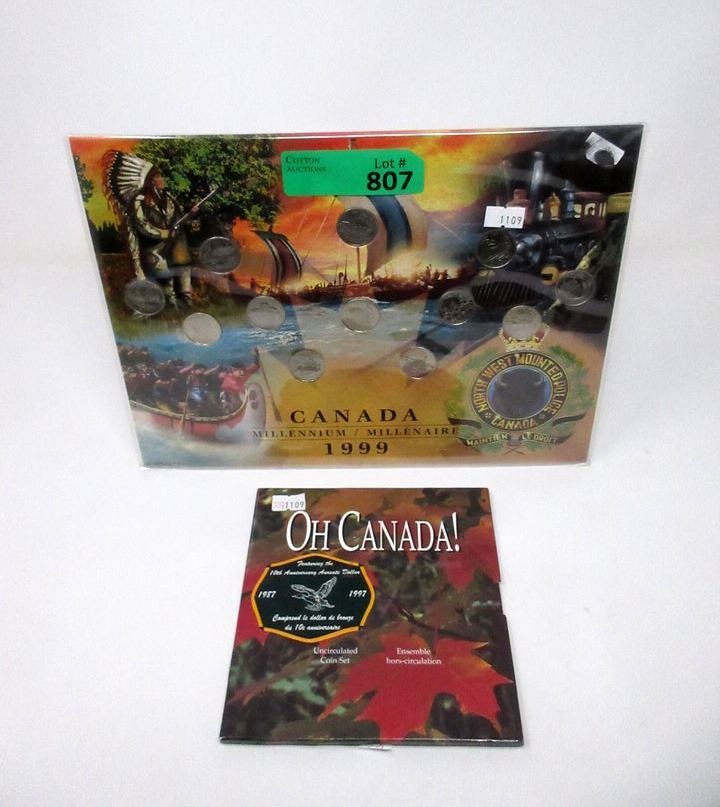 One 1997 Uncirculated Coin Set (Penny through Toonie with 10th anniversary Aureate dollar), and 1999 Millennium Quarter Set.