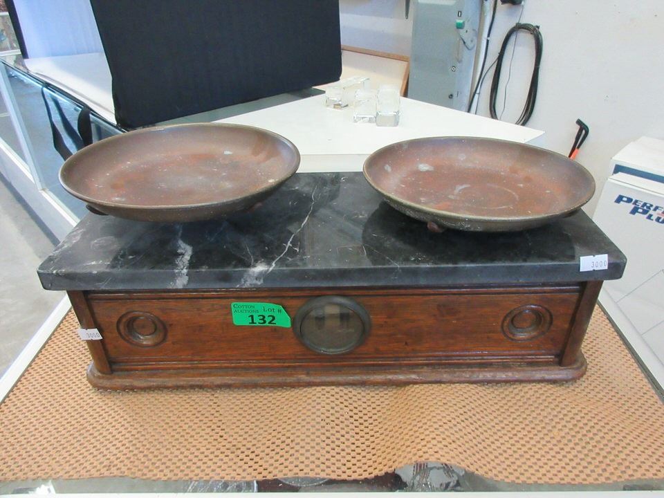 Oak case with marble top and copper scales. 8" x 19" x 8" tall.