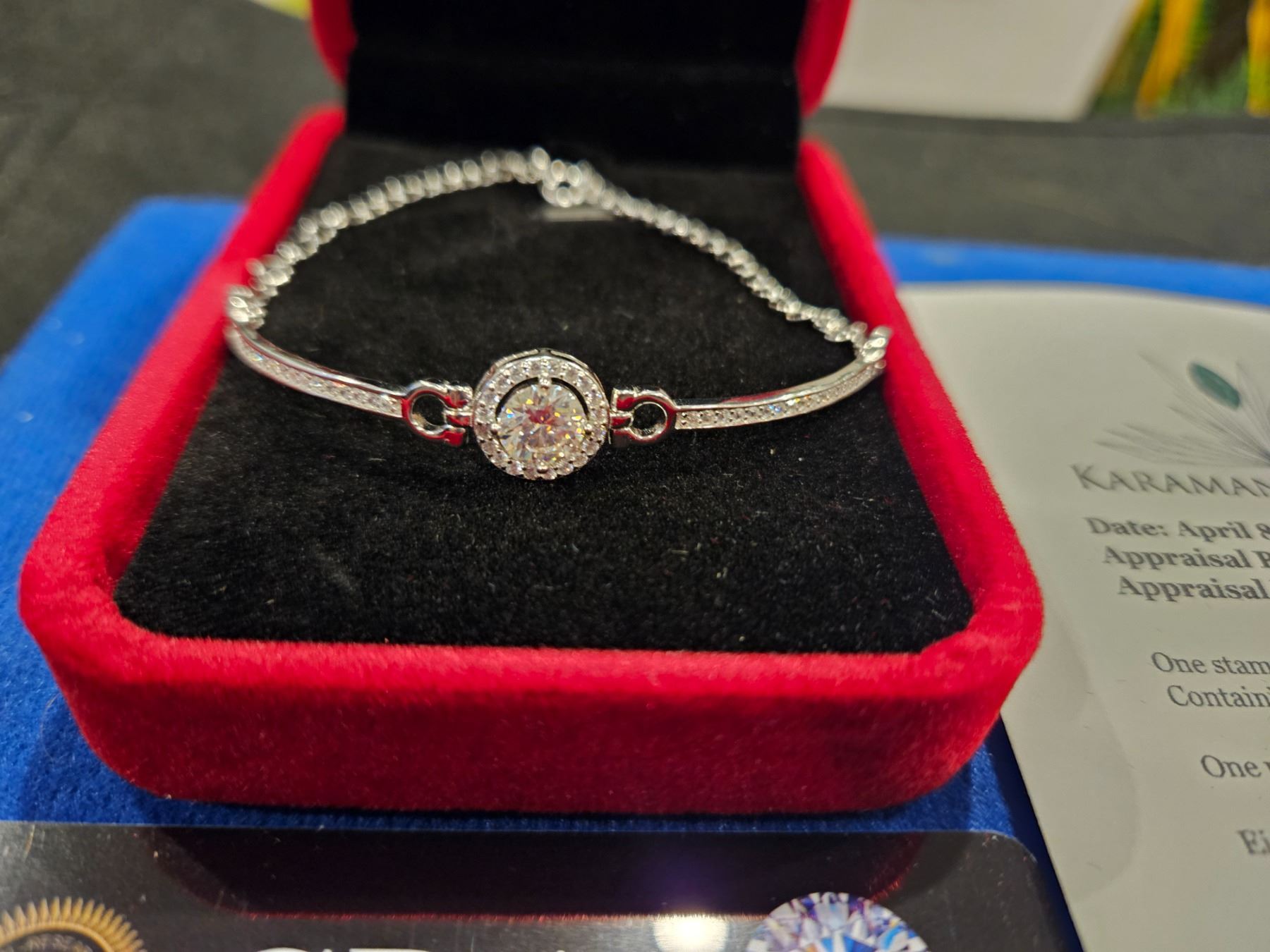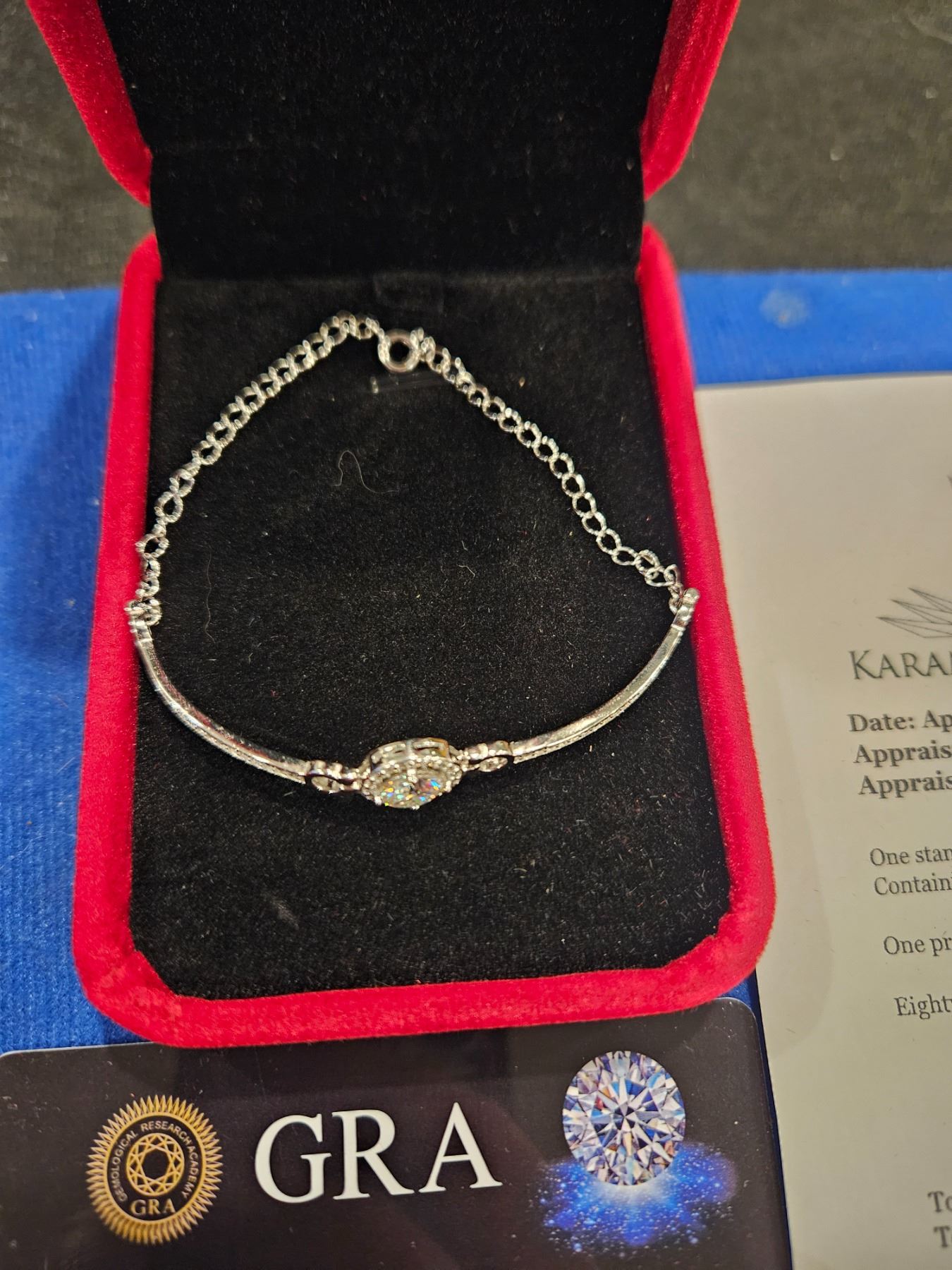 2.00 CT GRA CERTIFIED ROUND BRILLIANT CUT MOISSANITE STONE VVS D COLOR WITH 86 ROUND BRILLIANT CUT CUBIC ZIRCONIA SET IN ROUND HALO AND SOME IN ARMS SET IN 925 SILVER BRACELET RETAIL VALUE $1,140.00