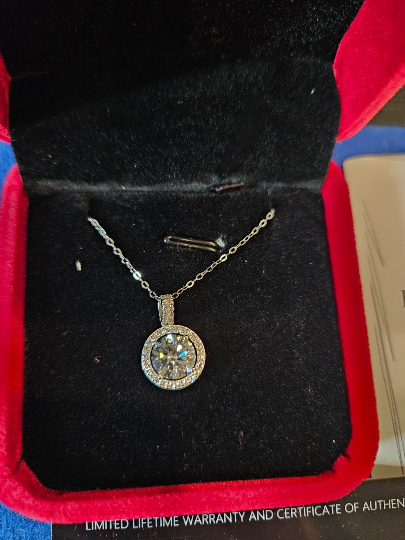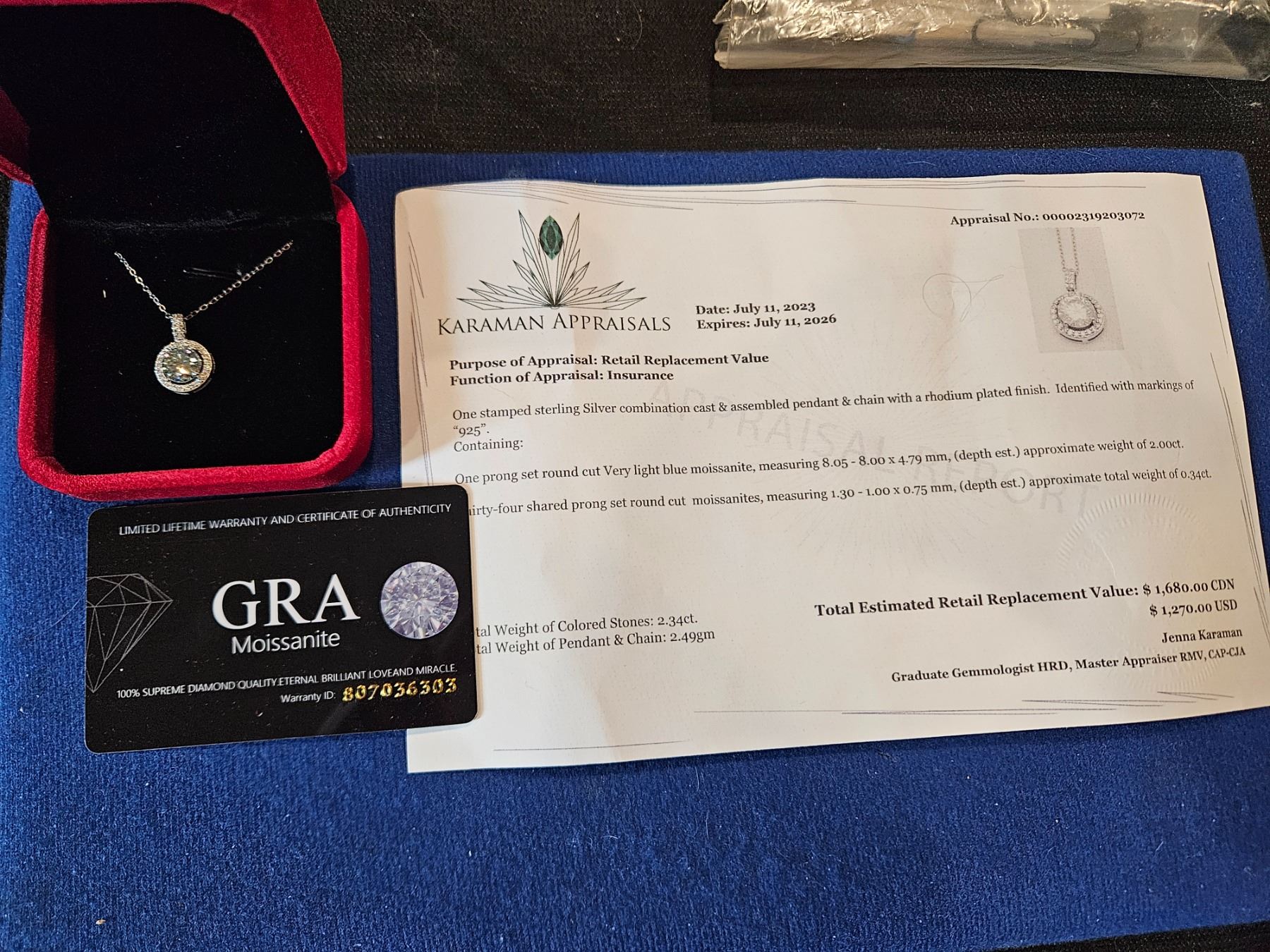 -2.00 CT GRA CERTIFIED ROUND BRILLIANT CUT MOISSANITE STONE VVS D COLOR WITH 34 ROUND BRILLIANT CUT CUBIC ZIRCONIA SET IN ROUND HALO AND SOME IN BALE SET IN 925 SILVER PENDANT RETAIL VALUE $1,680.00