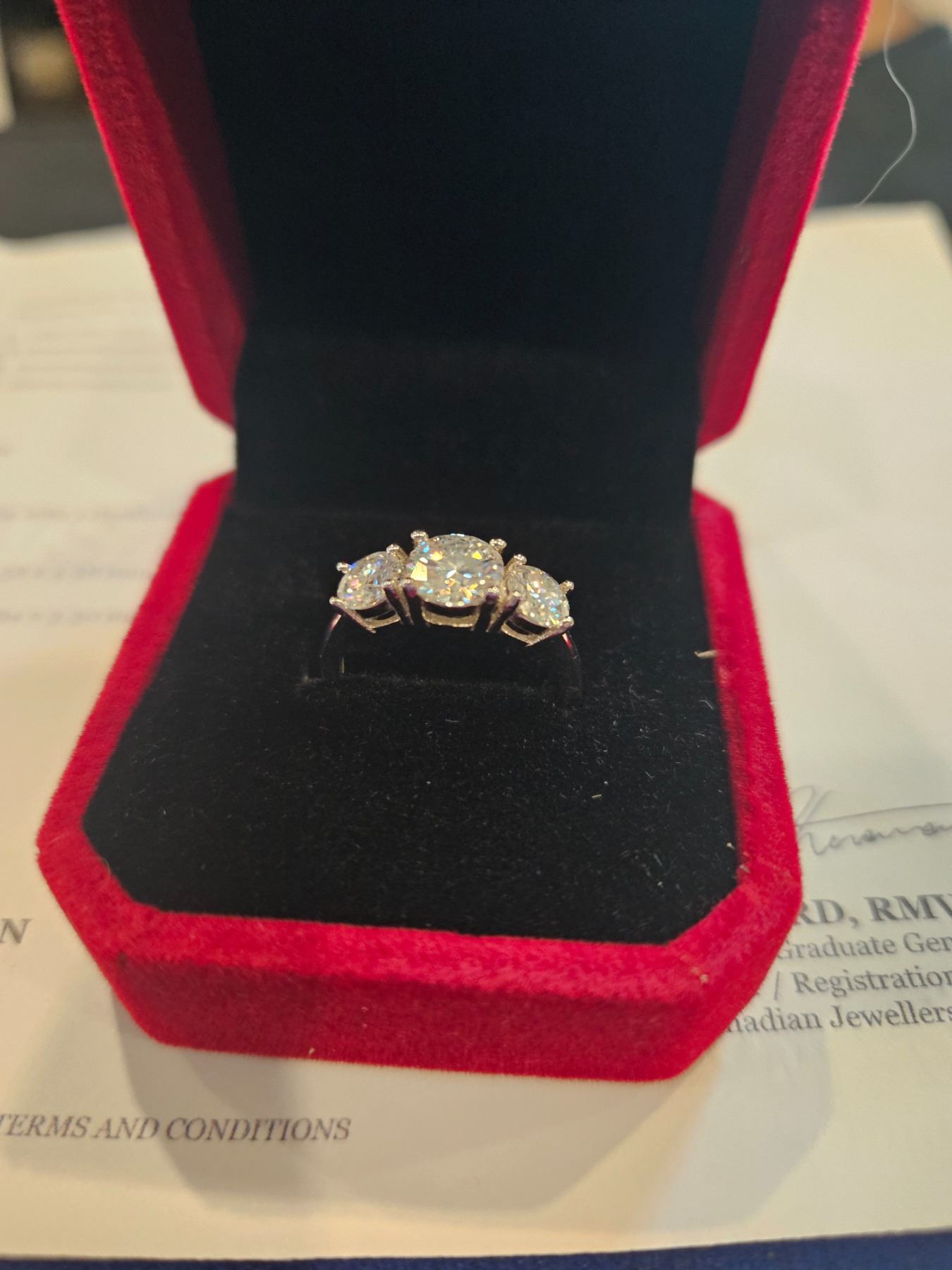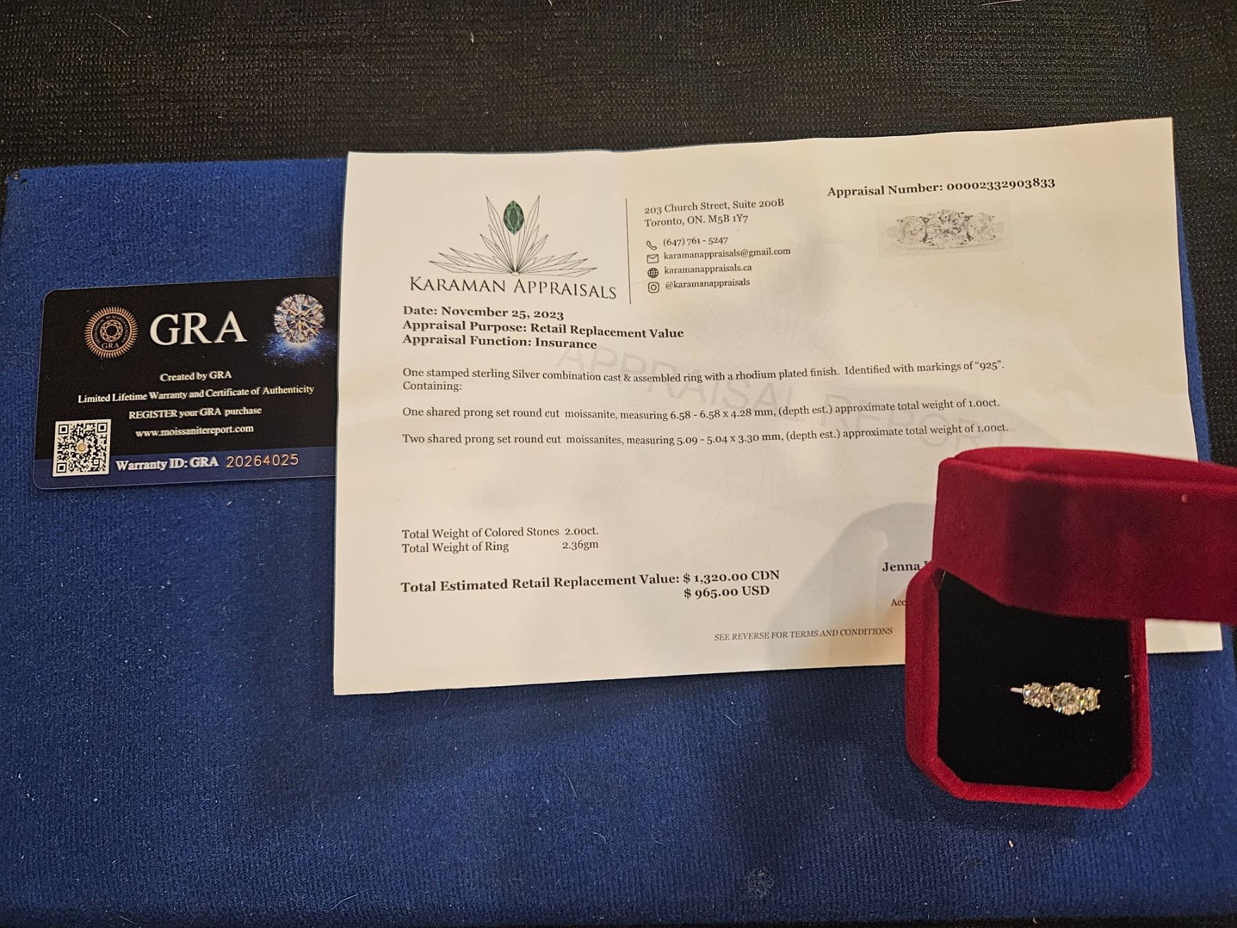 2.00 CT TW GRA CERTIFIED ROUND BRILLIANT CUT MOISSANITE STONES VVS D COLOR WITH 1.00 CT SET IN CENTER WITH 0.50 CT SET ON EITHER SIDE SET IN 925 SILVER RING SIZE 5 RETAIL VALUE $1,320.00