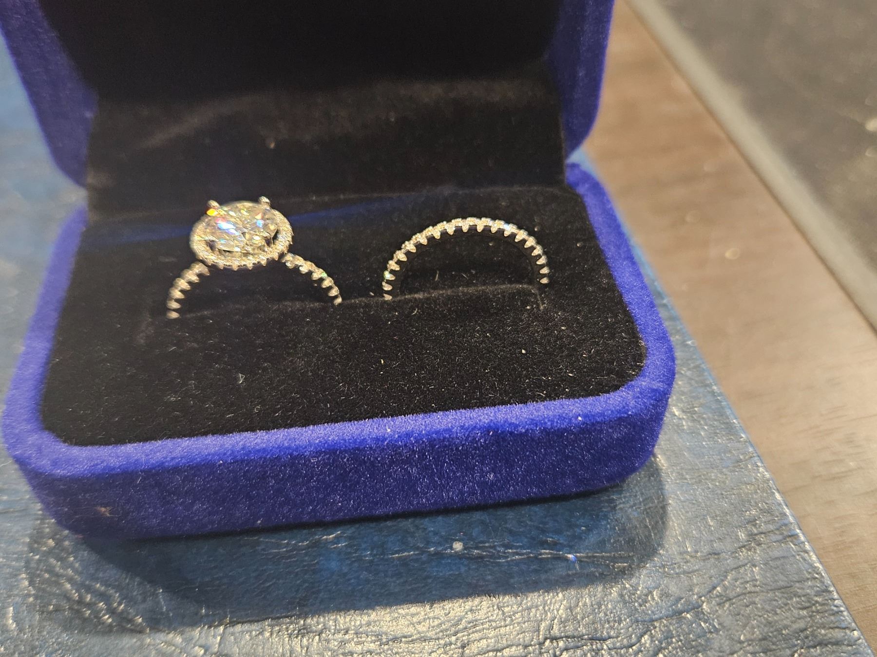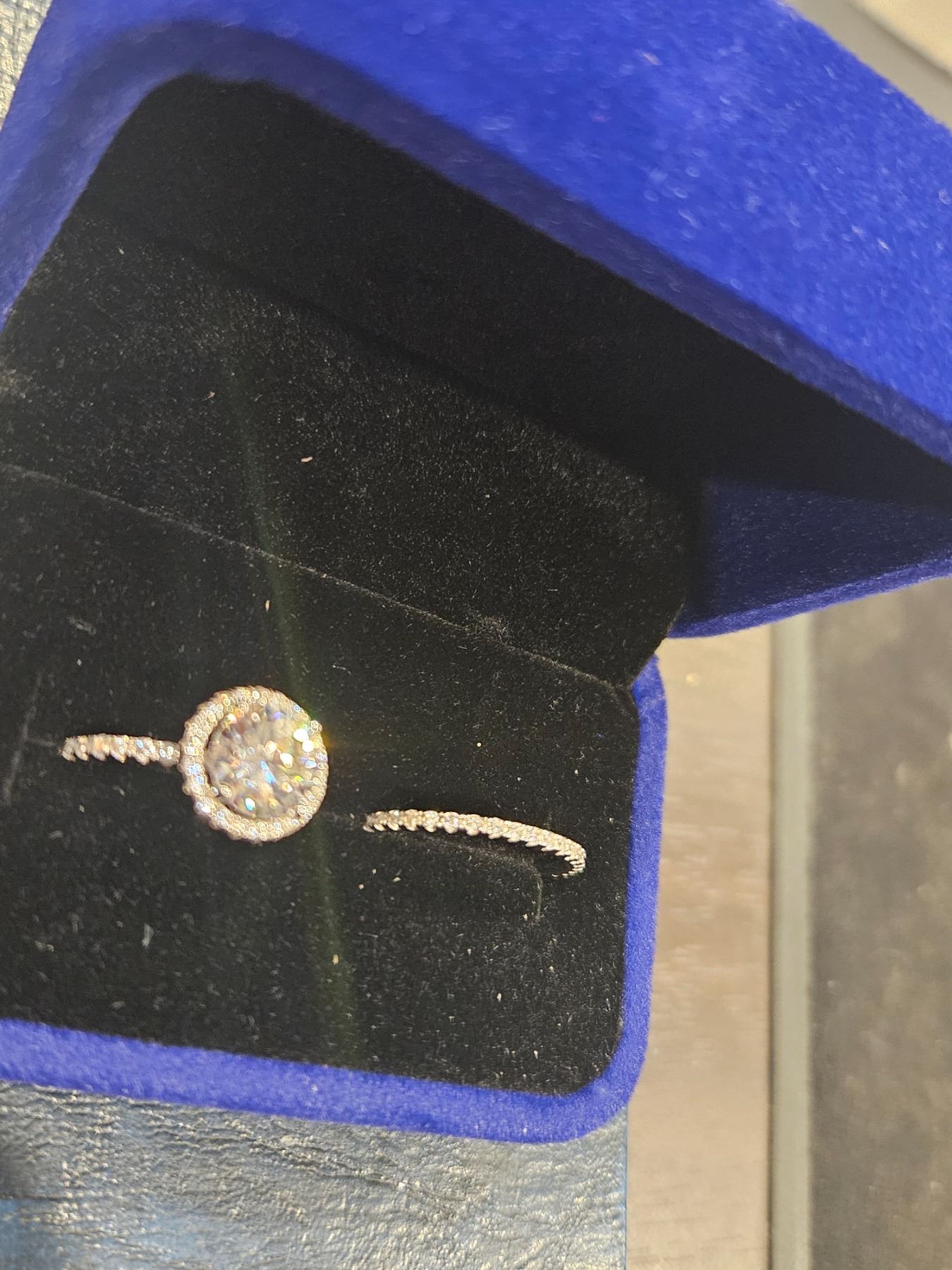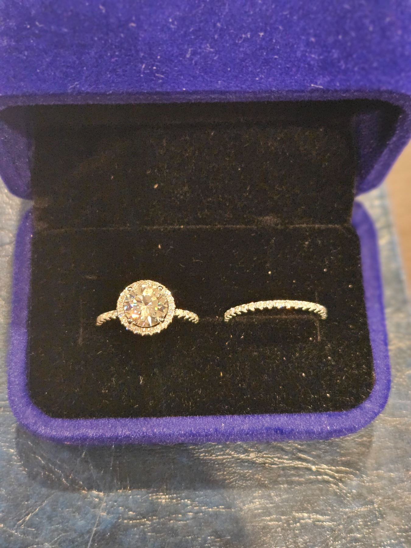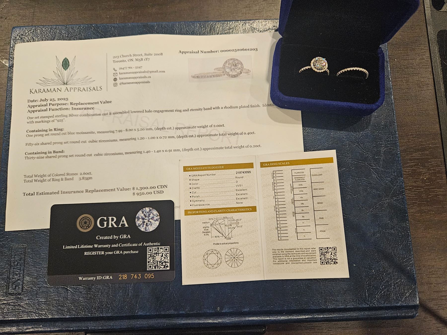 2.00 CT GRA CERTIFIED ROUND BRILLIANT CUT MOISSANITE STONE VVS D COLOR WITH 56 ROUND BRILLIANT CUT CUBIC ZIRCONIA SET IN ROUND HALO AND AROUND THE SHANK WITH 39 ROUND BRILLIANT CUT CUBIC ZIRCONIA SET IN SHANK IN WEDDING RING SET IN 925 SILVER RINGS SIZE 6.25 RETAIL VALUE $1,300.00