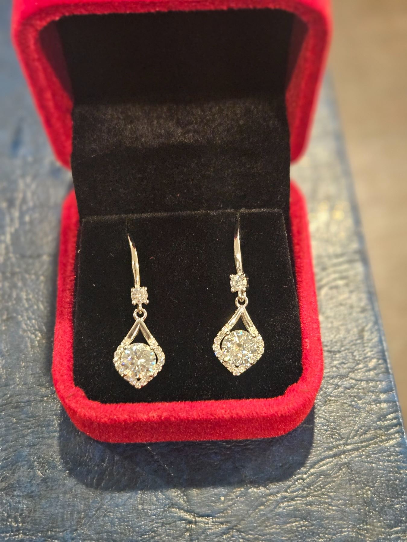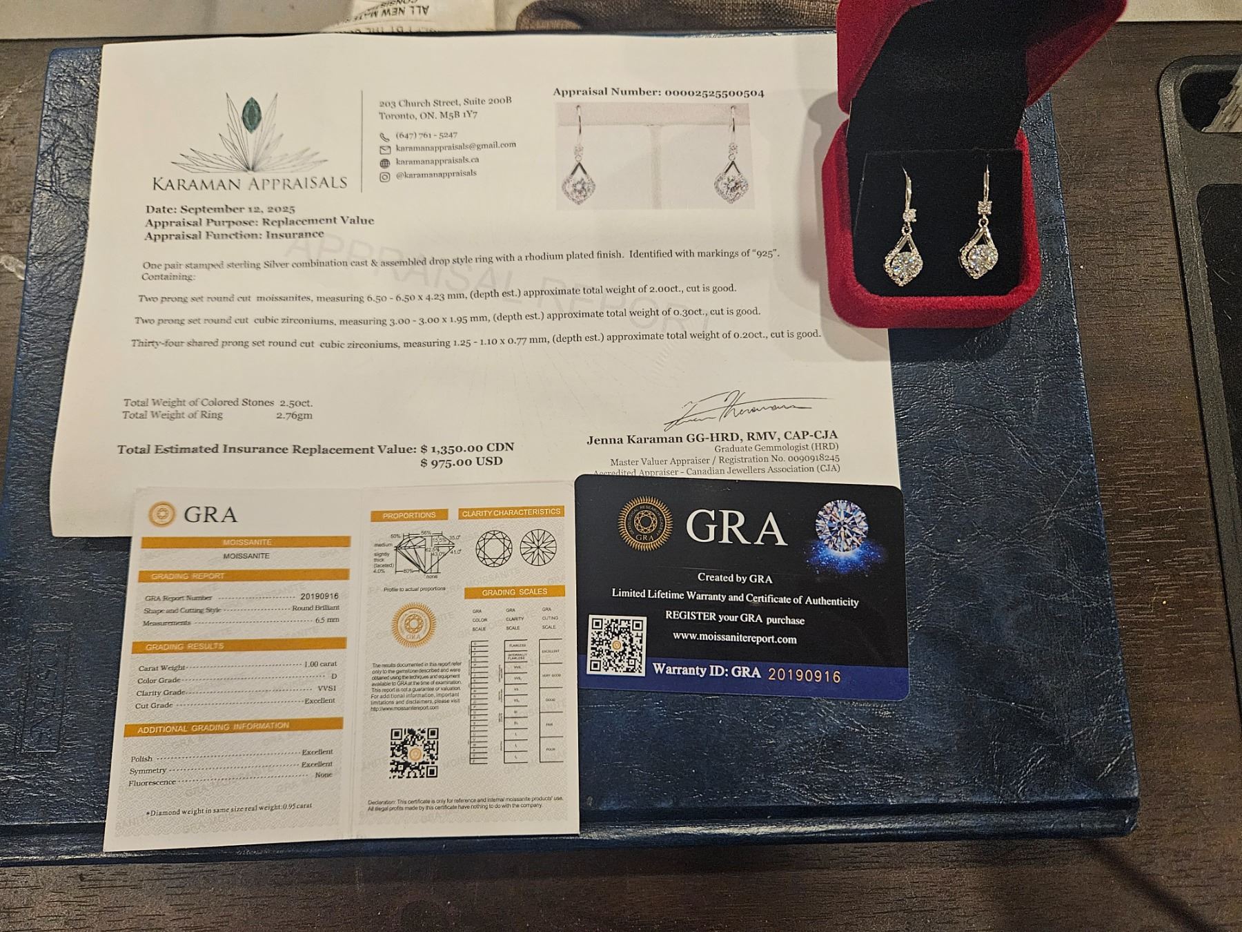 2.00 CT GRA CERTIFIED ROUND BRILLIANT CUT MOISSANITE STONE VVS D COLOR WITH 34 ROUND BRILLIANT CUT CUBIC ZIRCONIA SET IN TEAR DROP HALOS SET IN 925 SILVER EARRINGS RETAIL VALUE $1,350.00