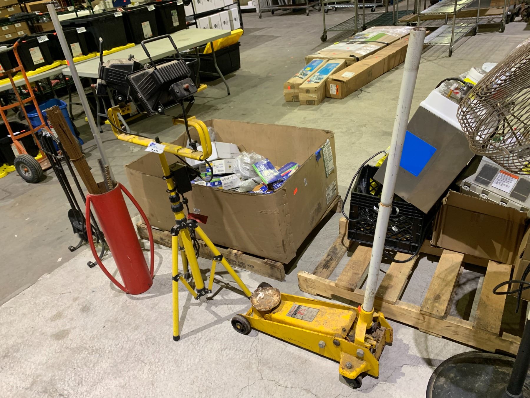 2-1/4 TON FLOOR JACK, TRIPOD WORK LIGHT & METAL CONTAINER WITH ASSORTED CONTENTS