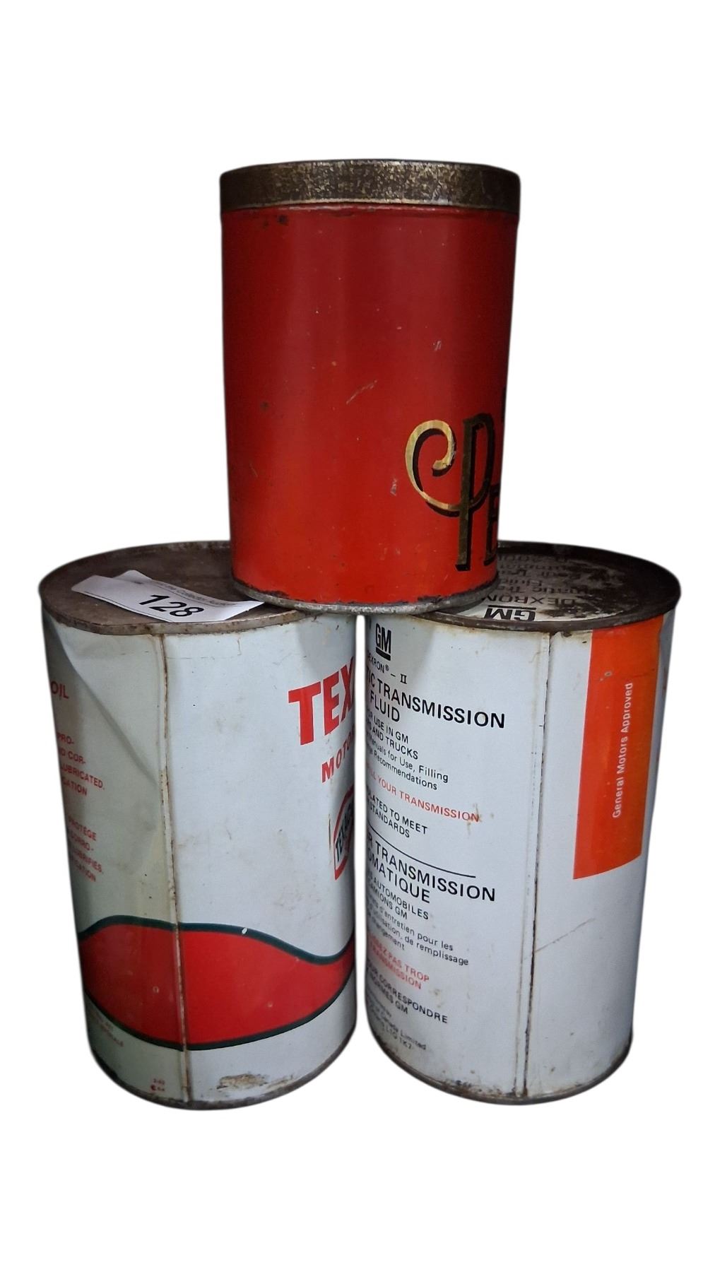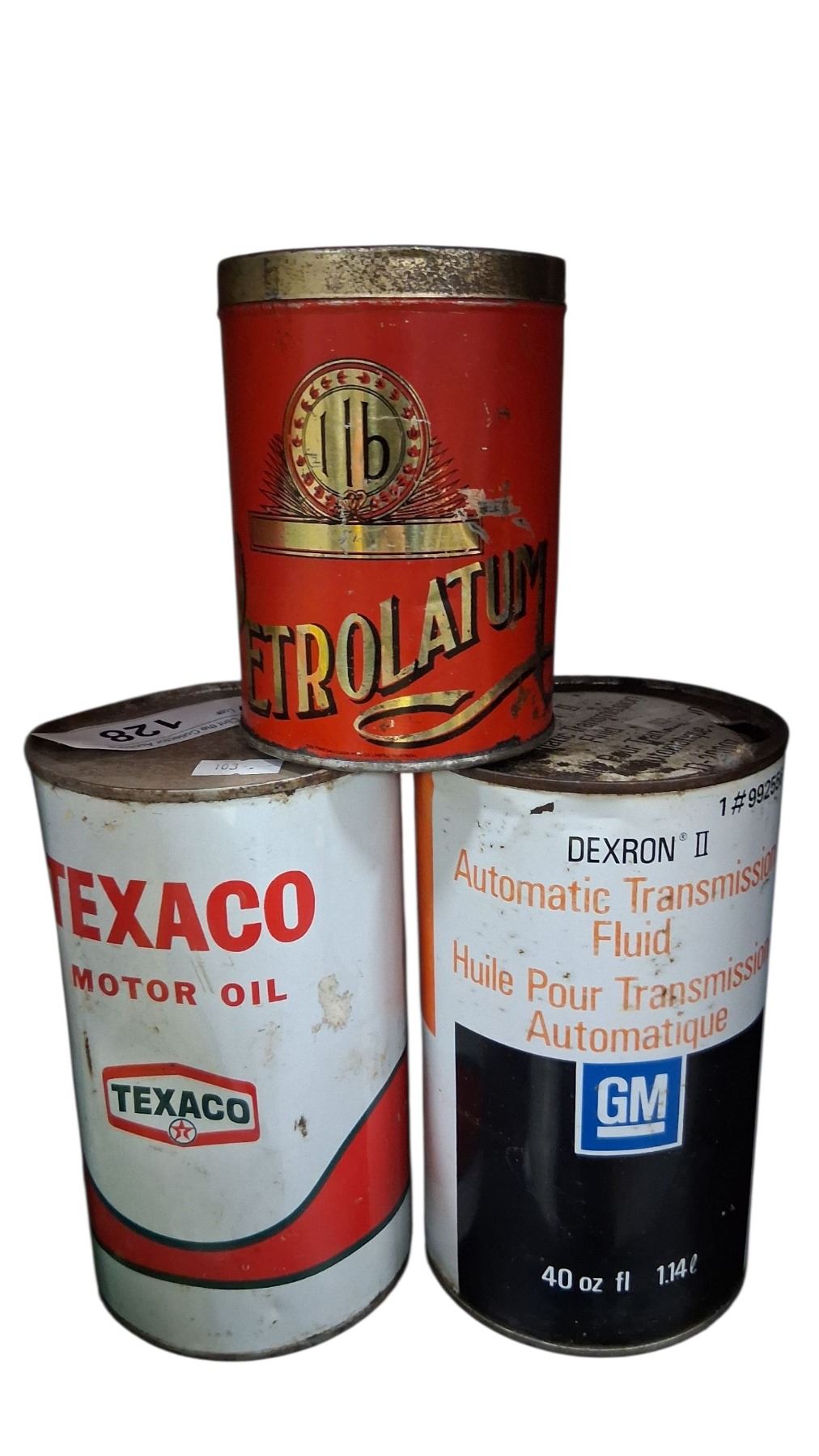 2 1 quart oil tins Texaco & GM, and 1 one pound petroleum tin