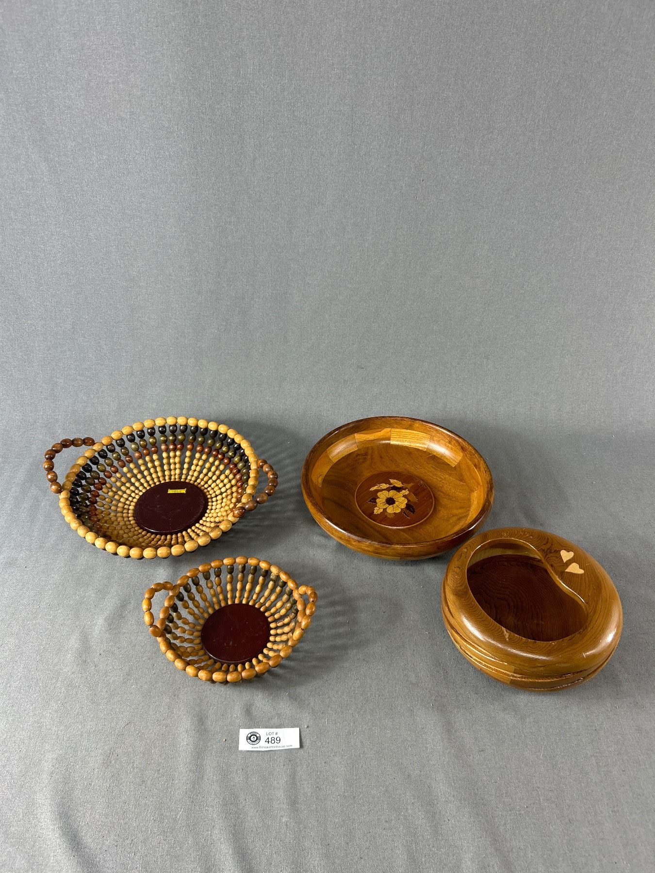 2 1950's Canadian Wood Bead Baskets & 2 Hand Carved Enlayed Wood Bowls Including Canadian Dogwood