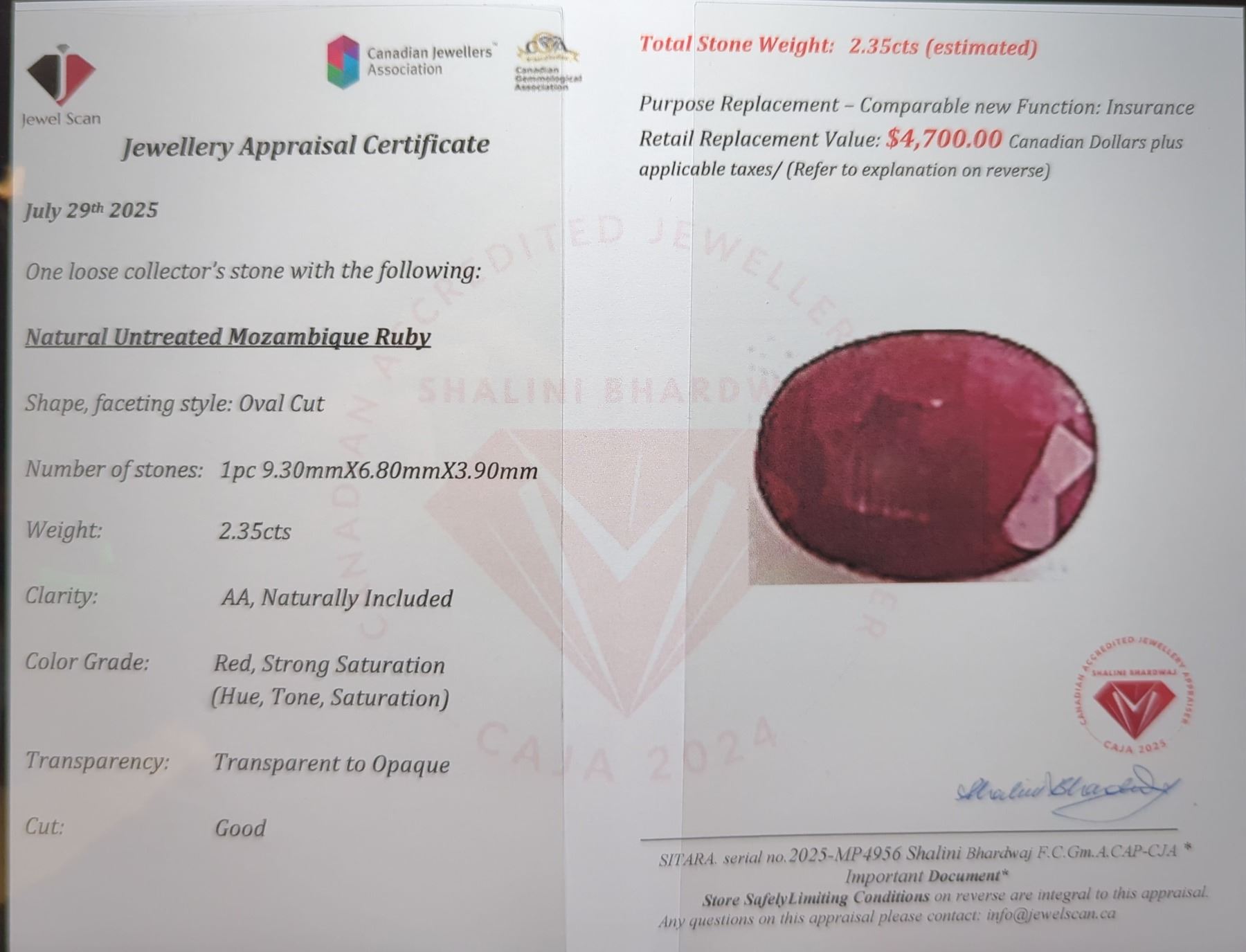 2.35 CT CERTIFIED RED RUBY GEMSTONE ($4,700 APPRAISAL, APPRAISAL NOT GUARANTEED)