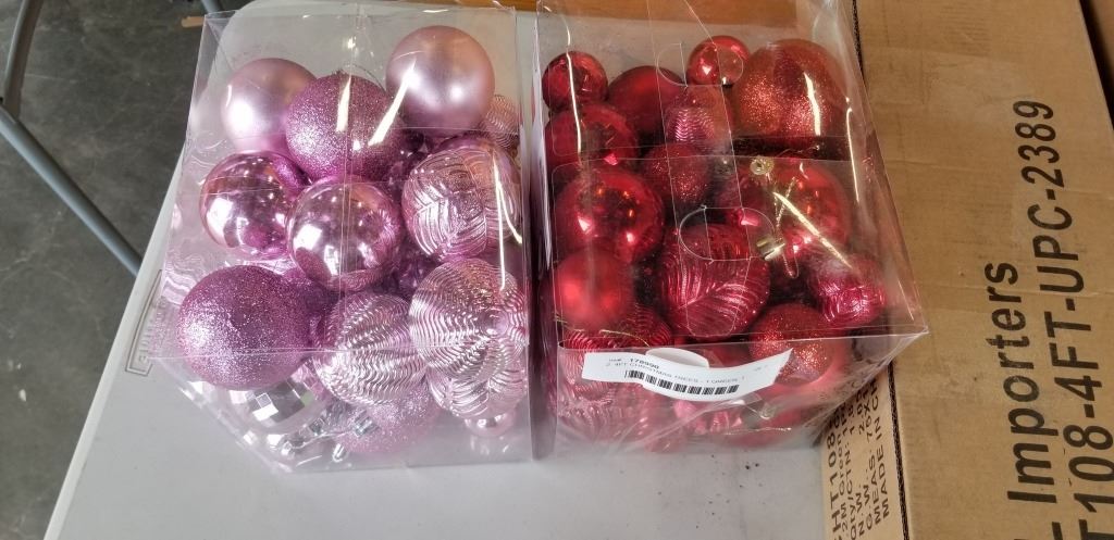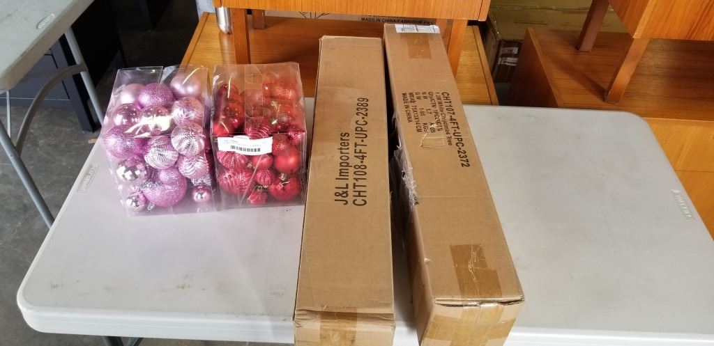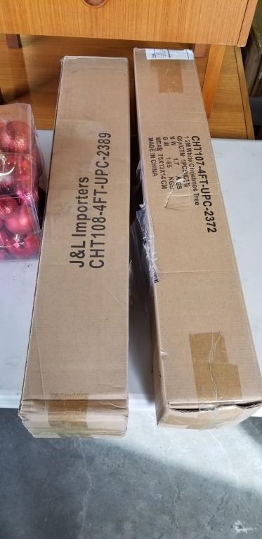 2 4FT CHRISTMAS TREES - 1 GREEN, 1 WHITE AND 2 CHRISTMAS ORNAMENT PACKS