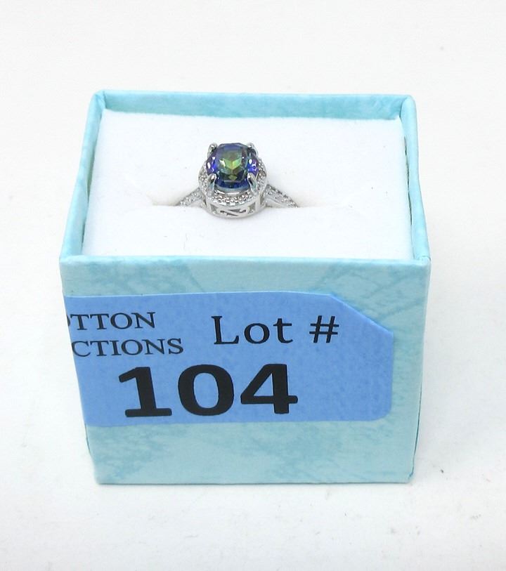 7 x 9 mm topaz with 2 diamonds. Set in sterling silver. Includes $275 certificate.