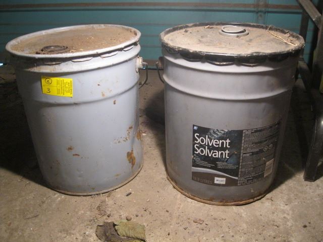 2 - 5 GALLON CANS OF SOLVENT, 1 HALF FULL