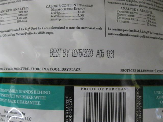 2 - 5 LB BAGS OF FROMM DUCK ALA VEG CAT FOOD (OUTDATED)