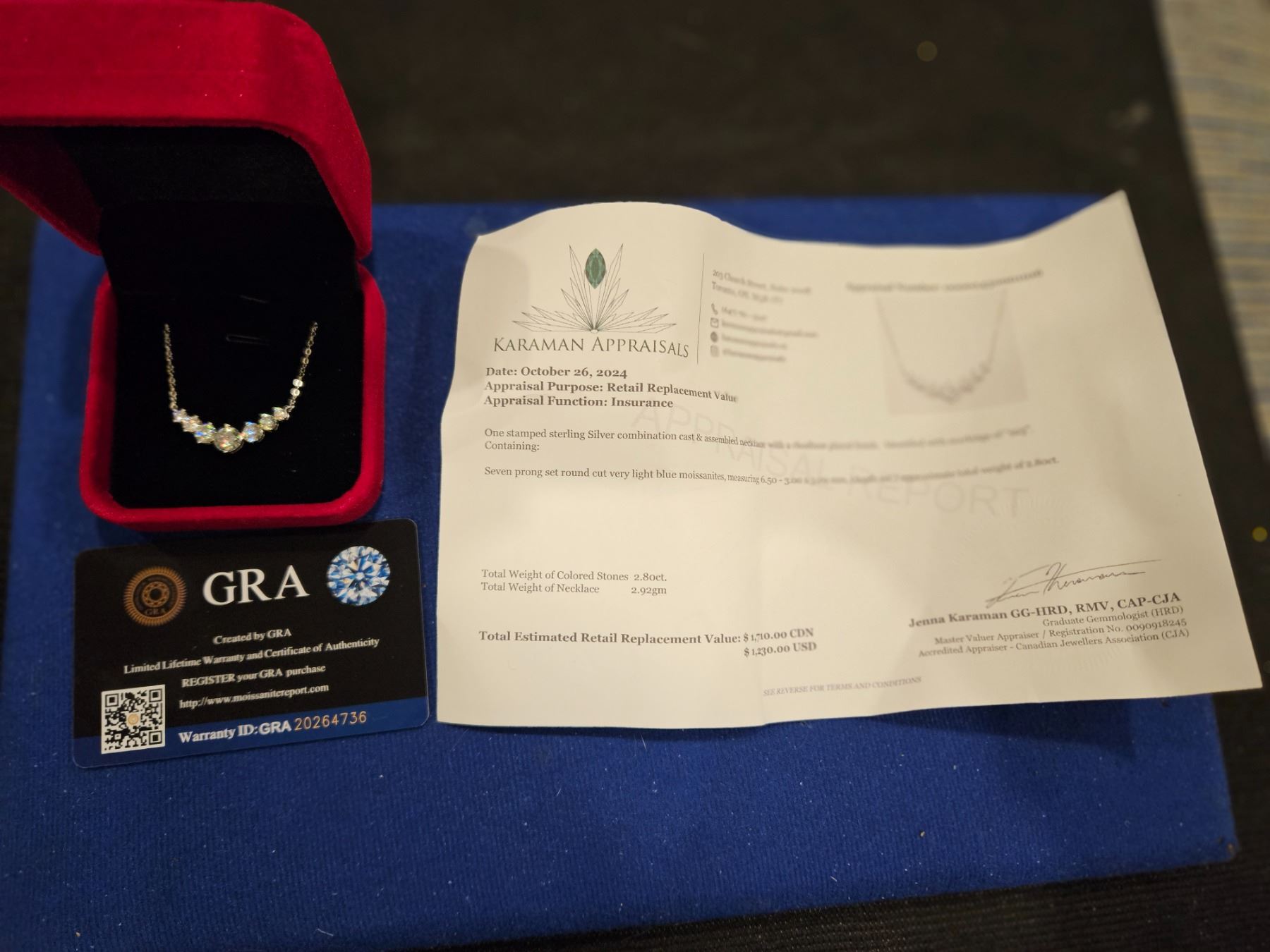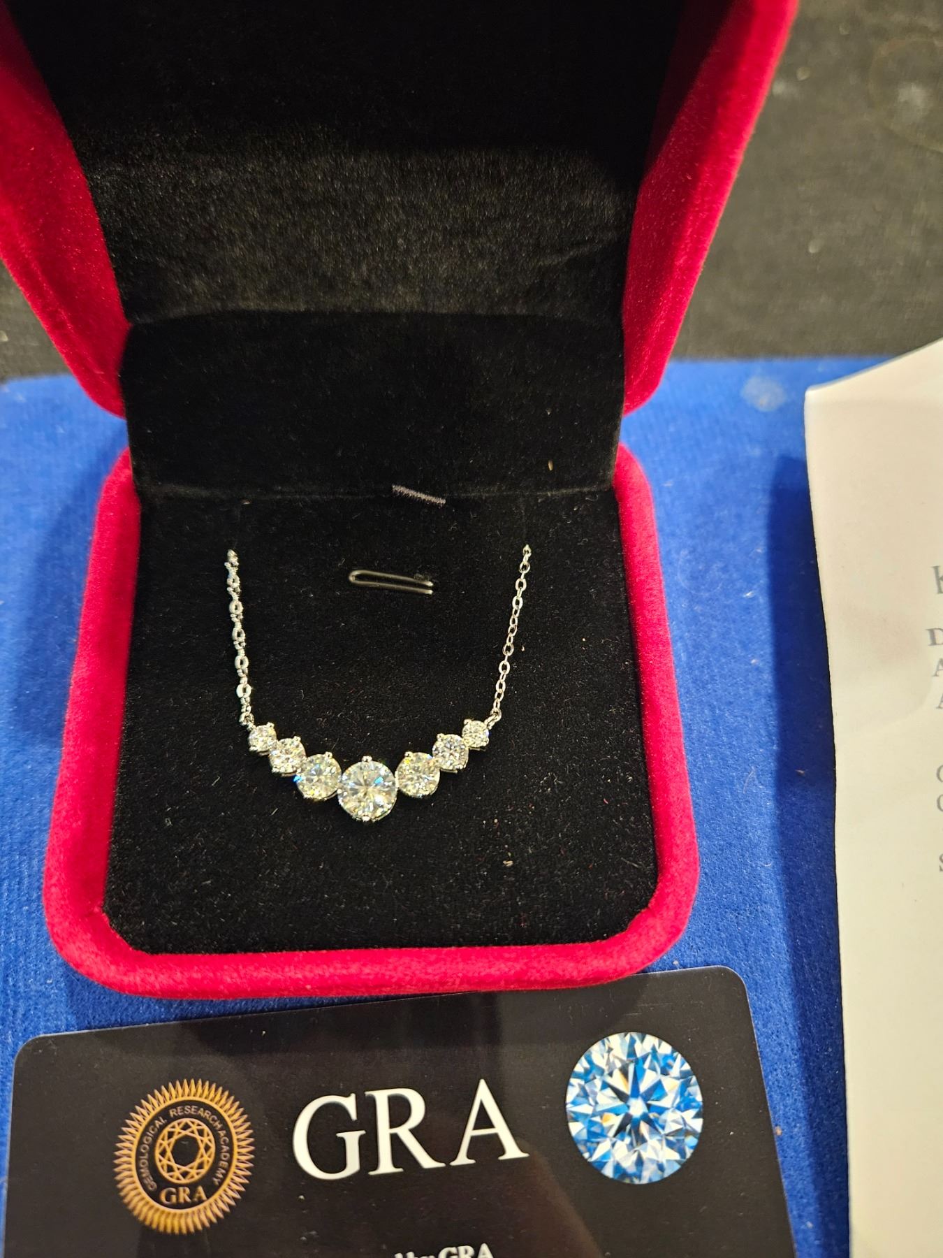 2.80 CT TW GRA CERTIFIED ROUND BRILLIANT CUT MOISSANITE STONES VVS D COLOR SET WITH LARGER MOISSANITE SET IN CENTER WITH GRADUATING DOWN IN SIZE ON EITHER SIDE SET IN 925 SILVER PENDANT RETAIL VALUE $1,710.00