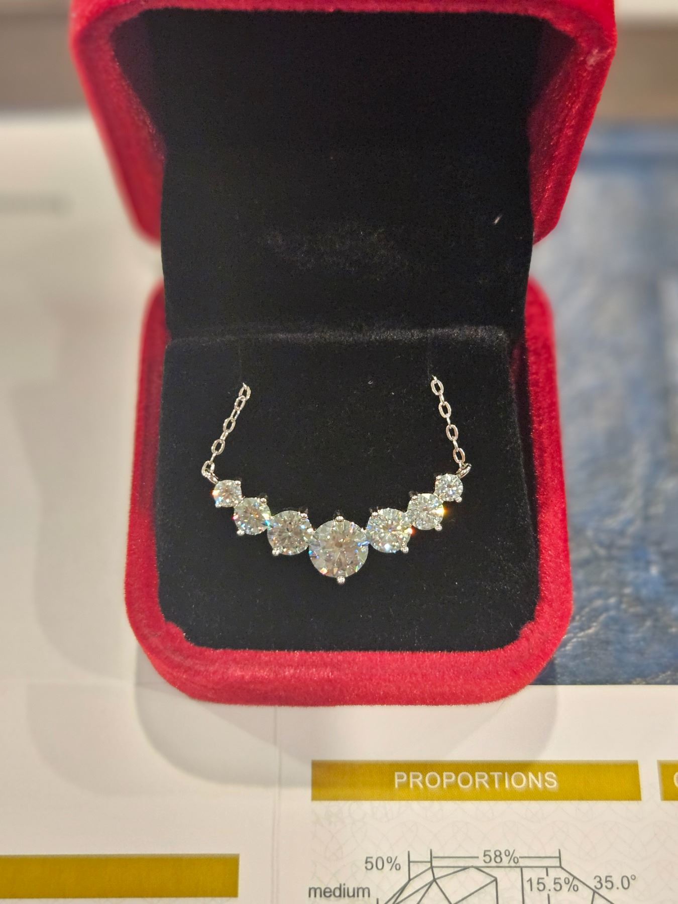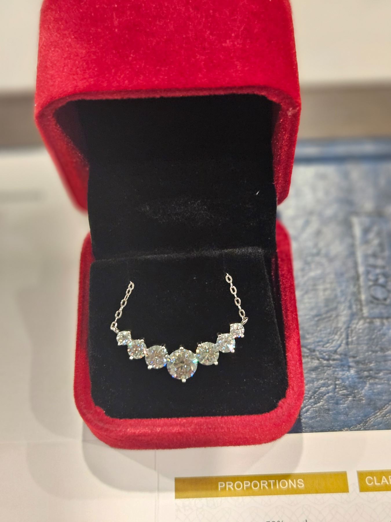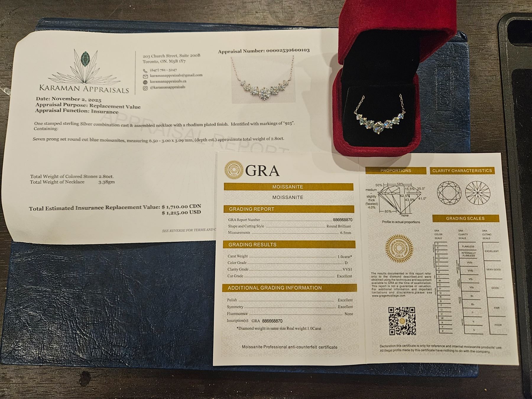 2.80 CT TW GRA CERTIFIED ROUND BRILLIANT CUT MOISSANITE STONES VVS LIGHT BLUE COLOR SET WITH LARGER IN CENTER AND 3 GRADUATING DOWN IN SIZE ON EITHER SIDE SET IN 925 SILVER PENDANT RETAIL VALUE $1710.00