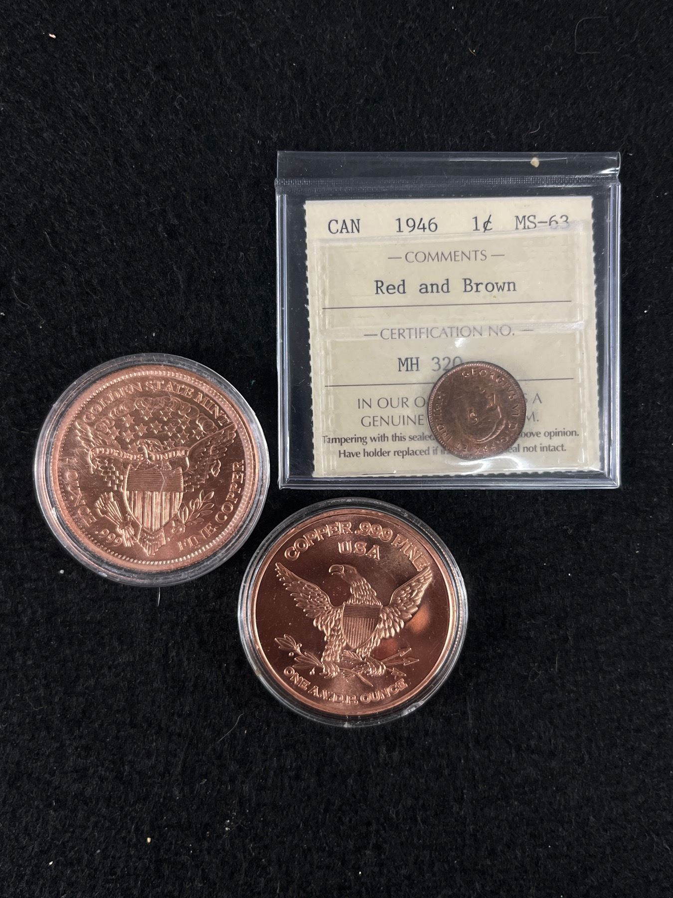 2 - .999 Fine Copper US Coins In Acrylic Coin Holder Plus ICCS 1946 Canada Penny