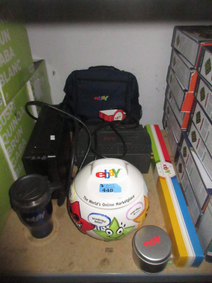 ebay Cookie jar (9" tall at top of lid), ebay watch in tin, ebay umbrella, ebay thermal travel mug & ebay laptop bag. Includes a APC Back-UPS Pro 700 & APC battery back up plus surge protection.