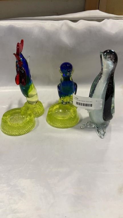 2 ART GLASS ASH TRAYS, DOG AND ROOSTER AND ART GLASS PENGUIN